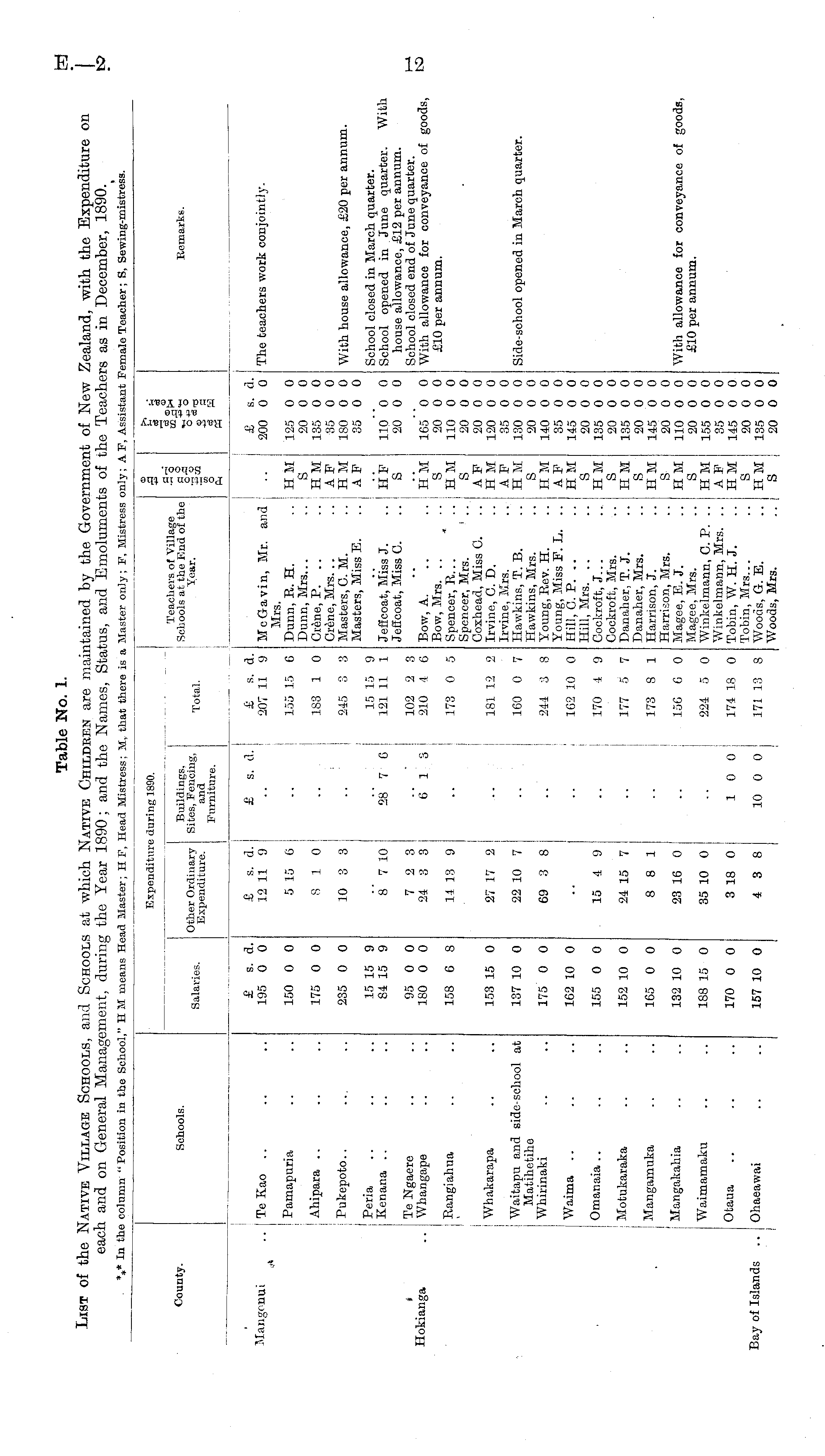 Table No. 1. List of the Native Village Schools, and Schools at which Native Children are maintained by the Government of New Zealand, with the Expenditure on each and on General Management, during the Year 1890; and the Names, Status, and Emoluments of the Teachers as in December, 1890.
