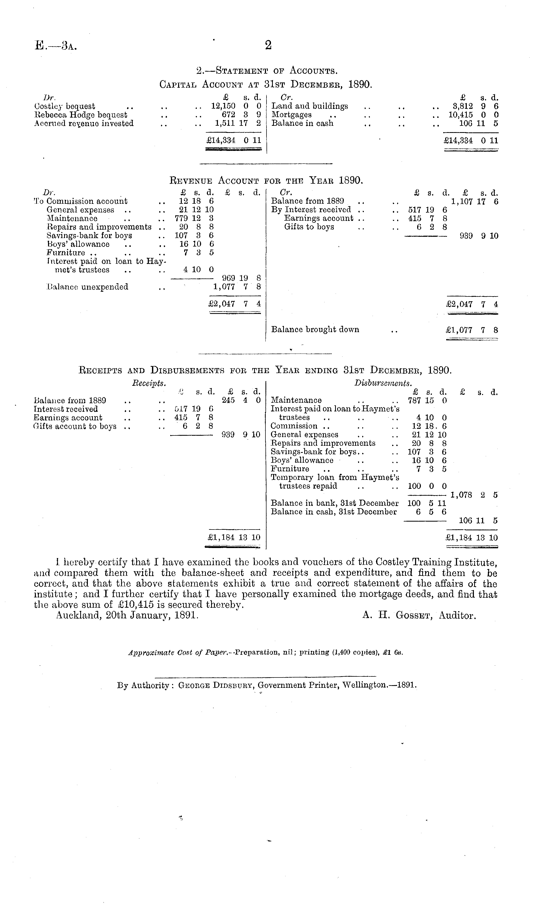 Receipts and Disbubsements fob the Yeae ending 31st Deoembee, 1890. Receipts. Disbursements. 3 s. d. & s. d. £ s. d. £ s. d. Balance from 1889 .. .. 245 4 0 Maintenance .. .. 787 15 0 Interest received .. .. £U7 19 6 Interest paid on loan to Haymet's Earnings account .. ~ 415 7 8 trustees .. .. .. 410 0 Gifts account to boys .. .. 6 2 8 Commission .. .. .. 12 18. 6 939 910 General expenses .. .. 21 12 10 Repairs and improvements .. 20 8 8 Savings-bank for boys.. .. 107 3 G Boys' allowance .. .. 16 10 6 Furniture .. .. .. 7 3 5 Temporary loan from Haymet's trustees repaid .. .. 100 0 0 ■ 1,078 2 5 Balance in bank, 31st Deeomber 100 5 11 Balance in cash, 31st December 6 5 6 106 11 5 £1,184 13 10 £1,184 13 10 1 hereby certify that I have examined the books and vouchers of the Costley Training Institute, and compared them with the balance-sheet and receipts and expenditure, and find them to be correct, and that the above statements exhibit a true a.nd correct statement of the affairs of the institute ; and I further certify that I have personally examined the mortgage deeds, and find that the above sum of £10,415 is secured thereby. Auckland, 20th January, 1891. A. H. Gosset, Auditor. Approximate Cost of Paper.- -Preparation, nil; printing (1,400 copies), £1 Gs.