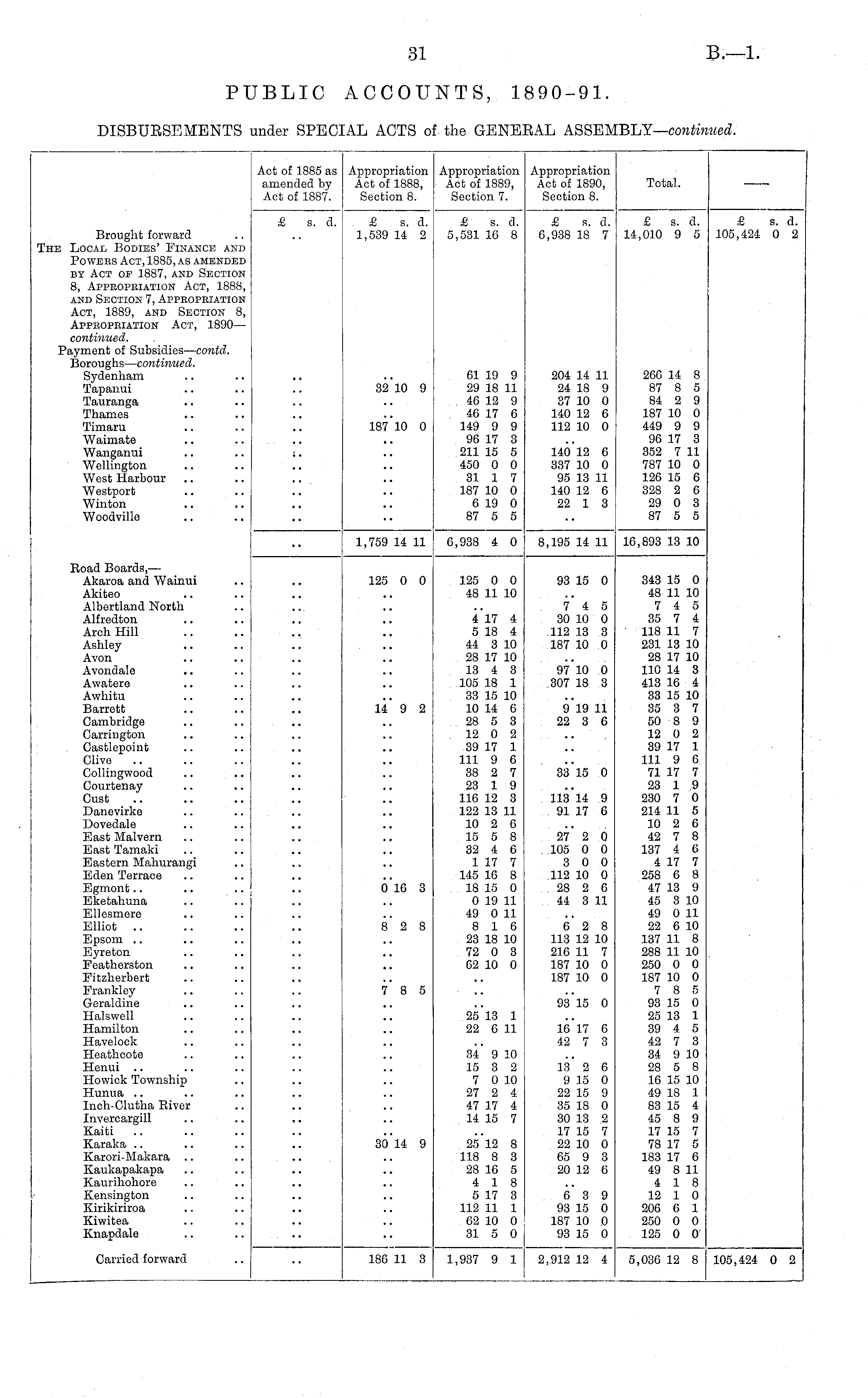 Act of 1885 as amended by Act of 1887. Appropriation Act of 1888, Section 8. Appropriation Act of 1889, Section 7. Appropriation Act of 1890, Section 8. Total. Brought forward The Local Bodies' Finance and Powers Act, 1885, as amended by Act of 1887, and Section 8, Appropriation Act, 1888, and Section 7, Appropriation Act, 1889, and Section 8, Appbopbiation Act, 1890— continued. Payment of Subsidies — contd. Boroughs— continued. Sydenham Taparmi Tauranga Thames Timaru Waimate Wanganui Wellington West Harbour Westport Winton Woodville £ s. d. £ s. a. 1,539 14 2 £ s. d. 5,531 16 8 & s. a. 6,938 18 7 £ s. a. 14,010 9 5 £ s. d. 105,424 0 2 32 10 9 61 19 9 29 18 11 46 12 9 46 17 6 149 9 9 96 17 3 211 15 5 450 0 0 31 1 7 187 10 0 6 19 0 87 5 5 204 14 11 24 18 9 37 10 0 140 12 6 112 10 0 266 14 8 87 8 5 84 2 9 187 10 0 449 9 9 96 17 3 352 7 11 787 10 0 126 15 6 328 2 6 29 0 3 87 5 5 187 10 0 140 12 6 337 10 0 95 13 11 140 12 6 22 1 3 Road Boards, — Akaroa and Wainui Akiteo Albertland North Alfredton Arch Hill Ashley Avon Avondale .. Awatere Awhitu Barrett Cambridge Garrington Castlepoint Olive .. Collingwood Gourtenay Oust Danevirke Dovedale East Malvern East Tamaki Eastern Mahurangi Eden Terrace Egmont Eketahuna Ellesmere Elliot .. Epsom Eyreton Featherston Fitzherbert Prankley Geraldine Halswell Hamilton Havelock Heathcote Henui Howiek Township Hunua Inch-Clutha Eiver Invercargill Kaiti Karaka Karori-Makara Kaukapakapa Kaurihohore Kensington Kirikiriroa Kiwitea Knapdale 1,759 14 11 6,938 4 0 8,195 14 11 16,893 13 10 125 0 0 125 0 0 48 11 10 93 15 0 343 15 0 48 11 10 7 4 5 35 7 4 118 11 7 231 13 10 28 17 10 110 14 3 413 16 4 33 15 10 35 3 7 50 8 9 12 0 2 39 17 1 111 9 6 71 17 7 23 1 9 230 7 0 214 11 5 10 2 6 42 7 8 137 4 6 4 17 7 258 6 8 47 13 9 45 3 10 49 0 11 22 6 10 137 11 8 288 11 10 250 0 0 187 10 0 7 8 5 93 15 0 25 13 1 39 4 5 42 7 3 34 9 10 28 5 8 16 15 10 49 18 1 83 15 4 45 8 9 17 15 7 78 17 5 183 17 6 49 8 11 4 18 12 1 0 206 6 1 250 0 0 125 0 0 4 17 4 5 18 4 44 3 10 28 17 10 13 4 3 105 18 1 33 15 10 10 14 6 28 5 3 12 0 2 39 17 1 111 9 6 38 2 7 23 1 9 116 12 3 122 13 11 10 2 6 15 5 8 32 4 6 1 17 7 145 16 8 18 15 0 0 19 11 49 0 11 8 16 23 18 10 72 0 3 62 10 0 7 4 5 30 10 0 .112 13 3 187 10 0 97*10 0 307 18 3 li' 9 2 9 19 11 22 3 6 3315 0 11314 9 91 17 6 27 2 0 105 0 0 3 0 0 112 10 0 28 2 6 44 3 11 6*16 3 8 2 8 6 2 8 113 12 10 216 11 7 187 10 0 187 10 0 78 5 25 13 1 22 6 11 9815 0 16 17 6 42 7 3 34 9 10 15 3 2 7 0 10 27 2 4 47 17 4 14 15 7 13 2 6 9 15 0 22 15 9 35 18 0 30 13 2 17 15 7 22 10 0 65 9 3 20 12 6 3o'l4 9 25 12 8 118 8 3 28 16 5 4 18 5 17 3 112 11 1 62 10 0 31 5 0 6 3 9 93 15 0 187 10 0 93 15 0 Carried forward 186 11 3 1,937 9 1 2,912 12 4 5,036 12 8 105,424 0 2