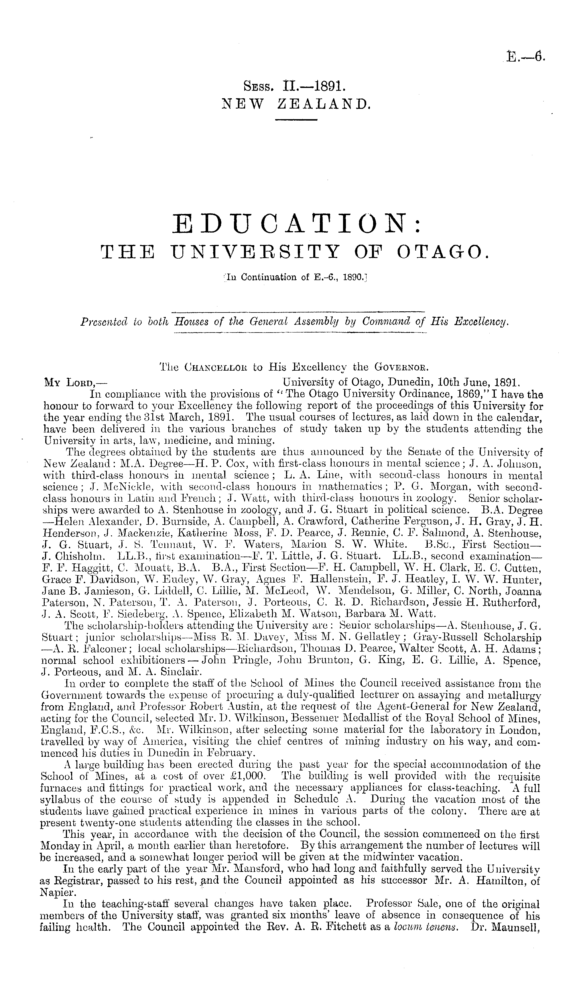 EDUCATION: THE UNIVERSITY OF OTAGO. [In Continuation of E.-6., 1890.]