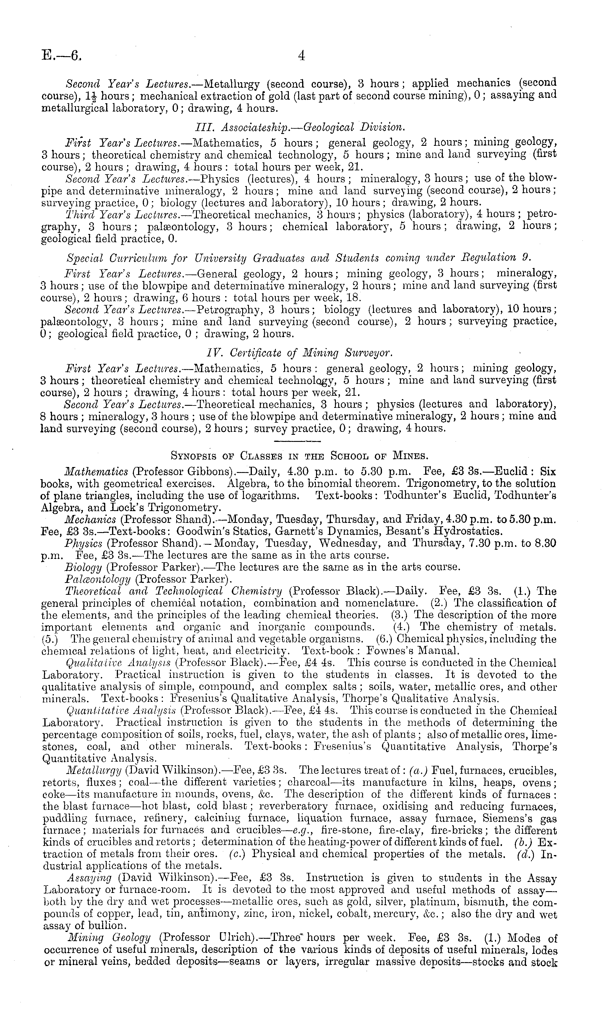 Synopsis of Classes in the School of Mines. Mathematics (Professor Gibbons). —Daily, 4.30 p.m. to 5.30 p.m. Fee, £3 3s.—Euclid : Six books, with geometrical exercises. Algebra, to the binomial theorem. Trigonometry, to the solution of plane triangles, including the use of logarithms. Text-books : Todhunter's Euclid, Todhunter's Algebra, and Lock's Trigonometry. Mechanics (Professor Shand). —Monday, Tuesday, Thursday, and Friday, 4.30 p.m. to 5.30 p.m. Fee, £3 3s.—Text-books: Goodwin's Statics, Garnett's Dynamics, Besant's Hydrostatics. Physics (Professor Shand). —Monday, Tuesday, Wednesday, and Thursday, 7.30 p.m. to 8.30 p.m. Fee, £3 3s. —The lectures are the same as in the arts course. Biology (Professor Parker). —The lectures are the same as in the arts course. Paleontology (Professor Parker). Theoretical and Technological Chemistry (Professor Black). —Daily. Fee, £3 3s. (1.) The general principles of chemical notation, combination and nomenclature. (2.) The classification of the elements, and the principles of the leading chemical theories. (3.) The description of the more important elements and organic and inorganic compounds. (4.) The chemistry of metals. (5.) The general chemistry of animal and vegetable organisms. (6.) Chemical physics, including the chemical relations of light, heat, and electricity. Text-book.: Fownes's Manual. Qualitative Analysis (Professor Black). —Fee, £4 4s. This course is conducted in the Chemical Laboratory. Practical instruction is given to the students in classes. It is devoted to the qualitative analysis of simple, compound, and complex salts ; soils, water, metallic ores, and other minerals. Text-books : Fresenius's Qualitative Analysis, Thorpe's Qualitative Analysis. Quantitative Analysis (Professor Black). —Fee, £4 4s. This course is conducted in the Chemical Laboratory. Practical instruction is given to the students in the methods of determining the percentage composition of soils, rocks, fuel, clays, water, the ash of plants ; also of metallic ores, limestones, coal, and other minerals. Text-books : Fresenius's Quantitative Analysis, Thorpe's Quantitative Analysis. Metallurgy (David Wilkinson). —Fee, £3 3s. The lectures treat of: (a.) Fuel, furnaces, crucibles, retorts, fluxes; coal—the different varieties; charcoal—its manufacture in kilns, heaps, ovens; coke—its manufacture in mounds, ovens, &o. The description of the different kinds of furnaces : the blast furnace —hot blast, cold blast; reverberator} 7 furnace, oxidising and reducing furnaces, puddling furnace, refinery, calcining furnace, liquation furnace, assay furnace, Siemens's gas furnace; materials for furnaces and crucibles— e.g., fire-stone, fire-clay, fire-bricks; the different kinds of crucibles and retorts; determination of the heating-power of different kinds of fuel, (b.) Extraction of metals from their ores, (c.) Physical and chemical properties of the metals, (d.) Industrial applications of the metals. Assaying (David Wilkinson). —Fee, £3 3s. Instruction is given to students in the Assay Laboratory or furnace-room. It is devoted to the most approved and useful methods of assay— both by the dry and wet processes —metallic ores, such as gold, silver, platinum, bismuth, the compounds of copper, lead, tin, antimony, zinc, iron, nickel, cobalt, mercury, &c.; also the dry and wet assay of bullion. Mining Geology (Professor Dlrich). —Three hours per week. Fee, £3 3s. (1.) Modes of occurrence of useful minerals, description of the various kinds of deposits of useful minerals, lodes or mineral veins, bedded deposits—seams or layers, irregular massive deposits'—stocks and stock
