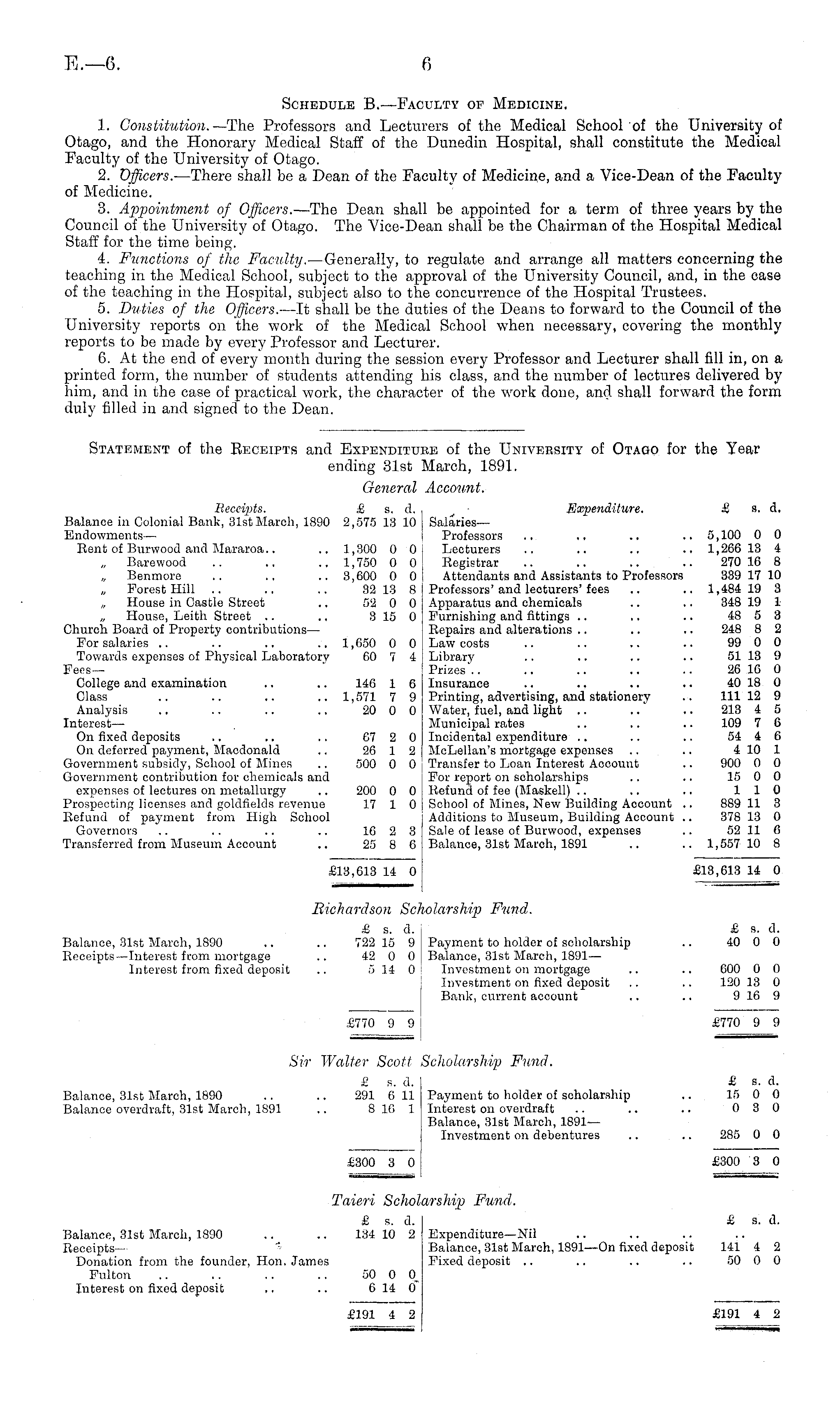 Schedule B. —Faculty of Medicine. 1. Constitution. —The Professors and Lecturers of the Medical School of the University of Otago, and the Honorary Medical Staff of the Dunedin Hospital, shall constitute the Medical Faculty of the University of Otago. 2. Officers. —There shall be a Dean of the Faculty of Medicine, and a Vice-Dean of the Faculty of Medicine. 3. Appointment of Officers. —The Dean shall be appointed for a term of three years by the Council of the University of Otago. The Vice-Dean shall be the Chairman of the Hospital Medical Staff for the time being. 4. Functions of the Faculty. —Generally, to regulate and arrange all matters concerning the teaching in the Medical School, subject to the approval of the University Council, and, in the case of the teaching in the Hospital, subject also to the concurrence of the Hospital Trustees. 5. Duties of the Officers. —It shall be the duties of the Deans to forward to the Council of the University reports on the work of the Medical School when necessary, covering the monthly reports to be made by every Professor and Lecturer. 6. At the end of every month during the session every Professor and Lecturer shall fill in, on a printed form, the number of students attending his class, and the number of lectures delivered by him, and in the case of practical work, the character of the work done, and shall forward the form duly filled in and signed to the Dean.