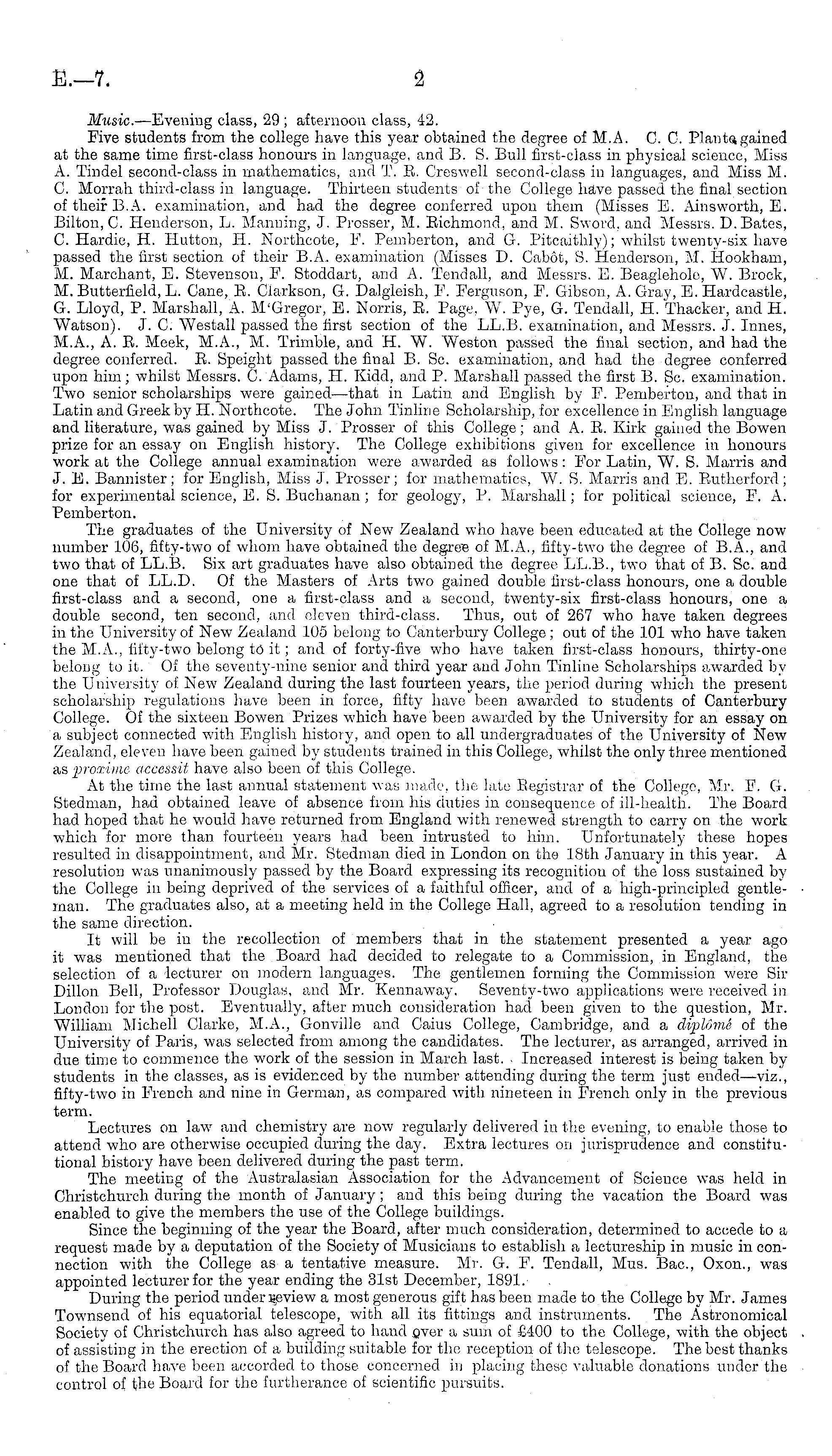 Music. —Evening class, 29 ; afternoon class, 42. Five students from the college have this year obtained the degree of M.A. C. C. Plants gained at the same time first-class honours in language, and B. S. Bull first-class in physical science, Miss A. Tindel second-class in mathematics, and T. E. Creswell second-class in languages, and Miss M. C. Morrah third-class in language. Thirteen students of the College have passed the final section of their B.A. examination, and had the degree conferred upon them (Misses E. Ainsworth,, B. Bilton, C. Henderson, L. Manning, J. Prosser, M. Eichmond, and M. Sword, and Messrs. D. Bates, C. Hardie, H. Hutton, H. Northcote, F. Pemberton, and G. Pitcaitbly); whilst twenty-six have passed the first section of their B.A. examination (Misses D. Cabot, S. Henderson, M. Hookham, M. Marchant, E. Stevenson, F. Stoddart, and A. Tendall, and Messrs. E. Beaglehole, W. Brock, M. Butterfield, L. Cane, E. Ciarkson, G. Dalgleish, F. Ferguson, F. Gibson, A. Gray, E. Hardcastle, G. Lloyd, P. Marshall, A. M'Gregor, E. Norris, E. Page, W. Pye, G. Tendall, H. Thacker, and PI. Watson). J. C. Westall passed the first section of the LL.B. examination, and Messrs. J. Innes, M.A., A. E. Meek, M.A., M. Trimble, and H. W. Weston passed the final section, and had the degree conferred. E. Speight passed the final B. Sc. examination, and had the degree conferred upon him; whilst Messrs. 0. Adams, H. Kidd, and P. Marshall passed the first B. Sc. examination. Two senior scholarships were gained—that in Latin and English by E. Pembertou, and that in Latin and Greek by H. Northcote. The John Tinline Scholarship, for excellence in English language and literature, was gained by Miss J. Prosser of this College; and A. E. Kirk gained the Bowen prize for an essay on English history. The College exhibitions given for excellence in honours work at the College annual examination were awarded as follows : For Latin, "W. S. Marris and J. E. Bannister; for English, Miss J. Prosser; for mathematics, W. S. Marris and E. Eutherford ; for experimental science, E. S. Buchanan ; for geology, P. Marshall; for political science, F. A. Pemberton. The graduates of the University of New Zealand who have been educated at the College now number 106, fifty-two of whom have obtained the degree of M.A., fifty-two the degree of 8.A., and two that of LL.B. Six art graduates have also obtained the degree LL.B., two that of B. Sc. and one that of LL.D. Of the Masters of Arts two gained double first-class honours, one a double first-class and a second, one a first-class and a second, twenty-six first-class honours, one a double second, ten second, and eleven third-class. Thus, out of 267 who have taken degrees in the University of New Zealand 105 belong to Canterbury College ; out of the 101 who have taken the M.A., fifty-two belong to it ; and of forty-five who have taken first-class honours, thirty-one belong to it. Of the seventy-nine senior and third year and John Tinline Scholarships awarded by the University of New Zealand during the last fourteen years, the period during which the present scholarship regulations have been in force, fifty have been awarded to students of Canterbury College. Of the sixteen Bowen Prizes which have been awarded by the University for an essay on a subject connected with English history, and open to all undergraduates of the University of New Zealand, eleven have been gained by students trained in this College, whilst the only three mentioned as proximo access-it have also been of this College. At the time the last annual statement was made, the Jate Begistrar of the College, Mr. F. G. Stedman, had obtained leave of absence from his duties in consequence of ill-health. The Board had hoped that he would have returned from England with renewed strength to carry on the work which for more than fourteen years had been intrusted to him. Unfortunately these hopes resulted in disappointment, and Mr. Stedmau died in London on the 18th January in this year. A resolution was unanimously passed by the Board expressing its recognition of the loss sustained by the College in being deprived of the services of a faithful officer, and of a high-principled gentleman. The graduates also, at a meeting held in the College Hall, agreed to a resolution tending in the same direction. It will be in the recollection of members that in the statement presented a year ago it was mentioned that the Board had decided to relegate to a Commission, in England, the selection of a lecturer on modern languages. The gentlemen forming the Commission were Sir Dillon Bell, Professor Douglas, and Mr. Kennaway. Seventy-two applications were received in London for the post. Eventually, after much consideration had been given to the question, Mr. William Michell Clarke, M.A., Gonville and Caius College, Cambridge, and a diplome of the University of Paris, was selected from among the candidates. The lecturer, as arranged, arrived in due time to commence the work of the session in March last. , Increased interest is being taken bystudents in the classes, as is evidenced by the number attending during the term just ended—viz., fifty-two in French and nine in German, as compared with nineteen in French only in the previous term. Lectures on law and chemistry are now regularly delivered in the evening, to enable those to attend who are otherwise occupied during the day. Extra lectures on jurisprudence and constitutional history have been delivered during the past term, The meeting of the Australasian Association for the Advancement of Science was held in Christchurch during the month of January ; and this being during the vacation the Board was enabled to give the members the use of the College buildings. Since the beginning of the year the Board, after much consideration, determined to accede to a request made by a deputation of the Society of Musicians to establish a lectureship in music in connection with the College as a ten