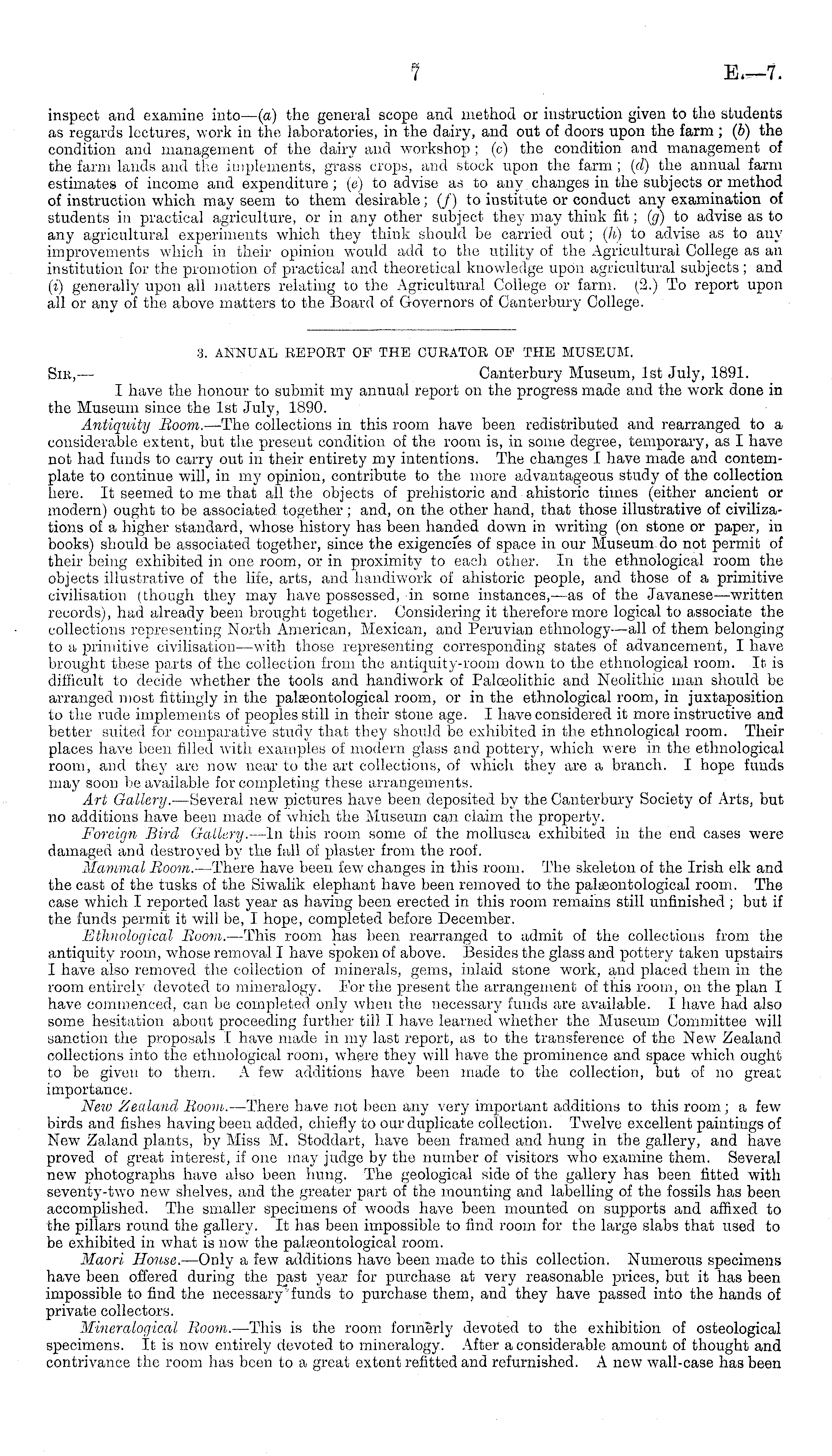 3. ANNUAL BBPOET OP THE CUEATOE OP THE MUSE DM. Sik, — Canterbury Museum, Ist July, 1891. I have the honour to submit my annual report on the progress made and the work done in the Museum since the Ist July, 1890. Antiquity Boom. —The collections in this room have been redistributed and rearranged to a considerable extent, but the present condition of the room is, in some degree, temporary, as I have not had funds to carry out in their entirety my intentions. The changes I have made and contemplate to continue will, in my opinion, contribute to the more advantageous study of the collection here. It seemed to me that all the objects of prehistoric and ahistoric times (either ancient or modern) ought to be associated together ; and, on the other hand, that those illustrative of civilizations of a higher standard, whose history has been handed down in writing (on stone or paper, in books) should be associated together, since the exigencies of space in our Museum do not permit of their being exhibited in. one room, or in proximity to each other. In the ethnological room the objects illustrative of the life., arts, and handiwork of ahistoric people, and those of a primitive civilisation (though they may have possessed, in some instances, —as of the Javanese —written records), had already been brought together. Considering it therefore more logical to associate the collections representing North American, Mexican, and Peruvian ethnology —all of them belonging to a primitive civilisation—with those representing corresponding states of advancement, I have brought these parts of the collection from the antiquity-room down to the ethnological room. It is difficult to decide whether the tools and handiwork of Palceolithic and Neolithic man should bo arranged most fittingly in the palasontological room, or in the ethnological room, in juxtaposition to the rude implements of peoples still in their stone age. I have considered it more instructive and better suited for comparative study that they should bo exhibited in the ethnological room. Their places have been rilled with examples of modern glass and pottery, which were in the ethnological room, and they are now near to the art collections, of which they are a branch. I hope funds may soon be available for completing these arrangements, Art Gallery. —Several new pictures have been deposited by the Canterbury Society of Arts, but no additions have been made of which the Museum can claim the property. Foreign Bird Gallery. —ln this room some of the mollusca exhibited in the end cases were damaged and destroyed by the fall of plaster from the roof. Mammal Boom. —There have been few changes in this room. The skeleton of the Irish elk and the cast of the tusks of the Siwalik elephant have been removed to the palteontological room. The case which I reported last year as having been erected in this room remains still unfinished ; but if the funds permit it will be, I hope, completed before December. Ethnological Boom. —This room has been rearranged to admit of the collections from the antiquity room, whose removal I have spoken of above. Besides the glass and pottery taken upstairs I have also removed the collection of minerals, gems, inlaid stone work, and placed them in the room entirely devoted to mineralogy. For the present the arrangement of this room, on the plan I have commenced, can be completed only when the necessary funds are available. I have had also some hesitation about proceeding further till I have learned whether the Museum Committee will sanction the proposals I have made in my last report, as to the transference of the New Zealand collections into the ethnological room, where they will have the prominence and space which ought to be given to them. A few additions have been made to the collection, but of no great importance. New Zealand Boom. —There have not been any very important additions to this room; a few birds and fishes having been added, chiefly to our duplicate collection. Twelve excellent paintings of New Zalancl plants, by Miss M. Stoddart, have been framed and hung in the gallery, and have proved of great interest, if one may judge by the number of visitors who examine them. Several new photographs have also been hung. The geological side of the gallery has been fitted with seventy-two new shelves, and the greater part of the mounting and labelling of the fossils has been accomplished. The smaller specimens of woods have been mounted on supports and affixed to the pillars round the gallery. It has been impossible to find room for the large slabs that used to be exhibited in what is now the palasontological room. Maori House. —Only a few additions have been made to this collection. Numerous specimens have been offered during the past year for purchase at very reasonable prices, but it has been impossible to find the necessary" funds to purchase them, and they have passed into the hands of private collectors. Miiieralogical Boom. —This is the room formerly devoted to the exhibition of osteological specimens. It is now entirely devoted to mineralogy. After a considerable amount of thought and contrivance the room has been to a great extent refitted and refurnished. A new wall-case has been