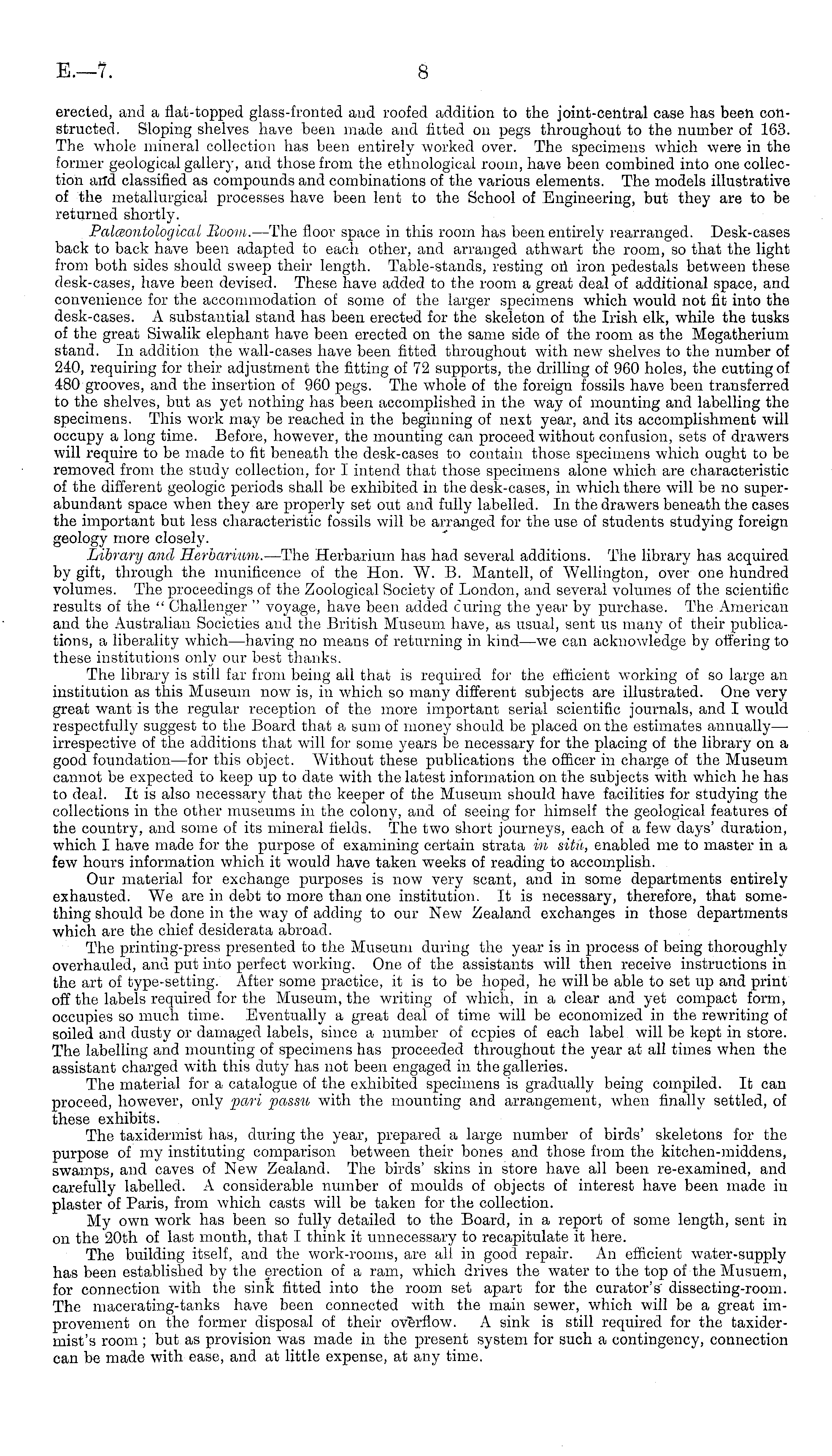 erected, and a flat-topped glass-fronted and roofed addition to the joint-central case has been constructed. Sloping shelves have been made and fitted on pegs throughout to the number of 163. The whole mineral collection has been entirely worked over. The specimens which were in the former geological gallery, and those from the ethnological room, have been combined into one collection an"d classified as compounds and combinations of the various elements. The models illustrative of the metallurgical processes have been lent to the School of Engineering, but they are to be returned shortly. Palcßoniological Boom. —The floor space in this room has been entirely rearranged. Desk-cases back to back have been adapted to each other, and arranged athwart the room, so that the light from both sides should sweep their length. Table-stands, resting oil iron pedestals between these desk-cases, have been devised. These have added to the room a great deal of additional space, and convenience for the accommodation of some of the larger specimens which would not fit into the desk-cases. A substantial stand has been erected for the skeleton of the Irish elk, while the tusks of the great Siwalik elephant have been erected on the same side of the room as the Megatherium stand. In addition the wall-cases have been fitted throughout with new shelves to the number of 240, requiring for their adjustment the fitting of 72 supports, the drilling of 960 holes, the cutting of 480 grooves, and the insertion of 960 pegs. The whole of the foreign fossils have been transferred to the shelves, but as yet nothing has been accomplished in the way of mounting and labelling the specimens. This work may be reached in the beginning of next year, and its accomplishment will occupy a long time. Before, however, the mounting can proceed without confusion, sets of drawers will require to be made to fit beneath the, desk-cases to contain those specimens which ought to be removed from the study collection, for I intend that those specimens alone which are characteristic of the different geologic periods shall be exhibited in the desk-cases, in which there will be no superabundant space when they are properly set out and fully labelled. In the drawers beneath the cases the important but less characteristic fossils will be arranged for the use of students studying foreign geology more closely. Library and Herbarium. —The Herbarium has had several additions. The library has acquired by gift, through the munificence of the Hon. W. B. Mantell, of Wellington, over one hundred volumes. The proceedings of the Zoological Society of London, and several volumes of the scientific results of the " Challenger " voyage, have been added curing the year by purchase. The American and the Australian Societies and the British M?useum have, as usual, sent us many of their publications, a liberality which—having no means of returning in kind—we can acknowledge by offering to these institutions only our best thanks. The library is still far from being all that is required for the efficient working of so large an institution as this Museum now is, in which so many different subjects are illustrated. One very great want is the regular reception of the more important serial scientific journals, and I would respectfully suggest to the Board that a sum of money should be placed on the estimates annually — irrespective of the additions that will for some years be necessary for the placing of the library on a good foundation —for this object. Without these publications the officer in charge of the Museum cannot be expected to keep up to date with the latest information on the subjects with which he has to deal. It is also necessary that the keeper of the Museum should have facilities for studying the collections in the other museums in the colony, and of seeing for himself the geological features of the country, and some of its mineral fields. The two short journeys, each of a few days' duration, which I have made for the purpose of examining certain strata in situ, enabled me to master in a few hours information which it would have taken weeks of reading to accomplish. Our material for exchange purposes is now very scant, and in some departments entirely exhausted. We are in debt to more than one institution. It is necessary, therefore, that something should be done in the w ray of adding to our New Zealand exchanges in those departments which are the chief desiderata abroad. The printing-press presented to the Museum during the year is in process of being thoroughly overhauled, and put into perfect working. One of the assistants will then receive instructions in the art of type-setting. After some practice, it is to be hoped, he will be able to set up and print off the labels required for the Museum, the writing of which, in a clear and yet compact form, occupies so much time. Eventually a great deal of time will be economized in the rewriting of soiled and dusty or damaged labels, since a number of copies of each label will be kept in store. The labelling and mounting of specimens has proceeded throughout the year at all times when the assistant charged with this duty has not been engaged in the galleries. The material for a catalogue of the exhibited specimens is gradually being compiled. It can proceed, however, only pari jmssm with the mounting and arrangement, when finally settled, of these exhibits. The taxidermist has, during the year, prepared a large number of birds' skeletons for the purpose of my instituting compai'ison between their bones and those from the kitchen-middens, swamps, and caves of New Zealand. The birds' skins in store have all been re-examined, and carefully labelled. A considerable number of moulds of objects of interest have been made in plaster of Paris, from which casts will be taken for the collection. My own work has been so fully detailed to the Board, in a report of some length, sent in on the 20th of last mont