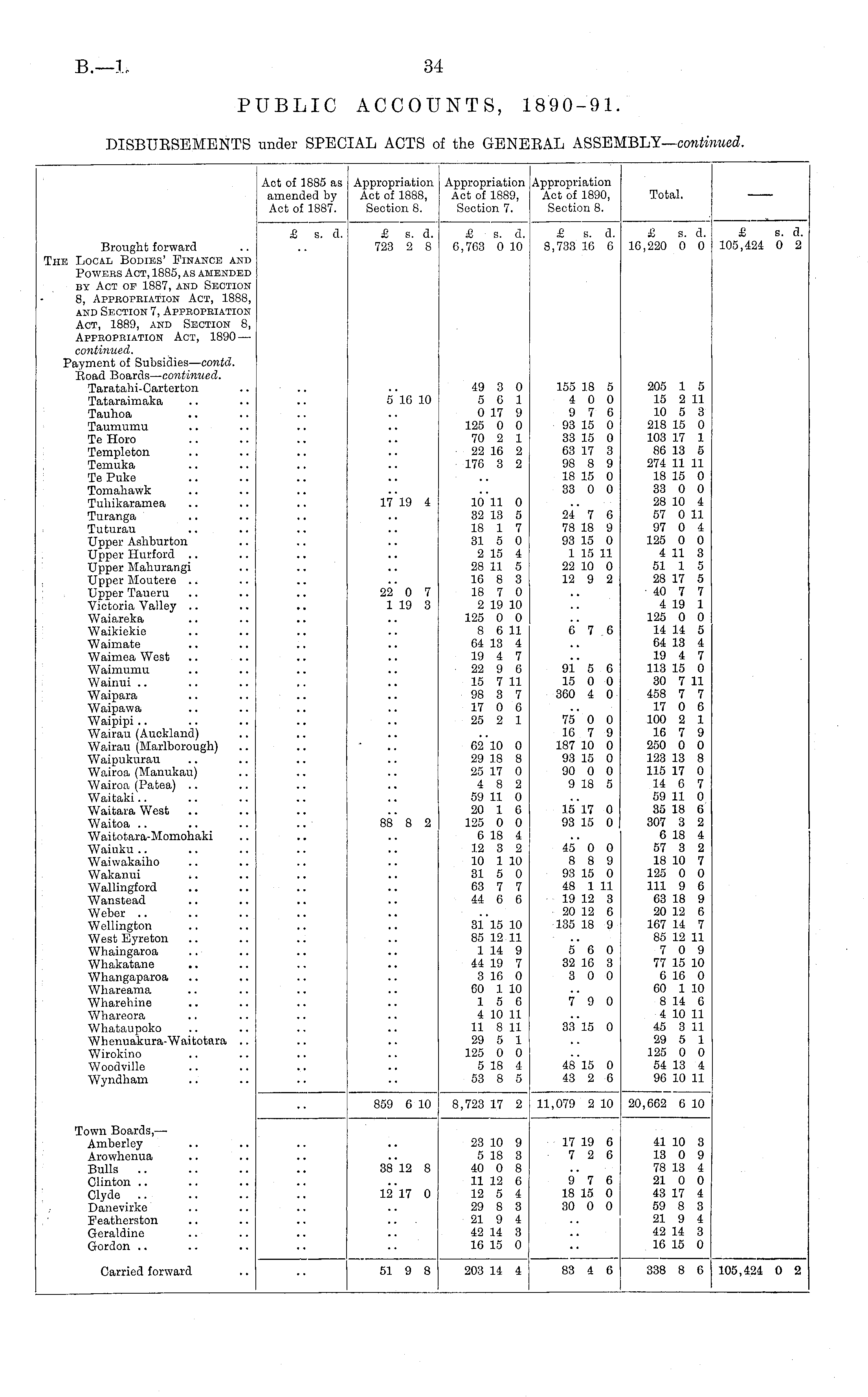 Act of 1885 as amended by Act of 1887. Appropriation Act of 1888, Section 8. Appropriation Act of 1889, Section 7. Appropriation Act of 1890, Section 8. Total. Brought forward The Local Bodies' Finance and Powers Act, 1885, as amended by Act of 1887, and Section - ' 8, Appkopbiation Act, 1888, and Section 7, Appbopbiation Act, 1889, and Section 8, Appkopbiation Act, 1890 — continued. Payment o£ Subsidies— contd. Road Boards — continued. Taratahi-Carterton Tataraimaka Tauhoa Taumumu Tβ Horo Templeton Temuka Te Puke Tomahawk Tuhikaramea Turanga Tuturau Upper Ashburton Upper Hurford Upper Mahurangi Upper Moutere Upper Taueru Victoria Valley Waiareka Waikiekie Waimate Waimea West Waimumu Wainui Waipara Waipawa Waipipi Wairau (Auckland) Wairau (Marlborough) Waipukurau Wairoa (Manukau) Wairoa (Patea) Waitaki Waitara West Waitoa .. Waitotara-Momohaki Waiuku Waiwakaiho Wakanui Wallingford Wanstead Weber Wellington West Eyreton Whaingaroa Whakatane Whangaparoa Whareama Wharehine Whareora Whataupoko Whenuakura-Waitotara .. Wirokino Woodville Wyndham £ s. d. £ s. d. 723 2 8 £ s. d. 6,763 0 10 £ s. d. 8,733 16 0 £ s. a. 16,220 0 0 £ S. d. 105,424 0 2 5 - 16 10 49 3 0 5 G 1 0 17 9 125 0 0 70 2 1 22 16 2 176 3 2 155 18 5 4 0 0 9 7 6 93 15 0 33 15 0 03 17 3 98 8 9 18 15 0 33 0 0 205 1 5 15 2 11 10 5 3 218 15 0 103 17 1 86 13 5 274 11 11 18 15 0 33 0 0 28 10 4 57 0 11 97 0 4 125 0 0 4 11 3 51 1 5 28 17 5 40 7 7 4 19 1 125 0 0 14 14 5 64 13 4 19 4 7 113 15 0 30 7 11 458 7 7 17 0 6 100 2 1 16 7 9 250 0 0 123 13 8 115 17 0 14 6 7 59 11 0 35 18 6 307 3 2 6 18 4 57 3 2 18 10 7 125 0 0 111 9 6 63 18 9 20 12 6 167 14 7 85 12 11 7 0 9 77 15 10 6 16 0 60 1 10 8 14 6 4 10 11 45 3 11 29 5 1 125 0 0 54 13 4 96 10 11 17 19 4 10 11 0 32 13 5 18 1 7 31 5 0 2 15 4 28 11 5 10 8 3 18 7 0 2 19 10 125 0 0 8 6 11 04 13 4 19 4 7 22 9 0 15 7 11 98 3 7 17 0 0 25 2 1 24 7 6 78 18 9 93 15 0 1 15 11 22 10 0 12 9 2 22* 0 7 1 19 3 67 6 91 5 6 15 0 0 360 4 0 62 10 0 29 18 8 25 17 0 4 8 2 59 11 0 20 1 6 125 0 0 6 18 4 12 3 2 10 1 10 31 5 0 63 7 7 44 6 6 75 0 0 10 7 9 187 10 0 93 15 0 90 0 0 9 18 5 88' 8 2 15 17 0 93 15 0 45 0 0 8 8 9 93 15 0 48 1 11 19 12 3 20 12 6 135 18 9 31 15 10 85 12 11 1 14 9 44 19 7 3 16 0 60 1 10 15 6 4 10 11 11 8 11 29 5 1 125 0 0 5 18 4 53 8 5 5 6 0 32 16 3 3 0 0 7 9 0 83*15 0 48 15 0 43 2 6 859 6 10 8,723 17 2 11,079 2 10 20,062 6 10 Town Boards, — Amberley Arowhenua Bulls .. Clinton Clyde .. Danevirke Featherston Geraldine Gordon 38" 12 8 12 17 0 23 10 9 5 18 3 40 0 8 11 12 6 12 5 4 29 8 3 21 9 4 42 14 3 10 15 0 17 19 6 7 2 0 9 7 6 18 15 0 30 0 0 41 10 3 13 0 9 78 13 4 21 0 0 43 17 4 59 8 3 21 9 4 42 14 3 16 15 0 Carried forward 51 9 8 203 14 4 83 4 6 338 8 6 105,424 0 2