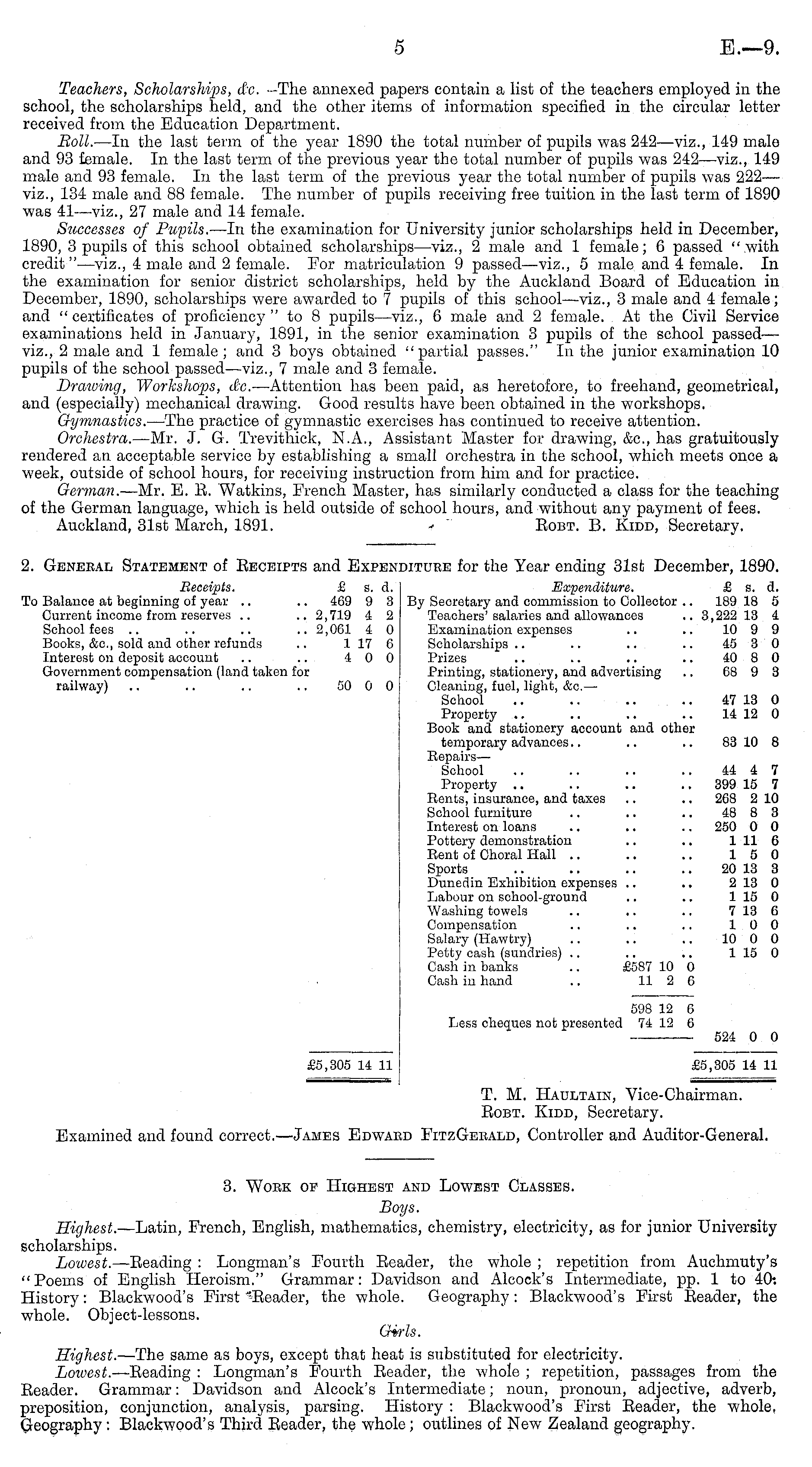 Teachers, Scholarships, etc. -The annexed papers contain a list of the teachers employed in the school, the scholarships held, and the other items of information specified in the circular letter received from the Education Department. Soil. —ln the last term of the year 1890 the total number of pupils was 242—viz., 149 male and 93 female. In the last term of the previous year the total number of pupils was 242—viz., 149 male and 93 female. In the last term of the previous year the total number of pupils was 222 — viz., 134 male and 88 female. The number of pupils receiving free tuition in the last term of 1890 was 41—viz., 27 male and 14 female. Successes of Pupils. —ln the examination for University junior scholarships held in December, 1890, 3 pupils of this school obtained scholarships—viz., 2 male and 1 female; 6 passed "with credit"—viz., 4 male and 2 female. For matriculation 9 passed—viz., 5 male and 4 female. In the examination for senior district scholarships, held by the Auckland Board of Education in December, 1890, scholarships were awarded to 7 pupils of this school—viz., 3 male and 4 female; and " certificates of proficiency " to 8 pupils—viz., 6 male and 2 female. At the Civil Service examinations held in January, 1891, in the senior examination 3 pupils of the school passed— viz., 2 male and 1 female; and 3 boys obtained "partial passes." In the junior examination 10 pupils of the school passed—viz., 7 male and 3 female. Drawing, Workshops, etc. —Attention has been paid, as heretofore, to freehand, geometrical, and (especially) mechanical drawing. Good results have been obtained in the workshops. Gymnastics. —The practice of gymnastic exercises has continued to receive attention. Orchestra. —Mr. J. G. Trevithick, N.A., Assistant Master for drawing, &c, has gratuitously rendered an acceptable service by establishing a small orchestra in the school, which meets once a week, outside of school hours, for receiving instruction from him and for practice. German.— Mr. E. E. Watkins, French Master, has similarly conducted a class for the teaching of the German language, which is held outside of school hours, and without any payment of fees. Auckland, 31st March, 1891. Eobt. B. Kidd, Secretary.
