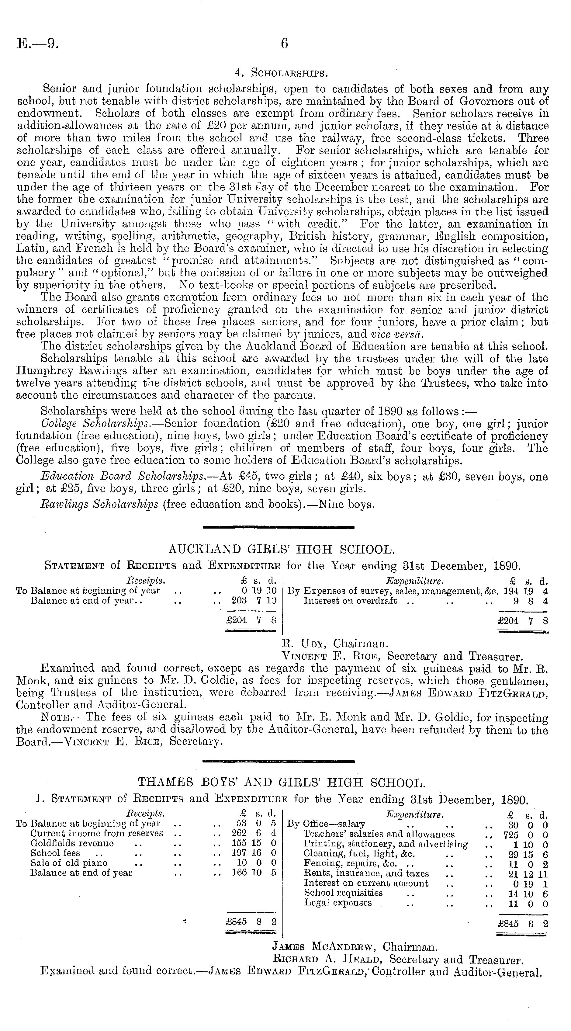 4. SCHOLAESHIPS. Senior and junior foundation scholarships, open to candidates of both sexes and from any school, but not tenable with district scholarships, are maintained by the Board of Governors out of endowment. Scholars of both classes are exempt from ordinary fees. Senior scholars receive in addition-allowances at the rate of £20 per annum, and junior scholars, if they reside at a distance of more than two miles from the school and use the railway, free second-class tickets. Three scholarships of each class are offered annually. For senior scholarships, which are tenable for one year, candidates must be under the age of eighteen years ; for junior scholarships, which are tenable until the end of the year in which the age of sixteen years is attained, candidates must be under the age of thirteen years on the 31st day of the December nearest to the examination. For the former the examination for junior University scholarships is the test, and the scholarships are awarded to candidates who, failing to obtain University scholarships, obtain places in the list issued by the University amongst those who pass "with credit." For the latter, an examination in reading, writing, spelling, arithmetic, geography, British history, grammar, English composition, Latin, and French is held by the Board's examiner, who is directed to use his discretion in selecting the candidates of greatest "promise and attainments." Subjects are not distinguished as "compulsory " and " optional," but the omission of or failure in one or more subjects may be outweighed by superiority in the others. No text-books or special portions of subjects are prescribed. The Board also grants exemption from ordinary fees to not more than six in each year of the winners of certificates of proficiency granted on the examination for senior and junior district scholarships. For two of these free places seniors, and for four juniors, have a prior claim; but free places not claimed by seniors may be claimed by juniors, and vice versa. The district scholarships given by the Auckland Board of Education are tenable at this school. Scholarships tenable at this school are awarded by the trustees under the will of the late Humphrey Eawlings after an examination, candidates for which must be boys under the age of twelve years attending the district schools, and must tie approved by the Trustees, who take into account the circumstances and character of the parents. Scholarships were held at the school during the last quarter of 1890 as follows :— College Scholarships. —Senior foundation (£2O and free education), one boy, one girl; junior foundation (free education), nine boys, two girls; under Education Board's certificate of proficiency (free education), five boys, five girls; children of members of staff, four boys, four girls. The College also gave free education to some holders of Education Board's scholarships. Education Board Scliolarships. —At £45, two girls ; at £40, six boys; at £30, seven boys, one girl; at £25, five boys, three girls; at £20, nine boys, seven girls. Baivlings Scholarships (free education and books). —Nine boys.