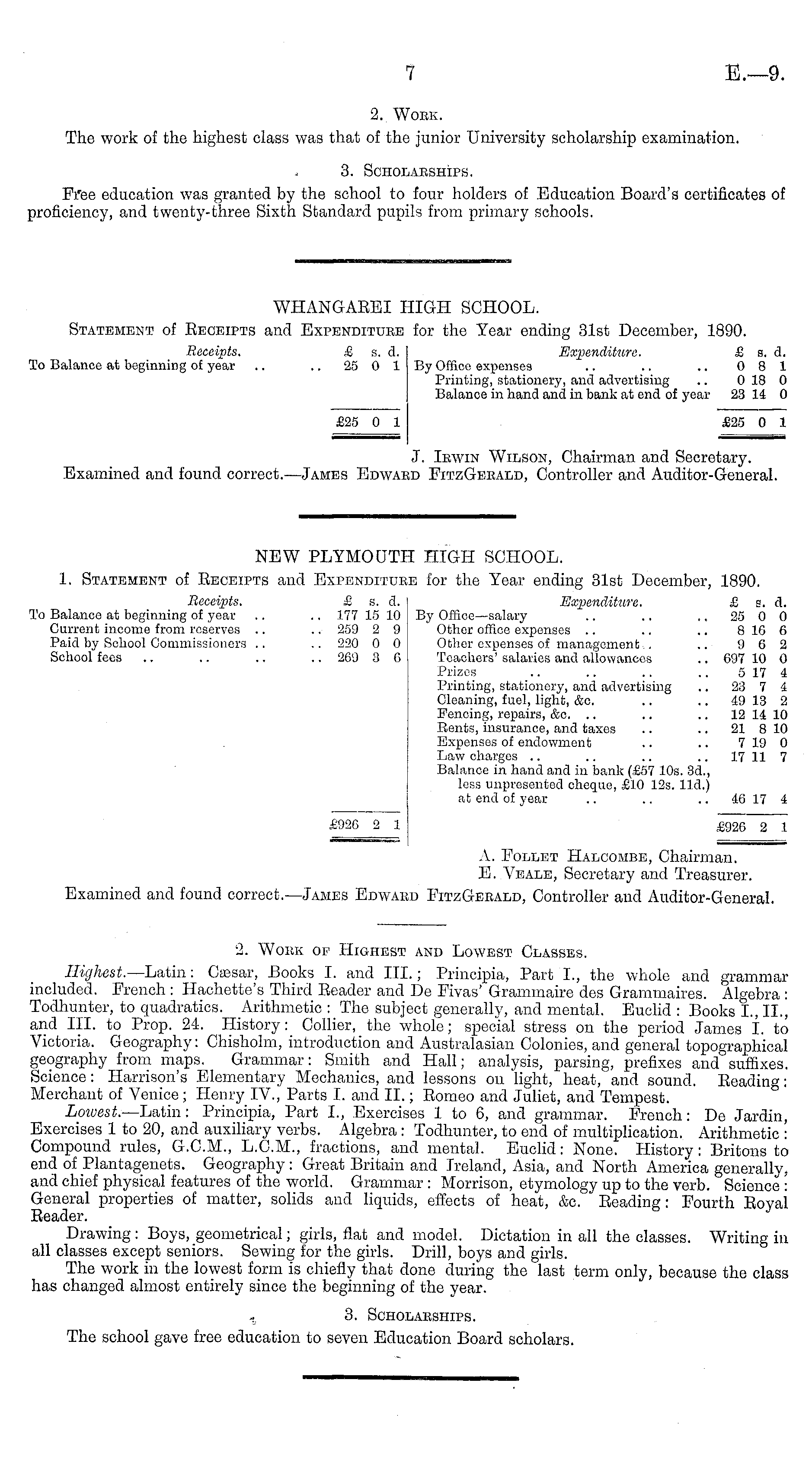 NEW PLYMOUTH HIGH SCHOOL. 1. Statement of Receipts and Expenditure for the Year ending 31st December, 1890. Receipts. £ s. d. Expenditure. £ s. d. To Balanco at beginning of year .. .. 177 15 10 By Office—salary .. .. .. 25 0 0 Current income from reserves .. .. 259 2 9 Other office expenses .. .. 816 6 Paid by School Commissioners .. .. 220 0 0 Other expenses of management... .. 9 6 2 School fees .. .. .. .. 269 3 6 Teachers' salaries and allowances .. 697 10 0 Prizes .. .. .. .. 517 4 Printing, stationery, and advertising .. 23 7 i Cleaning, fuel, light, &c. .. 49 13 2 Fencing, repairs, &c. .. .. .. 12 14 10 Rents, insurance, and taxes .. .. 21 810 Expenses of endowment .. .. 719 0 Law charges .. .. .. 17 11 7 Balance in hand and in bank (£57 10s. 3d., less unpresented cheque, £10 12s. lid.) at end of year .. .. .. 46 17 4 £926 2 1 £926 2 1 A. Follet Halcombe, Chairman. E. Veale, Secretary and Treasurer. Examined and found correct.—James Edward FitzGebald, Controller and Auditor-General.