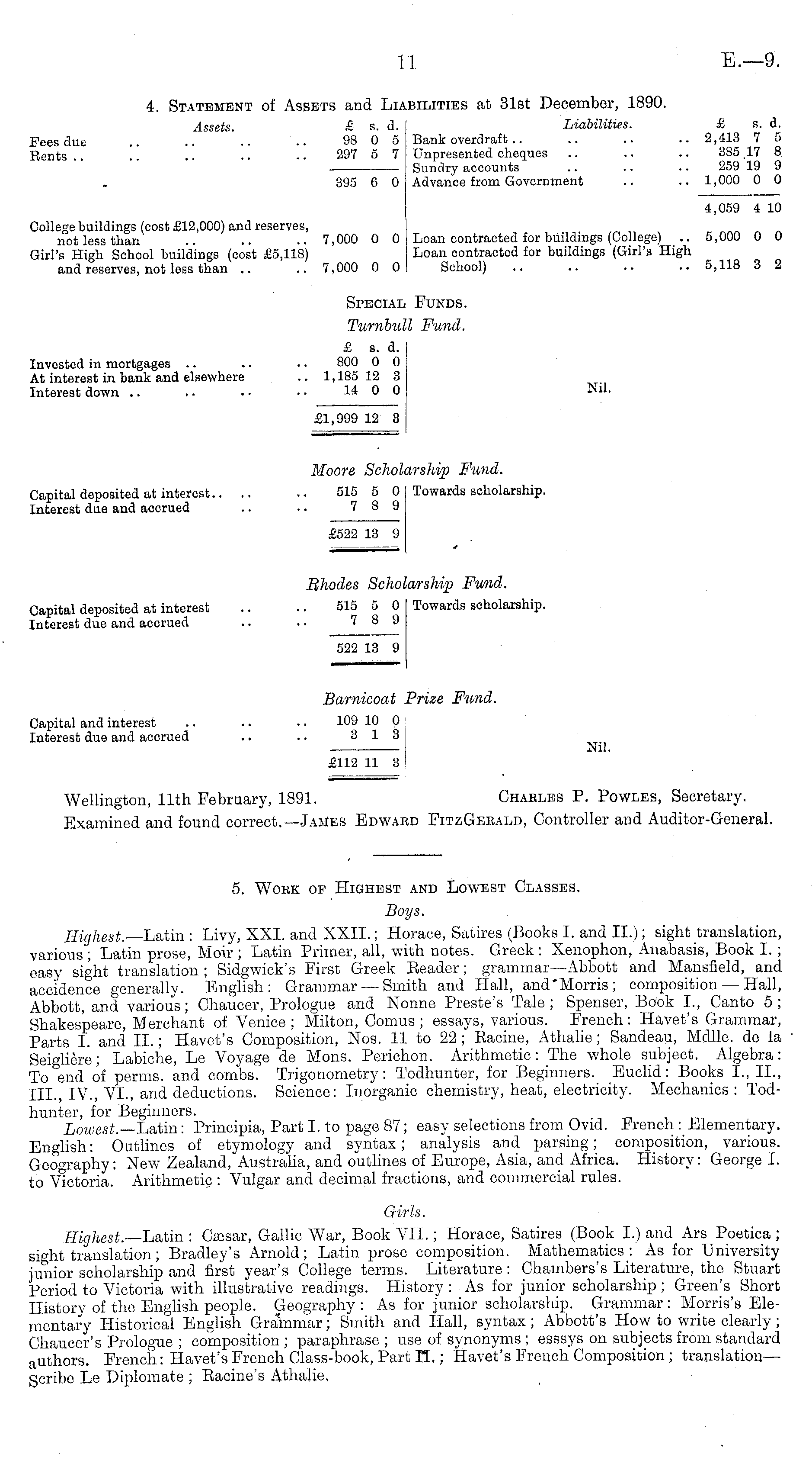 4. Statement of Assets and Liabilities at 31st December, 1890. Assets. £ s. &. Liabilities. & a. d. Pees clue .. .. .. .. 98 0 5 Bank overdraft .. .. .. .. 2,413 7 6 Rents . 297 5 7 Unpresented cheques .. .. .. 385 17 8 Sundry accounts .. .. .. 259 19 9 395 6 0 Advance from Government .. .. 1,000 0 0 4,059 4 10 College buildings (cost £12,000) and reserves, not less than .. .. 7,000 0 0 Loan contracted for buildings (College) .. 5,000 0 0 Girl's High School buildings (cost £5,118) Loan contracted for buildings (Girl's High and reserves, not less than .. .. 7,000 0 0 School) .. .. .. •• 5,118 3 2 Special Funds. Turribull Fund. £ s. d. Invested in mortgages .. .. .. 800 0 0 At interest in bank and elsewhere .. 1,185 12 3 Interest down .. .. .. •• 14 0 0 Nil. £1,999 12 3 Moore Scholarship Fund. Capital deposited at interest.. .. .. 515 50 | Towards scholarship. Interest due and accrued .. • • 7 8 9 £522 13 9 Bhodes Scholarship Fund. Capital deposited at interest .. .. 515 5 0 Towards scholarship. Interest due and accrued .. .. 7 8 9 522 13 9 Barnicoat Prize Fund. Capital and interest .. .. .. 109 10 0 ; Interest due and accrued .. . • 3 13 . Nil. £112 11 3 Wellington, 11th February, 1891. Charles P. Powles, Secretary. Examined and found correct.—James Edwaed FitzGerald, Controller and Auditor-General.
