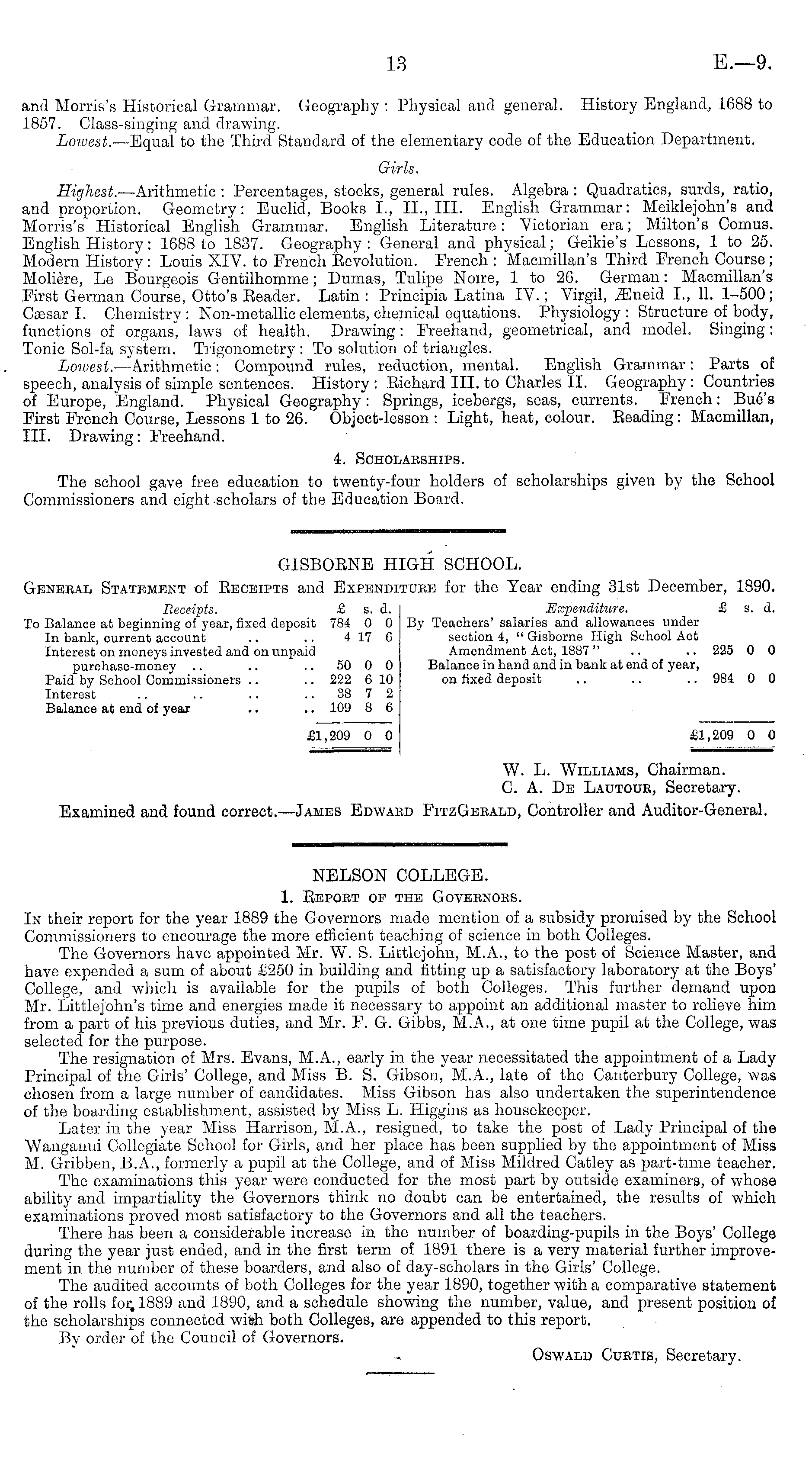 NELSON COLLEGE. 1. Eepoet of the Goveknobs. In their report for the year 1889 the Governors made mention of a subsidy promised by the School Commissioners to encourage the more efficient teaching of science in both Colleges. The Governors have appointed Mr. W. S. Littlejohn, M.A., to the post of Science Master, and have expended a sum of about £250 in building and fitting up a satisfactory laboratory at the Boys' College, and which is available for the pupils of both Colleges. This further demand upon Mr. Littlejohn's time and energies made it necessary to appoint an additional master to relieve him from a part of his previous duties, and Mr. F. G. Gibbs, M.A., at one time pupil at the College, was selected for the purpose. The resignation of Mrs. Evans, M.A., early in the year necessitated the appointment of a Lady Principal of the Girls' College, and Miss B. S. Gibson, M.A., late of the Canterbury College, was chosen from a large number of candidates. Miss Gibson has also undertaken the superintendence of the boarding establishment, assisted by Miss L. Higgins as housekeeper. Later in the year Miss Harrison, M.A., resigned, to take the post of Lady Principal of the Wanganui Collegiate School for Girls, and her place has been supplied by the appointment of Miss M. Gribben, 8.A., formerly a pupil at the College, and of Miss Mildred Catley as part-time teacher. The examinations this year were conducted for the most part by outside examiners, of whose ability and impartiality the Governors think no doubt can be entertained, the results of which examinations proved most satisfactory to the Governors and all the teachers. There has been a considerable increase in the number of boarding-pupils in the Boys' College during the year just ended, and in the first term of 1891 there is a very material further improvement in the number of these boarders, and also of day-scholars in the Girls' College. The audited accounts of both Colleges for the year 1890, together with a comparative statement of the rolls for, 1889 and 1890, and a schedule showing the number, value, and present position of the scholarships connected wish both Colleges, are appended to this report. By order of the Council of Governors. Oswald Cubtis, Secretary.