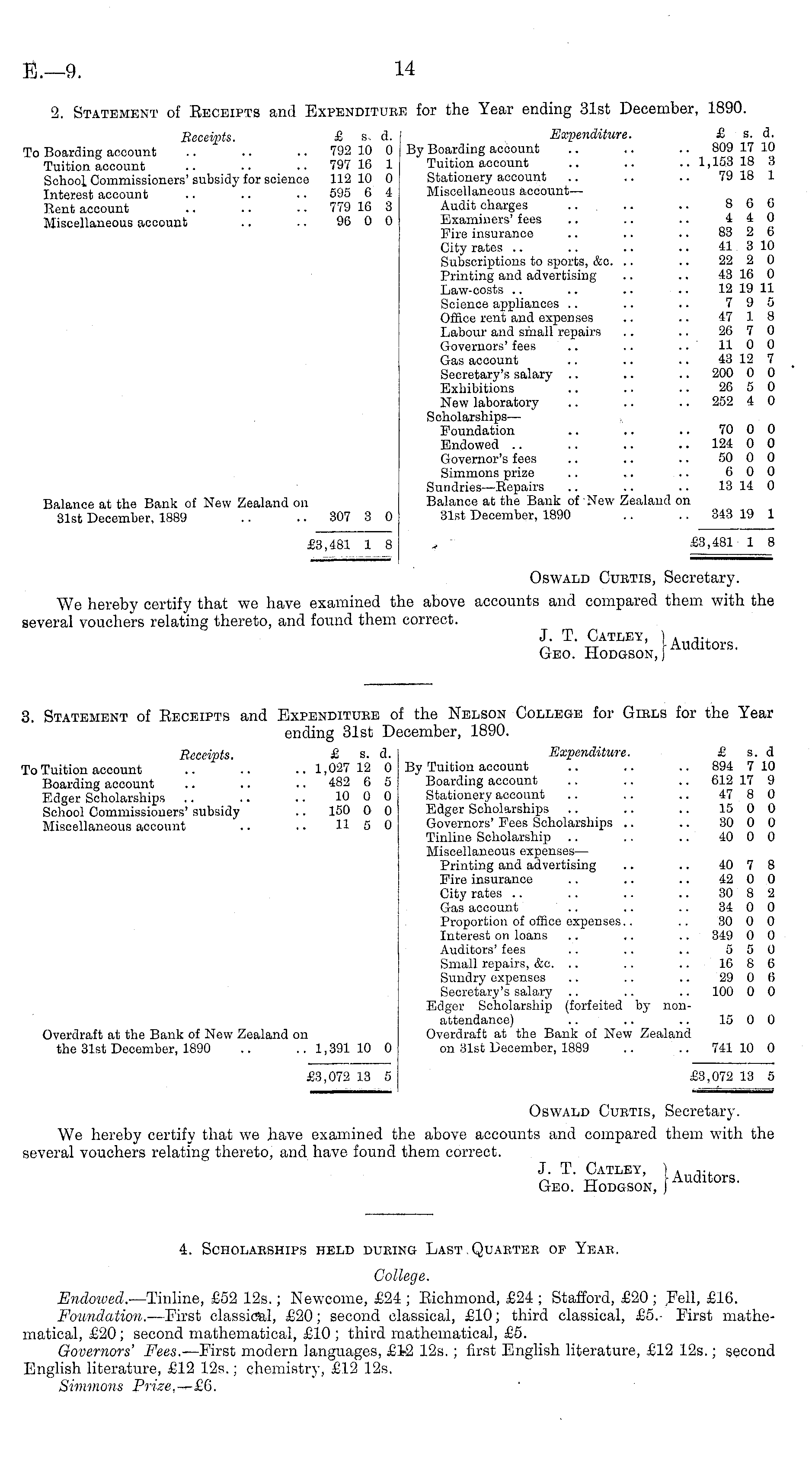 2. Statement of Receipts and Expenditure for the Year ending 31st December, 1890. Receipts. £ s. d. Expenditure. £ s. d. To Boarding account .. .. 792 10 oBy Boarding account .. .. .. 809 17 10 Tuition account .. .. .. 797 1G 1 Tuition account .. .. .. 1,153 18 8 School Commissioners' subsidy for science 112 10 0 Stationery account .. .. .. 79 18 1 Interest account .. .. .. 595 6 4 Miscellaneous accountRent account .. .. .. 779 16 3 Audit charges .. .. .. 8 6 6 Miscellaneous account .. .. 96 0 0 Examiners' fees .. .. .. 4 4 0 Fire insurance .. .. .. 83 2 6 City rates .. .. .. .. 41 310 Subscriptions to sports, &c. .. .. 22 2 0 Printing and advertising .. .. 43 16 0 Law-costs .. . „ .. .. 12 19 11 Science appliances .. .. .. 7 9 5 Office rent and expenses .. .. 47 1 8 Labour and small repairs .. .. 26 7 0 Governors' fees .. .. .. 11 0 0 Gas account .. .. .. 43 12 7 Secretary's salary .. .. .. 200 0 0 Exhibitions .. .. .. 26 5 0 New laboratory .. .. .. 252 4 0 Scholarships— Foundation .. .. .. 70 0 0 Endowed .. .. .. .. 124 0 0 Governor's fees .. .. .. 50 0 0 Simmons prize .. .. .. 6 0 0 Sundries —Repairs .. .. .. 13 14 0 Balance at the Bank of New Zealand on Balance at the Bank of New Zealand on 31st December, 1889 .. .. 307 3 0 31st December, 1890 .. .. 343 19 1 £3,481 18 - £3,481 1 8 Oswald Cubtis, Secretary. We hereby certify that we have examined the above accounts and compared them with the several vouchers relating thereto, and found them correct.