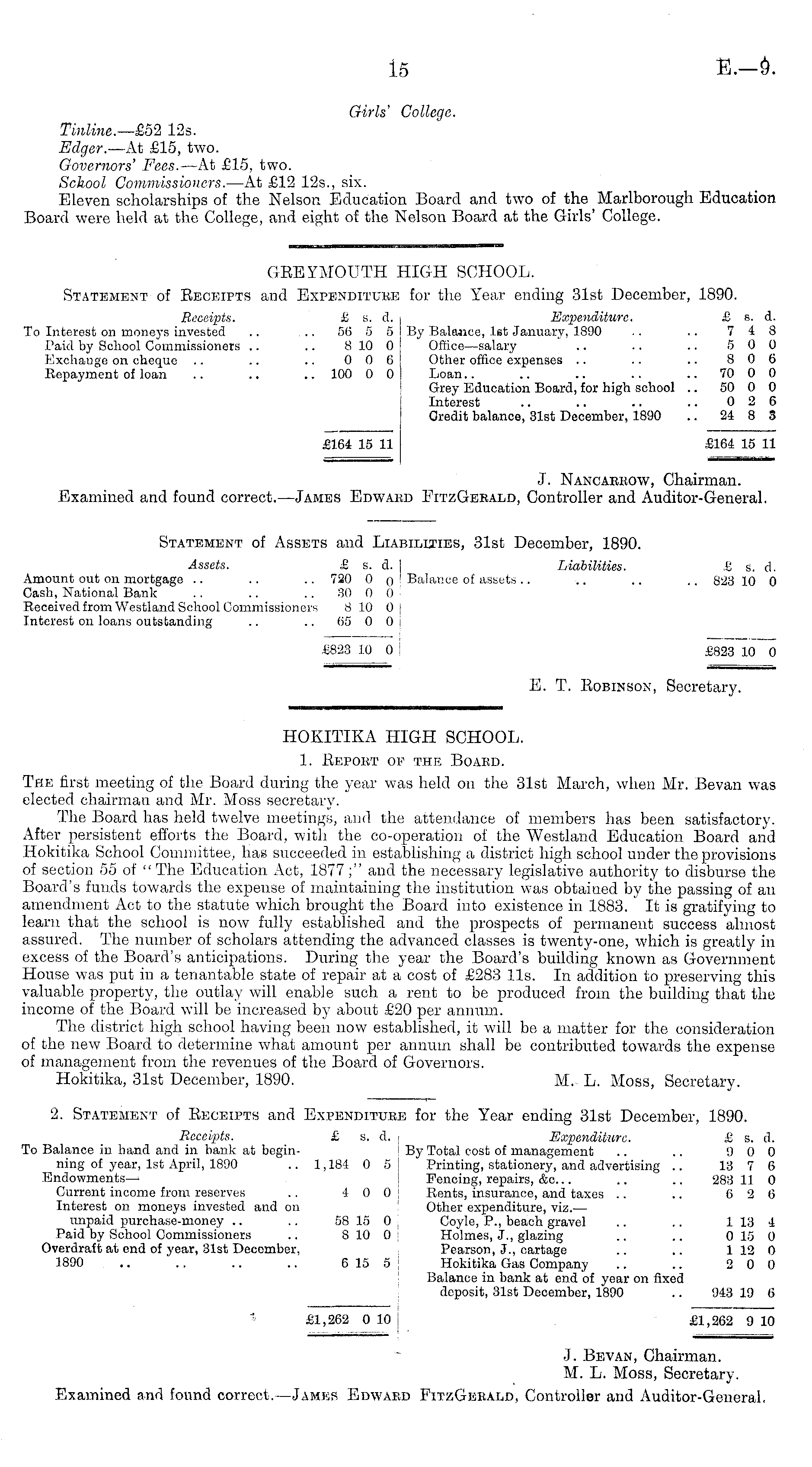 HOKITIKA HIGH SCHOOL. 1. Report, of the Boabd. The first meeting of the Board during the year was held on the 31st March, when Mr. Bevan was elected chairman and Mr. Moss secretary. The Board has held twelve meetings, and the attendance of members has been satisfactory. After persistent efforts the Board, with the co-operation of the Westland Education Board and Hokitika School Committee, has succeeded in establishing a district high school under the provisions of section 55 of " The Education Act, 1877;" and the necessary legislative authority to disburse the Board's funds towards the expense of maintaining the institution was obtained by the passing of an amendment Act to the statute which brought the Board into existence in 1883. It is gratifying to learn that the school is now fully established and the prospects of permanent success 'almost assured. The number of scholars attending the advanced classes is twenty-one, which is greatly in excess of the Board's anticipations. During the year the Board's building known as Government House was put in a tenantable state of repair at a cost of £283 11s. In addition to preserving this valuable property, the outlay will enable such a rent to be produced from the building that the income of the Board will be increased by about £20 per annum. The district high school having been now established, it will be a matter for the consideration of the new Board to determine what amount per annum shall be contributed towards the expense of management from the revenues of the Board of Governors. Hokitika, 31st December, 1890. M. L. Moss, Secretary.