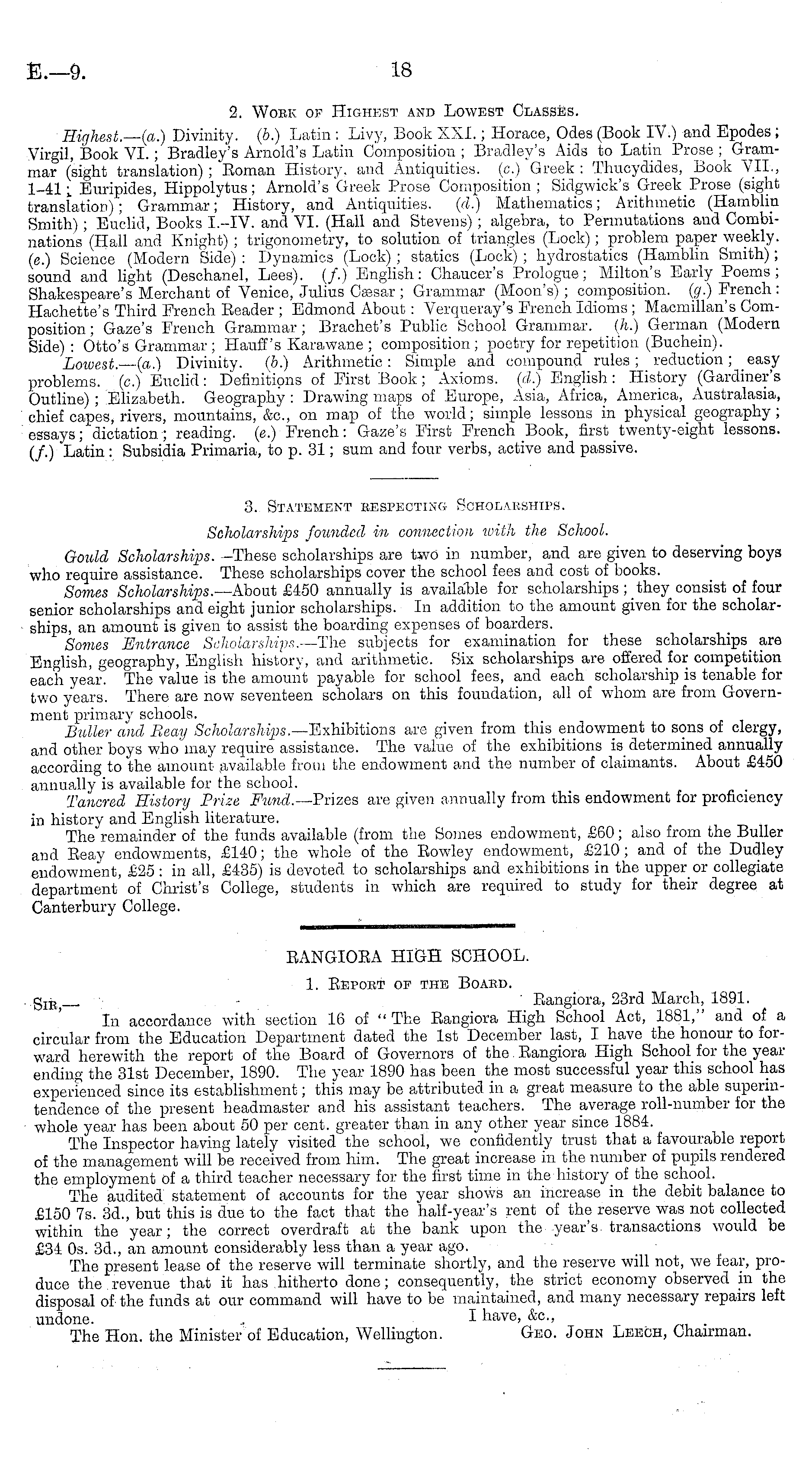 EANGIOEA HIGH SCHOOL. 1. Eepobt op the Boaed. g I j l) __ - ' Eangiora, 23rd March, 1891. In accordance with section 16 of " The Eangiora High School Act, 1881," and of a circular from the Education Department dated the Ist December last, I have the honour to forward herewith the report of the Board of Governors of the Eangiora High School for the year ending the 31st December, 1890. The year 1890 has been the most successful year this school has expeiieneed since its establishment; this may be attributed in a great measure to the able superintendence of the present headmaster and his assistant teachers. The average roll-number for the whole year has been about 50 per cent, greater than in any other year since 1884. The Inspector having lately visited the school, we confidently trust that a favourable report of the management will be received from him. The great increase in the number of pupils rendered the employment of a third teacher necessary for the first time in the history of the school. The audited statement of accounts for the year shows an increase in the debit balance to £150 7s. 3d., but this is due to the fact that the half-year's rent of the reserve was not collected within the year; the correct overdraft at the bank upon the year's transactions would be £34 os. 3d., an amount considerably less than a year ago. The present lease of the reserve will terminate shortly, and the reserve will not, we fear, produce the revenue that it has hitherto done; consequently, the strict economy observed in the disposal of the funds at our command will have to be maintained, and many necessary repairs left undone. I have, &c, The Hon. the Minister of Education, Wellington. Gbo. John Leech, Chairman.
