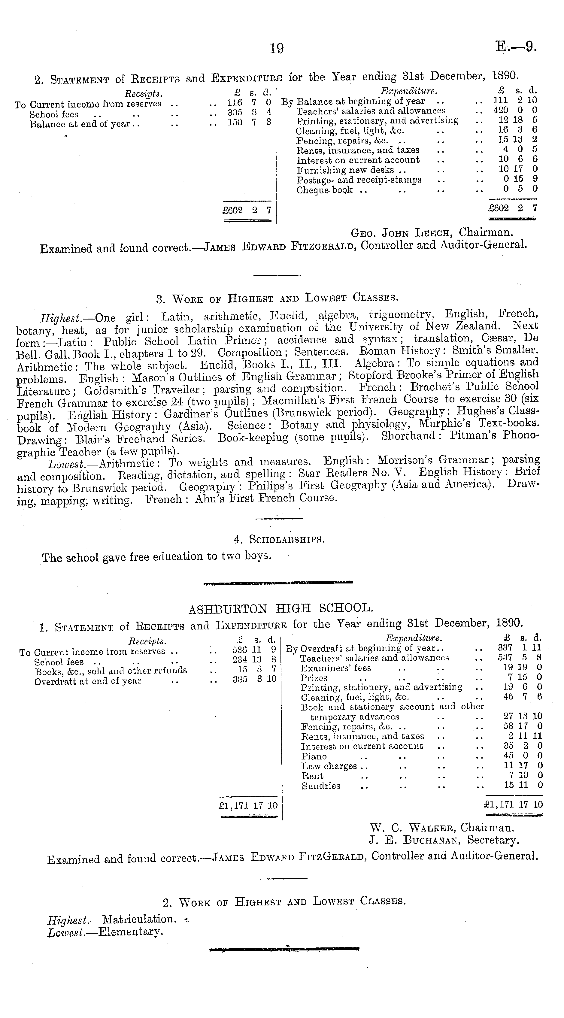 ABHBUETON HIGH SCHOOL. 1. Statement of Receipts and Expenditure for the Year ending 31st December, 1890. Receipts. & s. d. Expenditure. & s. d. To Current income from reserves .. :. 536 11 9 By Overdraft at beginning of year.. .. 337 111 School fees • • • ■ 234 13 8 Teachers' salaries and allowances .. 537 5 8 Books, &c, sold and other refunds .. 15 87 ! Examiners'fees 19 19 0 Overdraft at end of year .. .. 385 3 10; Prizes .. .. .. .. 715 0 Printing, stationery, and advertising .. 19 6 0 Gleaning, fuel, light, &c. .. .. 46 7 0 Book and stationery account and other temporary advances .. .. 27 13 10 Fencing, repairs, &o. .. .. .. 58 17 0 Rents, insurance, and taxes .. .. 211 11 Interest on current account .. .. 35 2 0 Piano .. .. .. .. 45 0 0 Law charges .. .. .. .. 11 17 0 Rent .. .. .. .. 7 10 0 Sundries .. .. .. .. 15 11 0 £1,171 17 10 j £1,171 17 10 W. C. Walker, Chairman. J. E. Buchanan, Secretary. Examined and found correct.—James Edwaed FitzGeeald, Controller and Auditor-General.