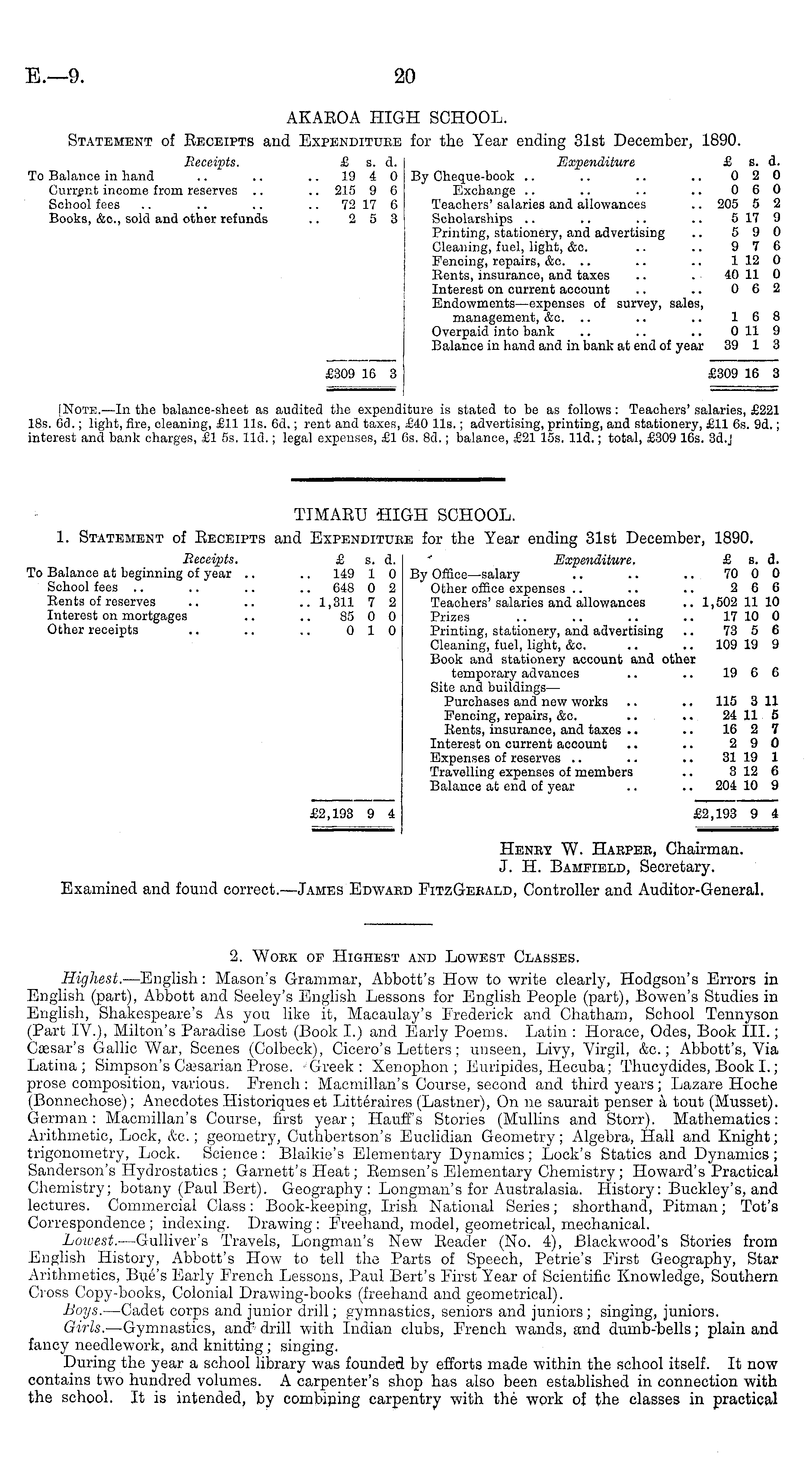TIMAEU HIGH SCHOOL. 1. Statement of Eeceipts and Expenditure for the Year ending 31st December, 1890. Receipts. £ s. d. Expenditure. £ s. d. To Balance at beginning of year .. .. 149 1 0 By Office—salary .. .. .. 70 0 0 School fees .. .. .. .. 648 0 2 Other office expenses .. .. .. 2 6 6 Eents of reserves .. .. .. 1,311 7 2 Teachers'salaries and allowances .. 1,502 1110 Interest on mortgages .. .. 85 0 0 Prizes .. .. .. .. 17 10 0 Other receipts .. .. .. 0 10 Printing, stationery, and advertising .. 73 5 6 Cleaning, fuel, light, &c. .. .. 109 19 9 Book and stationery account and other temporary advances .. .. 19 6 6 Site and buildings— Purchases and new works .. .. 115 311 Fencing, repairs, &a. .. .. 24 11 5 Kents, insurance, and taxes .. .. 16 2 7 Interest on current account .. .. 2 9 0 Expenses of reserves .. .. .. 31 19 1 Travelling expenses of members .. 3 12 6 Balance at end of year .. .. 204 10 9 £2,193 9 4 £2,193 9 4 Heney W. Haepee, Chairman. J. H. Bamfield, Secretary. Examined and found correct.—James Edwakd FitzGebald, Controller and Auditor-General.