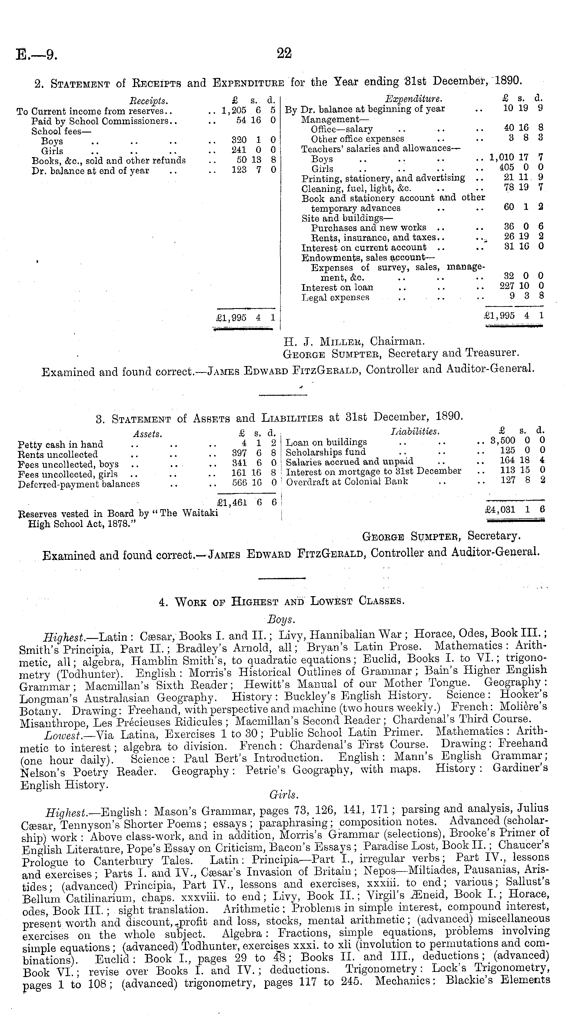 2. Statement of Receipts and Expenditure for the Year ending 31st December, 1890. Receipts. & s. d. Expenditure. & s. d. To Current income from reserves.. ..1,205 65 By Dr. balance at beginning of year .. 10 19 9 Paid by School Commissioners.. .. 54 16 0 ManagementSchool fees— Office—salary .. .. .. 40 lfa 8 Boys .. .. 320 1 0 Other office expenses .. .. o8 6 Girls .. 241 0 0 Teachers' salaries and allowances — Books, &c, sold and other refunds .. 50 13 8 Boys .. .. .. ..1,010 17 7 Dr. balance at end of year .. .. 123 7 0 Girls .. .. .. _ •• 105 0 0 Printing, stationery, and advertising .. 21 11 9 Cleaning, fuel, light, &c. .. .. 78 19 7 Book and stationery account and other temporary advances .. .. 60 1 2 Site and buildings— Purchases and new works .. .. 36 0 6 Rents, insurance, and taxes.. ..„ 26 19 2 Interest on current account .. .. 31 1C 0 , Endowments, sales account— Expenses of survey, sales, management, &c. 32 0 0 Interest on loan .. .. .. 227 10 0 Legal expenses .. .. . • 9 3 8 £1,995" 4 1 £1,995 4 1 H. J. Millek, Chairman. George Sumptee, Secretary and Treasurer. Examined and found correct.—James Edwaed FitzGeeald, Controller and Auditor-General.