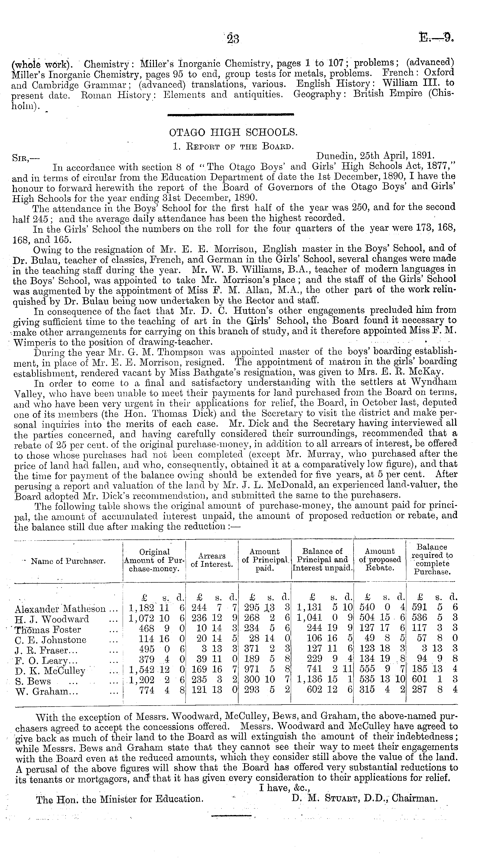OTAGO HIGH SCHOOLS. 1. Report of the Boakd. Sib,— Dunedin, 25th April, 1891. In accordance with section 8 of " The Otago Boys' and Girls' High Schools Act, 1877," and in terms of circular from the Education Department of date the Ist December, 1890, I have the honour to forward herewith the report of the Board of Governors of the Otago Boys' and Girls' High Schools for the year ending 31st December, 1890. The attendance in the Boys' School for the first half of the year was 250, and for the second half 245 ; and the average daiiy attendance has been the highest recorded. In the Girls' School the numbers on the roll for the four quarters of the year were 173, 168, 168, and 165. Owing to the resignation of Mr. E. E. Morrison, English master in the Boys' School, and of Dr. Bulau, teacher of classics, French, and German in the Girls' School, several changes were made in the teaching staff during the year. Mr. W. B. Williams, 8.A., teacher of modem languages in the Boys' School, was appointed to take Mr. Morrison's place ; and the staff of the Girls' School was augmented by the appointment of Miss F. M. Allan, M.A., the other part of the work relinquished by Dr. Bulau being now undertaken by the Rector and staff. In consequence of the fact that Mr. D. C. Hutton's other engagements precluded him from giving sufficient time to the teaching of art in the Girls' School, the Board found it necessary to make other arrangements for carrying on this branch of study, and it therefore appointed Miss F. M. Wimperis to the position of drawing-teacher. • _ - During the year Mr. G. M. Thompson was appointed master of the boys' boarding establishment, in place of Mr. E. E. Morrison, resigned. The appointment of matron in the girls' boarding establishment, rendered vacant by Miss Bathgate's resignation, was given to Mrs. E. R. McKay. In order to come to a final and satisfactory understanding with the settlers at Wyndham Valley, who have been unable to meet their payments for land purchased from the Board on terms, and who have been very urgent in their applications for relief, the Board, in October last, deputed one of its members (the Hon. Thomas Dick) and the Secretary to visit the district and make personal inquiries into the merits of each case. Mr. Dick and the Secretary having interviewed all the parties concerned, and having carefully considered their surroundings, recommended that a rebate of 25 per cent, of the original purchase-money, in addition to all arrears of interest, be offered to those whose purchases had not been completed (except Mr. Murray, who purchased after the price of land had fallen, and who, consequently, obtained it at a comparatively low figure), and that the time for payment of the balance owing should be extended for five years, at 5 per cent. After perusing a report and valuation of the land by Mr. J. L. McDonald, an experienced land-valuer, the Board adopted Mr. Dick's recommendation, and submitted the same to the purchasers. The following table shows the original amount of purchase-money, the amount paid for principal, the amount of accumulated interest unpaid, the amount of proposed reduction or rebate, and the balance still due after making the reduction : —