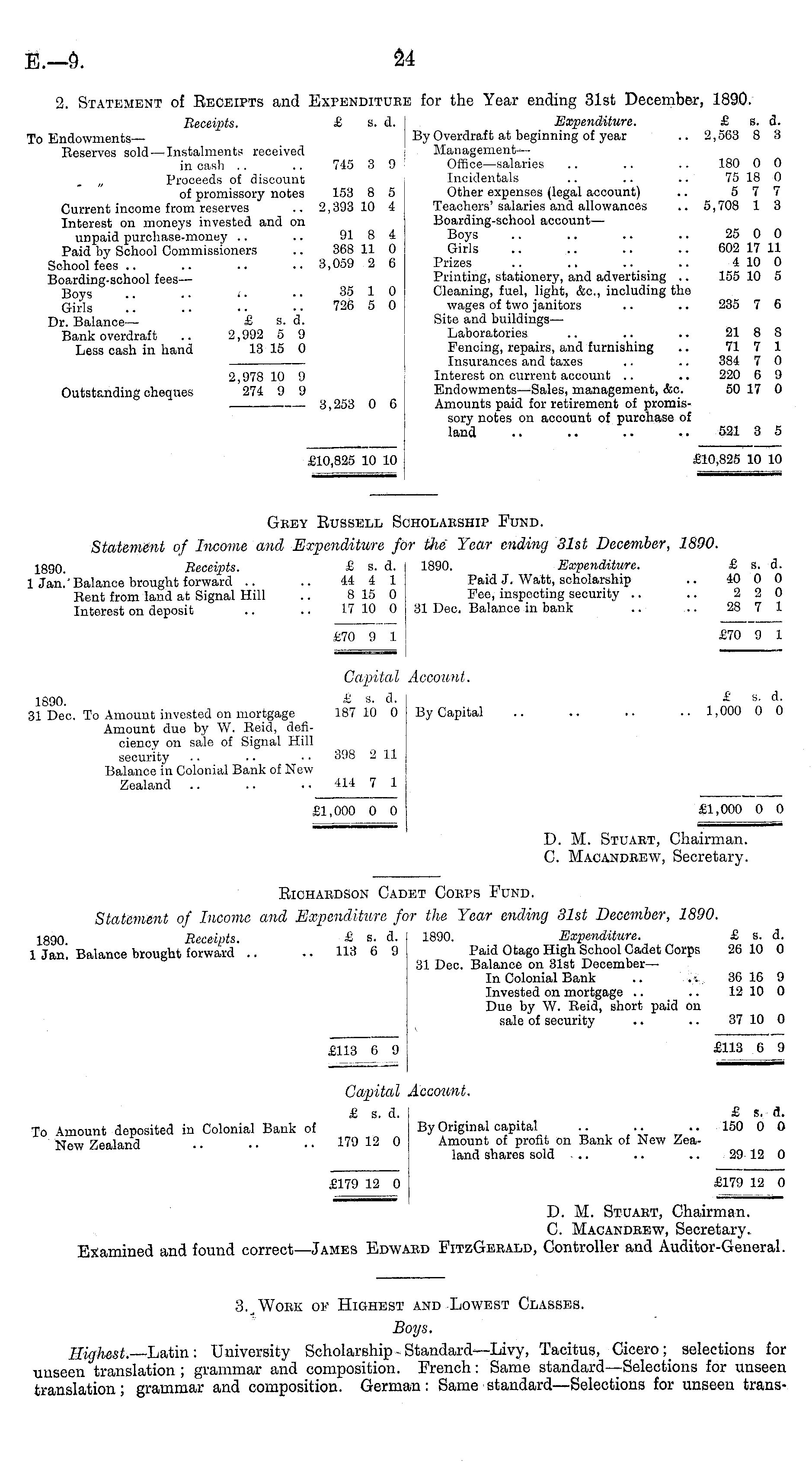 2. Statement of Receipts and Expenditure for the Year ending 31st December, 1890. Receipts. £ s. d. Expenditure. £ s. d. To Endowments— By Overdraft at beginning of year .. 2,563 8 3 Beserves sold — Instalments received Management— in oasli .. .. 745 3 9 Office—salaries .. .. .. 180 0 0 Proceeds of discount Incidentals .. .. .. 75 18 0 of promissory notes 153 8 5 i Other expenses (legal account) .. 5 7 7 Current income from reserves .. 2,393 10 4 '. Teachers'salaries and allowances .. 5,708 1 3 Interest on moneys invested and on Boarding-school account — unpaid purchase-money .. .. 91 8 4 ' Boys .. .. .. .. 25 0 0 Paid by School Commissioners .. 368 11 0 Girls .. .. .. .. 602 17 11 School fees .. .. .. .. 3,059 2 6 Prizes .. .. .. .. 410 0 Boarding-school fees— Printing, stationery, and advertising .. 155 10 5 Boys .. '• •• 35 1 0 Cleaning, fuel, light, &c, including the Girls ~ .. .. 726 5 0 wages of two janitors .. .. 235 7 6 Dr. Balance— £ s. d. Site and buildingsBank overdraft .. 2,992 5 9 Laboratories .. .. .. 21 8 8 Less cash in hand 13 15 0 Fencing, repairs, and furnishing .. 71 7 1 Insurances and taxes .. .. 384 7 0 2,978 10 9 Interest on current account .. .. 220 6 9 Outstanding cheques 274 9 9 Endowments—Sales, management, &c. 50 17 0 y, 253 0 6 Amounts paid for retirement of promissory notes on account of purchase of land .. .. .. .. 521 3 5 £10,825 10 10 £10,825 10 10