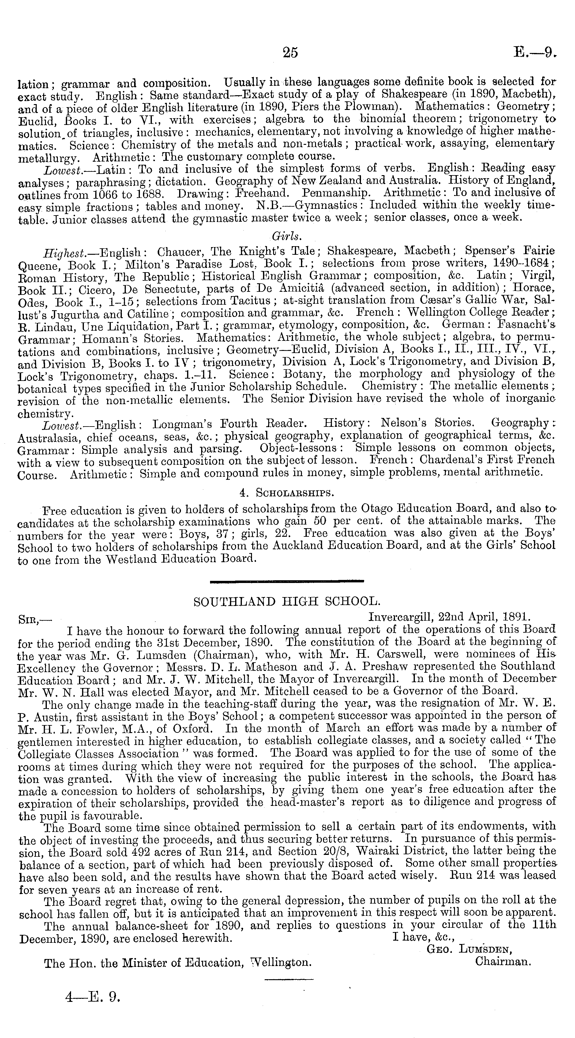 SOUTHLAND HIGH SCHOOL. g IK) Invercargill, 22nd April, 1891. I have the honour to forward the following annual report of the operations of this Board for the period ending the 31st December, 1890. The constitution of the Board at the beginning of the year was Mr. G. Lumsden (Chairman), who, with Mr. H. Carswell, were nominees of His Excellency the Governor ; Messrs. D. L. Matheson and J. A. Preshaw represented the Southland Education Board ; and Mr. J. W. Mitchell, the Mayor of Invercargill. In the month of December Mr. W. N. Hall was elected Mayor, and Mr. Mitchell ceased to be a Governor of the Board. The only change made in the teaching-staff during the year, was the resignation of Mr. W. E. P. Austin, first assistant in the Boys' School; a competent successor was appointed in the person of Mr. H. L. Fowler, M.A., of Oxford. In the month of March an effort was made by a number of gentlemen interested in higher education, to establish collegiate classes, and a society called "The Collegiate Classes Association " was formed. The Board was applied to for the use of some of the rooms at times during which they were not required for the purposes of the school. The application was granted. With the view of increasing the public interest in the schools, the Board has made a concession to holders of scholarships, by giving them one year's free education after the expiration of their scholarships, provided the head-master's report as to diligence and progress of the pupil is favourable. The Board some time since obtained permission to sell a certain part of its endowments, with the object of investing the proceeds, and thus securing better returns. In pursuance of this permission, the Board sold 492 acres of Eun 214, and Section 20/8, Wairaki District, the latter being the balance of a section, part of which had been previously disposed of. Some other small properties have also been sold, and the results have shown that the Board acted wisely. Eun 214 was leased for seven years at an increase of rent. The Board regret that, owing to the general depression, the number of pupils on the roll at the school has fallen off, but it is anticipated that an improvement in this respect will soon be apparent. The annual balance-sheet for 1890, and replies to questions in your circular of the 11th December, 1890, are enclosed herewith. I have, &c, Geo. Lumsden, The Hon. the Minister of Education, Wellington. Chairman.