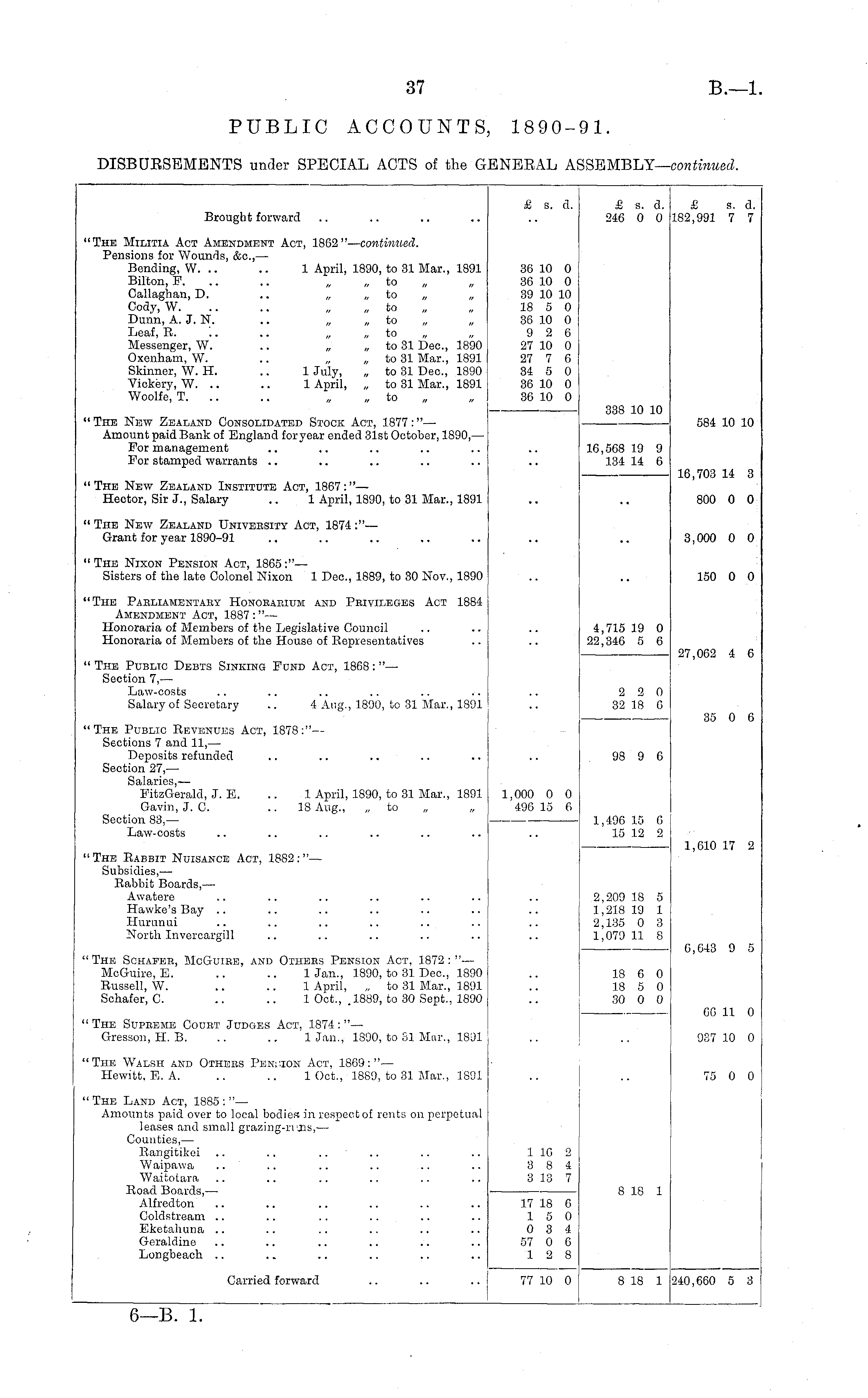 £ s. a. £ s. a. 246 0 0 & s. d. 182,991 7 7 Brought forward "The Militia Act Amendment Act, 1862" — continued. Pensions for Wounds, &c, — Bending, W. .. .. 1 April, 1890, to 31 Mar., 1891 Bilton, F. .. .. „ „ to Callaghan, D. .. „ „ to „ „ Cody, W. .. „ „ to Dunn, A. J. N. .. „ „ to Leaf, R. '.. .. „ „ to „ „ Messenger, W. .. „ to 31 Dec, 1890 Oxenham, W. .. „ „ to 31 Mar., 1891 Skinner, W. H. .. 1 July, „ to 31 Deo., 1890 Vickery, W. .. .. 1 April, „ to 31 Mar., 1891 Woolfe, T. .. .. „ „ to 36 10 0 36 10 0 39 10 10 18 5 0 36 10 0 9 2 6 27 10 0 27 7 6 34 5 0 36 10 0 36 10 0 " The New Zealand Consolidated Stock Act, 1877 :" — Amount paid Bank of England foryear ended 31st October, 1890, — For management For stamped warrants i 338 10 10 584 10 10 10,568 19 9 134 14 6 16,703 14 3 "The New Zealand Institute Act, 1867:" — Hector, Sir J., Salary .. 1 April, 1890, to 31 Mar., 1891 800 0 0 "The New Zealand University Act, 1874:" — Grant for year 1890-91 3,000 0 0 " The Nixon Pension Act, 1865 :"— Sisters of the late Colonel Nixon 1 Dec, 1889, to 30 Nov., 1890 150 0 0 "The Pabliamentaky Honobaeium and Privileges Act 1884 Amendment Act, 1887 :"— Honoraria of Members of the Legislative Council Honoraria of Members of the House of Representatives 4,715 19 0 22,346 5 6 27,062 4 6 " The Public Debts Sinking Fund Act, 1868: " — Section 7, — Law-costs Salary of Secretary .. 4 Aug., 1890, to 31 Mar., 1891 2 2 0 32 18 0 35 0 6 "The Public Revenues Act, 1878:" — Sections 7 and 11, — Deposits refunded Section 27,— Salaries, — FitzGerald, J. E. .. 1 April, 1890, to 31 Mar., 1891 Gavin, J. C. .. 18 Aug., „ to Section 83,— Law-costs 1,000 0 0 496 15 6 98 9 6 1,496 15 G 15 12 2 1,610 17 2 "The Rabbit Nuisance Act, 1882:"— Subsidies, — Rabbit Boards, — Awatere Hawke's Bay Hurunui North Invercargill 2,209 18 5 1,218 19 1 2,135 0 3 1,079 11 8 :l The Schafee, McGuiee, and Oihebs Pension Act, 1872 : " — McGuire, E. .. .. Uan., 1890, to 31 Dec, 1890 Russell, W. .. .. 1 April, „ to 31 Mar., 1891 Schafer, C. .. .. 1 Oct., 1889, to 30 Sept., 1890 6,6-43 9 5 18 6 0 18 5 0 30 0 0 G6 11 0 'The Supreme Couet Judges Act, 1874:"— Gresson, H. B. .. .. 1 Jan., 1890, to SI Mar., 1801 937 10 0 : 'The Walsh and Othisus Pension Act, 1869:"— Hewitt. E. A. .. .. 1 Oct., 1889, to 81 Mar., 1891 75 0 0 "The Land Act, 1885:"— Amounts paid over to local bodies in respect of rents on perpetual leases and small grazing-rrjis,— Counties, — Rangitikei Waipawa Waitotara Road Boards, — Alfredton Coldstroam Eketahuna Geraldino Longbeach 1 1C 2 3 8 4 3 13 7 8 18 1 17 18 6 15 0 0 3 4 57 0 6 12 8 Carried forward 77 10 0 8 18 1 240,660 5 3