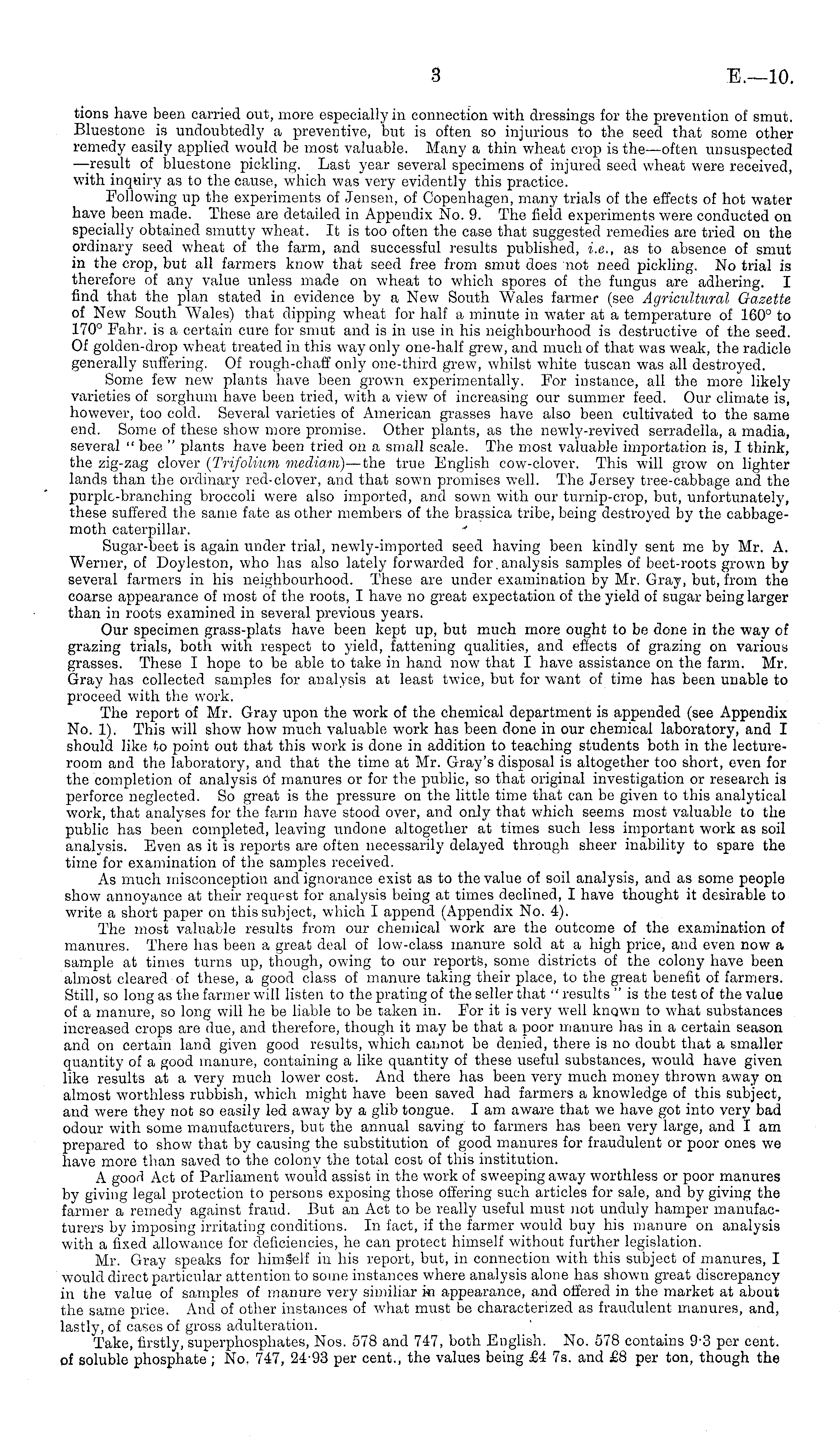 tions have been carried out, more especially in connection with dressings for the prevention of smut. Bluestone is undoubtedly a preventive, but is often so injurious to the seed that some other remedy easily applied would be most valuable. Many a thin wheat crop is the—often unsuspected —result of bluestone pickling. Last year several specimens of injured seed wheat were received, with inquiry as to the cause, which was very evidently this practice. Following up the experiments of Jensen, of Copenhagen, many trials of the effects of hot water have been made. These are detailed in Appendix No. 9. The fieid experiments were conducted on specially obtained smutty wheat. It is too often the case that suggested remedies are tried on the ordinary seed wheat of the farm, and successful results published, i.e., as to absence of smut in the crop, but all farmers know that seed free from smut does not need pickling. No trial is therefore of any value unless made on wheat to which spores of the fungus are adhering. I find that the plan stated in evidence by a New South Wales farmer (see Agricultural Gazette of New South Wales) that dipping wheat for half a minute in water at a temperature of 160° to 170° Fahr. is a certain cure for smut and is in use in his neighbourhood is destructive of the seed. Of golden-drop wheat treated in this way only one-half grew, and much of that was weak, the radicle generally suffering. Of rough-chaff only one-third grew, whilst white tuscan was all destroyed. Some few new plants have been grown experimentally. For instance, all the more likely varieties of sorghum have been tried, with a view of increasing our summer feed. Our climate is, however, too cold. Several varieties of American grasses have also been cultivated to the same end. Some of these show more promise. Other plants, as the newly-revived serradella, a madia, several " bee " plants have been tried on a small scale. The most valuable importation is, I think, the zig-zag clover (Trifolium mediam) —the true English cow-clover. This will grow on lighter lands than the ordinary red-clover, and that sown promises well. The Jersey tree-cabbage and the purple-branching broccoli were also imported, and sown with our turnip-crop, but, unfortunately, these suffered the same fate as other members of the brassica tribe, being destroyed by the cabbagemoth caterpillar. Sugar-beet is again under trial, newly-imported seed having been kindly sent me by Mr. A. Werner, of Doyleston, who has also lately forwarded for.analysis samples of beet-roots grown by several farmers in his neighbourhood. These are under examination by Mr. Gray, but, from the coarse appearance of most of the roots, I have no great expectation of the yield of sugar being larger than in roots examined in several previous years. Our specimen grass-plats have been kept up, but much more ought to be done in the way of grazing trials, both with respect to yield, fattening qualities, and effects of grazing on various grasses. These I hope to be able to take in hand now that I have assistance on the farm. Mr. Gray has collected samples for analysis at least twice, but for want of time has been unable to proceed with the work. The report of Mr. Gray upon the work of the chemical department is appended (see Appendix No. 1). This will show how much valuable work has been done in our chemical laboratory, and I should like to point out that this work is done in addition to teaching students both in the lectureroom and the laboratory, and that the time at Mr. Gray's disposal is altogether too short, even for the completion of analysis of manures or for the public, so that original investigation or research is perforce neglected. So great is the pressure on the little time that can be given to this analytical work, that analyses for the farm have stood over, and only that which seems most valuable to the public has been completed, leaving undone altogether at times such less important work as soil analysis. Even as it is reports are often necessarily delayed through sheer inability to spare the time for examination of the samples received. As much misconception and ignorance exist as to the value of soil analysis, and as some people show annoyance at their requpst for analysis being at times declined, I have thought it desirable to write a short paper on this subject, which I append (Appendix No. 4). The most valuable results from our chemical work are the outcome of the examination of manures. There has been a great deal of low-class manure sold at a high price, and even now a sample at times turns up, though, owing to our reports, some districts of the colony have been almost cleared of these, a good class of manure taking their place, to the great benefit of farmers. Still, so long as the farmer will listen to the prating of the seller that " results " is the test of the value of a manure, so long will he be liable to be taken in. For it is very well known to what substances increased crops are due, and therefore, though it may be that a poor manure has in a certain season and on certain land given good results, which cannot be denied, there is no doubt that a smaller quantity of a good manure, containing a like quantity of these useful substances, would have given like results at a very much lower cost. And there has been very much money thrown away on almost worthless rubbish, which might have been saved had farmers a knowledge of this subject, and were they not so easily led away by a glib tongue. lam aware that we have got into very bad odour with some manufacturers, but the annual saving to farmers has been very large, and I am prepared to show that by causing the substitution of good manures for fraudulent or poor ones we have more than saved to the colony the total cost of this institution. A good Act of Parliament would assist in the work of sweeping away worthless or poor manures by giving legal protection to persons exposing those offering suc