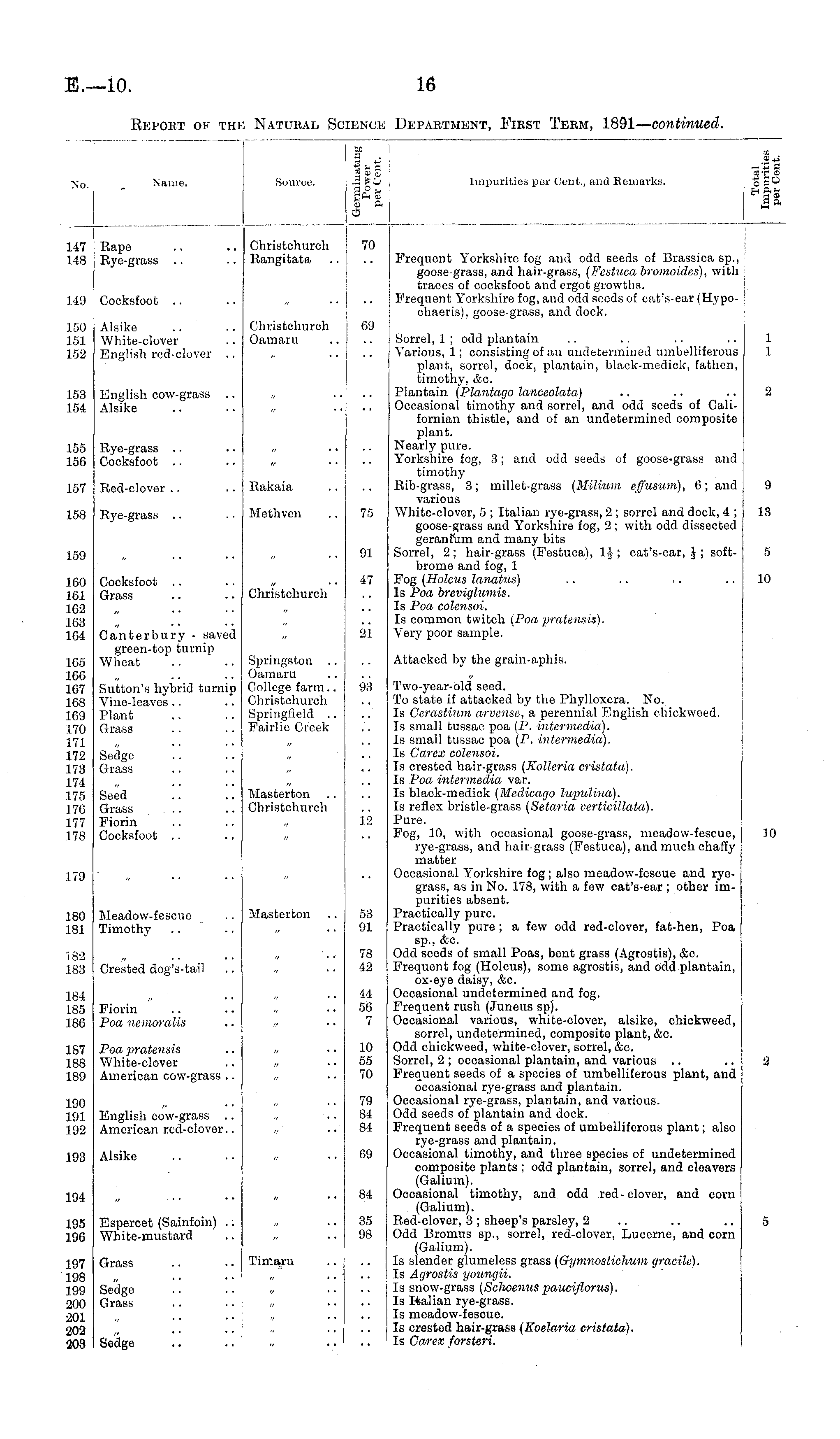 No. Name. Source. I jl m P £ ■ d o ,. 3 a i I** Impurities per Cent., and Kemarks. % s 1-^ i 147 148 Rape Rye-grass Christchurch Rangitata 70 | Frequent Yorkshire fog and odd seeds of Brassica sp., goose-grass, and hair-grass, (Festuca bromoides), with traces of cocksfoot and ergot growths, Frequent Yorkshire fog, and odd seeds of cat's-ear (Hypo- '■■ chaeris), goose-grass, and dock. 1!J Cocksfoot .50 .51 .52 Alsike White-clover English red-clover .. Christchurch Oamaru 69 Sorrel, 1 ; odd plantain .. .. .. .. 1 Various, 1; consisting of an undetermined umbelliferous 1 plant, sorrel, dock, plantain, black-medick, fathen, timothy, &c. Plantain (Plantago lanceolata) .. .. .. 2 Occasional timothy and sorrel, and odd seeds of Californian thistle, and of an undetermined composite plant. Nearly pure. Yorkshire fog, 3; and odd seeds of goose-grass and ] timothy Rib-grass, 3; millet-grass {Miliicm effuswn), 6; and { 9 various White-clover, 5 ; Italian rye-grass, 2 ; sorrel and dock, 4 ; 13 goose-grass and Yorkshire fog, 2 ; with odd dissected geranfixm and many bits Sorrel, 2; hair-grass (Festuca), l.J ; cat's-ear, }; soft- 5 brome and fog, 1 Fog (Holcus lanatus) .. .. ,. 10 Is Poa breviglumis. Is Poa colensoi. Is common twitch (Poa pratensis). Very poor sample. 1 1 English cow-grass .. Alsike 2 .53 5-1. .56 56 Rye-grass Cocksfoot .57 Red-clover Rakaia 9 .58 Rye-grass llethven 75 13 91 5 .59 60 6J 62 .68 .64 Cocksfoot Grass Christchurch 47 10 Canterhury - saved green-top turnip Wheat 21 .65 .66 .67 .68 69 70 71 .72 .73 .74 75 76 77 78 Sutton's hybrid turnip Vine-leaves Plant Grass Bpringston .. Oamaru College farm.. Christchurch Springfield .. Pairlie Creek 93 Attacked by the grain-aphis. Two-year-old seed. To state if attacked by the Phylloxera. No. Is Cerastium arvense, a perennial English chickweed. Is small tussac poa (P. intermedia). Is small tussac poa (P. intermedia). Is Carex colensoi. Is crested hair-grass (Kolleria cristata). Is Poa intermedia var. Is black-medick (Medicago lupulina). Is reflex bristle-grass (Setaria verticillata). Pure. Fog, 10, with occasional goose-grass, meadow-fescue, 10 rye-grass, and hair-grass (Festuca), and much chaffy matter Occasional. Yorkshire fog ; also meadow-fescue and ryegrass, as in No. 178, with a few cat's-ear ; other impurities absent. Practically pure. Practically pure ; a few odd red-clover, fat-hen, Poa sp., &c. Odd seeds of small Poas, bent grass (Agrostis), &c. Frequent fog (Holcus), some agrostis, and odd plantain, ox-eye daisy, &c. Occasional undetermined and fog. Frequent rush (Juneus sp). Occasional various, white-clover, alsike, chickweed, sorrel, undetermined, composite plant, &o. Odd chickweed, white-clover, sorrel, &c. Sorrel, 2 ; occasional plantain, and various Frequent seeds of a species of umbelliferous plant, and occasional rye-grass and plantain. Occasional rye-grass, plantain, and various. Odd seeds of plantain and dock. Frequent seeds of a species of umbelliferous plant; also rye-grass and plantain. Occasional timothy, and three species of undetermined composite plants ; odd plantain, sorrel, and cleavers (Galium). Occasional timothy, and odd red-clover, and corn (Galium). Red-clover, 3; sheep's parsley, 2 .. .. .. 5 Odd Bromus sp., sorrel, red-clover, Lucerne, and corn (Galium). Is slender glumeless grass (Gymnostichum yracile). Is Agrostis youngii. Is snow-grass (Schoenus pauciflorus), Is Italian rye-grass. Is meadow-fescue. Is crested hair-grass {Koelaria. cristata). Is Carex forsteri. Sedge Grass Seed '.. Grass .. Fiorin Cocksfoot Masterton Christchurch 12 10 70 .80 .81 Meadow-fescue Timothy Masterton 53 91 .82 88 Crested dog's-tail 78 42 .84 .35 86 Fiorin Poa nemoralis 44 56 7 .87 88 89 Poa pratensis White-clover American cow-grass .. 10 55 70 2 .90 .91 ■92 English cow-grass .. American red-clover.. 79 84 84 .93 Alsike 69 84 M .95 .90 Espercet (Sainfoin) .. White-mustard 35 98 .97 .08 199 !00 iOl >m 203 Grass Timaru Sedge Grass Sedge .. .. I