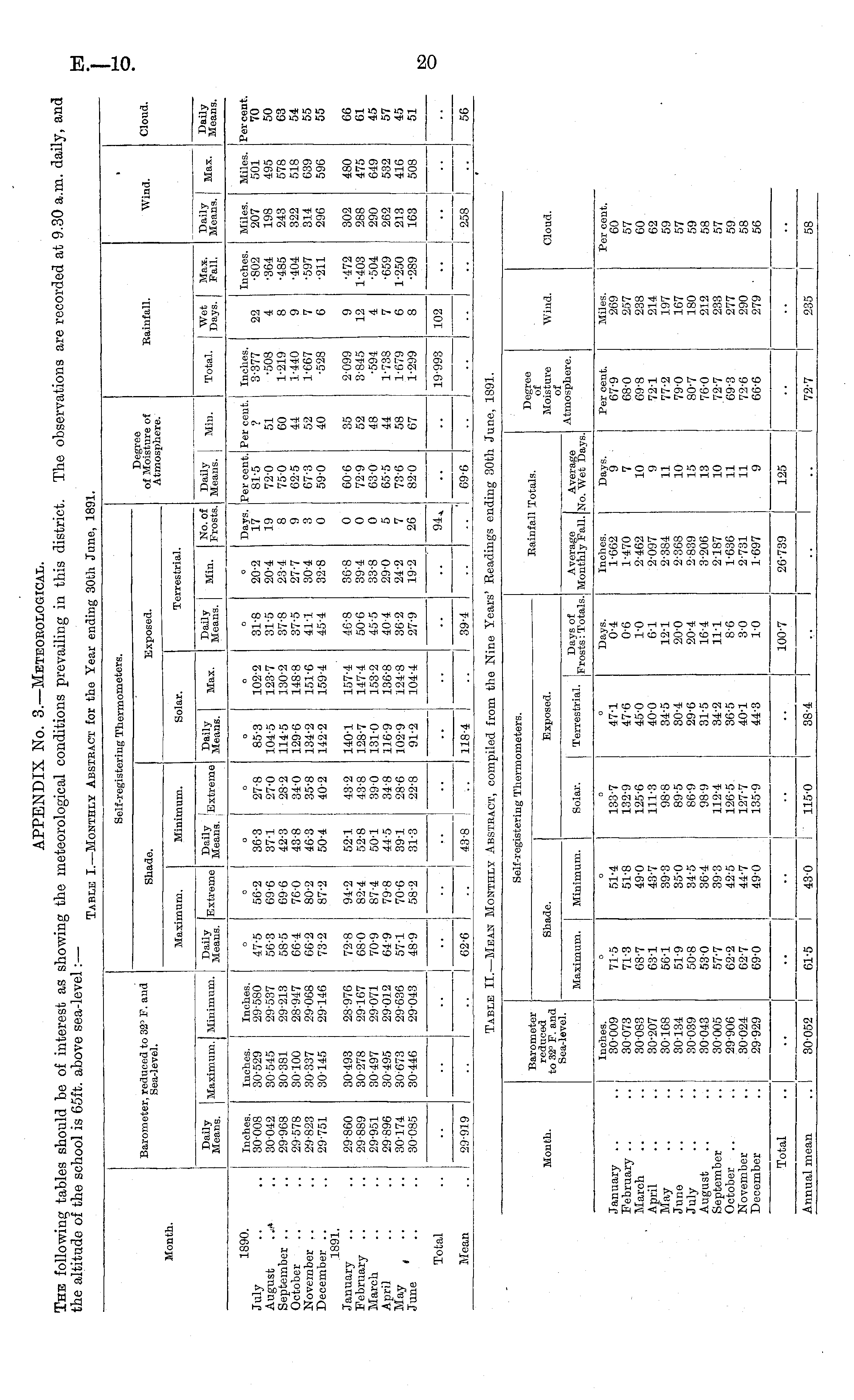 APPENDIX No. 3.—Meteorological. The following tables should be of interest as showing the meteorological conditions prevailing in this district. The observations are recorded at 9.30 a.m. daily, and the altitude of the school is 65ft. above sea-level:— Table I.—Monthly Abstract for the Year ending 30th June, 1891.