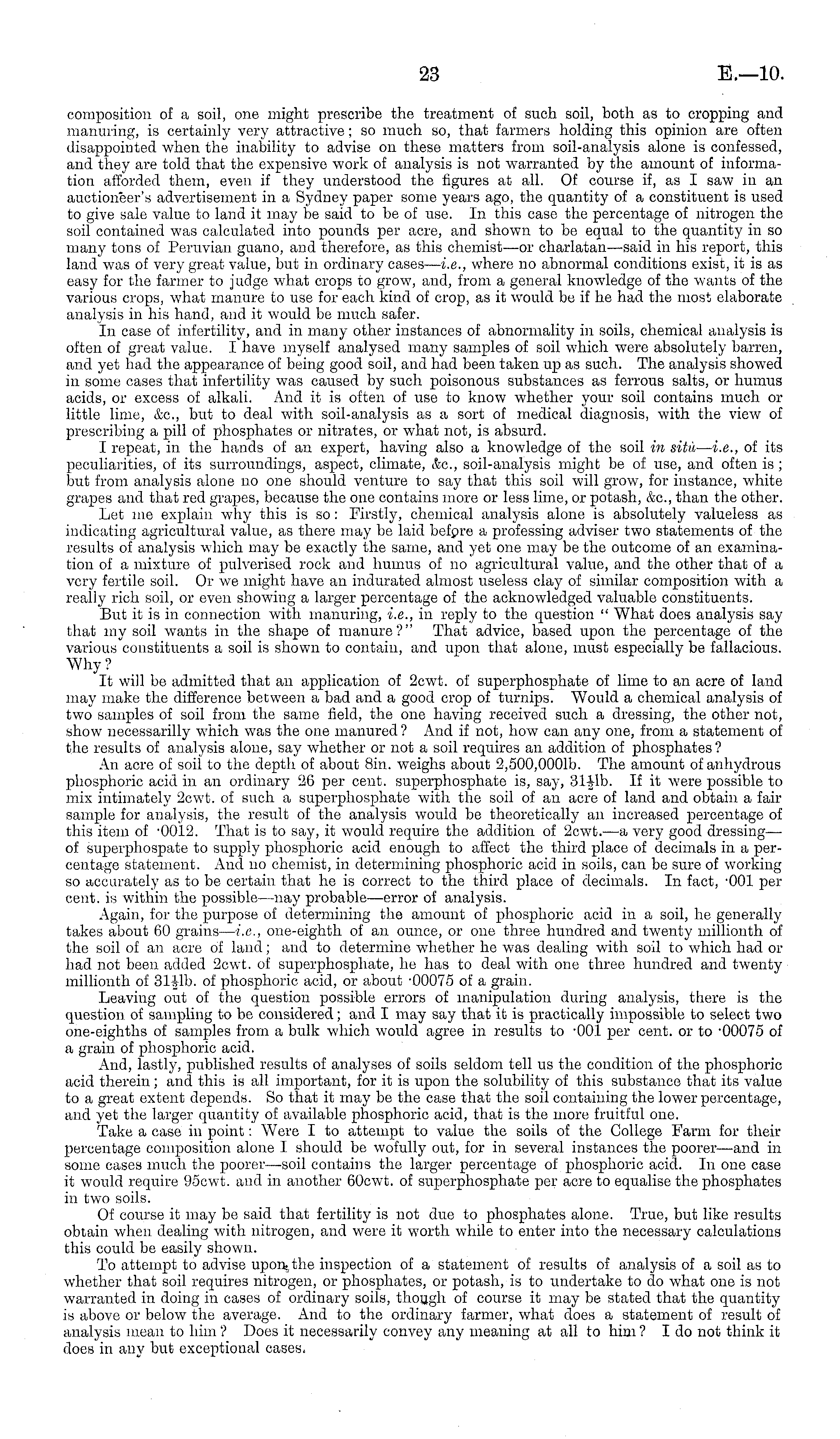 composition of a soil, one might prescribe the treatment of such soil, both as to cropping and manuring, is certainly very attractive; so much so, that farmers holding this opinion are often disappointed when the inability to advise on these matters from soil-analysis alone is confessed, and they are told that the expensive work of analysis is not warranted by the amount of information afforded them, even if they understood the figures at all. Of course if, as I saw in an auctioneer's advertisement in a Sydney paper some years ago, the quantity of a constituent is used to give sale value to land it may be said to be of use. In this case the percentage of nitrogen the soil contained was calculated into pounds per acre, and shown to be equal to the quantity in so many tons of Peruvian guano, and therefore, as this chemist—or charlatan—said in his report, this land was of very great value, but in ordinary cases— i.e., where no abnormal conditions exist, it is as easy for the farmer to judge what crops to grow, and, from a general knowledge of the wants of the various crops, what manure to use for each kind of crop, as it would be if he had the most elaborate analysis in his hand, and it would be much safer. In case of infertility, and in many other instances of abnormality in soils, chemical analysis is often of great value. I have myself analysed many samples of soil which were absolutely barren, and yet had the appearance of being good soil, and had been taken up as such. The analysis showed in some cases that infertility was caused by such poisonous substances as ferrous salts, or humus acids, or excess of alkali. And it is often of use to know whether your soil contains much or little lime, &c, but to deal with soil-analysis as a sort of medical diagnosis, with the view of prescribing a pill of phosphates or nitrates, or what not, is absurd. 1 repeat, in the hands of an expert, having also a knowledge of the soil in situ — i.e., of its peculiarities, of its surroundings, aspect, climate, &c, soil-analysis might be of use, and often is; but from analysis alone no one should venture to say that this soil will grow, for instance, white grapes and that red grapes, because the one contains more or less lime, or potash, &c, than the other. Let me explain why this is so: Firstly, chemical analysis alone is absolutely valueless as indicating agricultural value, as there may be laid befpre a professing adviser two statements of the results of analysis which may be exactly the same, and yet one may be the outcome of an examination of a mixture of pulverised rock and humus of no agricultural value, and the other that of a very fertile soil. Or we might have an indurated almost useless clay of similar composition with a really rich soil, or even showing a larger percentage of the acknowledged valuable constituents. But it is in connection with manuring, i.e., in reply to the question " What does analysis say that any soil wants in the shape of manure?" That advice, based upon the percentage of the various constituents a soil is shown to contain, and upon that alone, must especially be fallacious. Why ? It will be admitted that an application of 2cwt. of superphosphate of lime to an acre of land may make the difference between a bad and a good crop of turnips. Would a chemical analysis of two samples of soil from the same field, the one having received such a dressing, the other not, show necessarilly which was the one manured? And if not, how can any one, from a statement of the results of analysis alone, say whether or not a soil requires an addition of phosphates? An acre of soil to the depth of about Bin. weighs about 2,500,0001b. The amount of anhydrous phosphoric acid in an ordinary 26 per cent, superphosphate is, say, 31-J-lb. If it were possible to mix intimately 2cwt. of such a superphosphate with the soil of an acre of land and obtain a fair sample for analysis, the result of the analysis would be theoretically an increased percentage of this item of '0012. That is to say, it would require the addition of 2cwt. —a very good dressing— of superphospate to supply phosphoric acid enough to affect the third place of decimals in a percentage statement. And no chemist, in determining phosphoric acid in soils, can be sure of working so accurately as to be certain that he is correct to the third place of decimals. In fact, -001 per cent, is within the possible —nay probable —error of analysis. Again, for the purpose of determining the amount of phosphoric acid in a soil, he generally takes about 60 grains— i.e., one-eighth of an ounce, or one three hundred and twenty millionth of the soil of an acre of laud; and to determine whether he was dealing with soil to which had or had not been added 2cwt. of superphosphate, he has to deal with one three hundred and twenty millionth of 31ilb. of phosphoric acid, or about -00075 of a grain. Leaving out of the question possible errors of manipulation during analysis, there is the question of sampling to be considered; and I may say that it is practically impossible to select two one-eighths of samples from a bulk which would agree in results to -001 per cent, or to -00075 of a grain of phosphoric acid. And, lastly, published results of analyses of soils seldom tell us the condition of the phosphoric acid therein; and this is all important, for it is upon the solubility of this substance that its value to a great extent depends. So that it may be the case that the soil containing the lower percentage, and yet the larger quantity of available phosphoric acid, that is the more fruitful one. Take a case in point: Were I to attempt to value the soils of the College Farm for their percentage composition alone I should be wofully out, for in several instances the poorer—and in some cases much the poorer—-soil contains the larger percentage of phosphoric acid. In one case it would require 95cwt. and in another 60cwt. of superphosphate per acre t