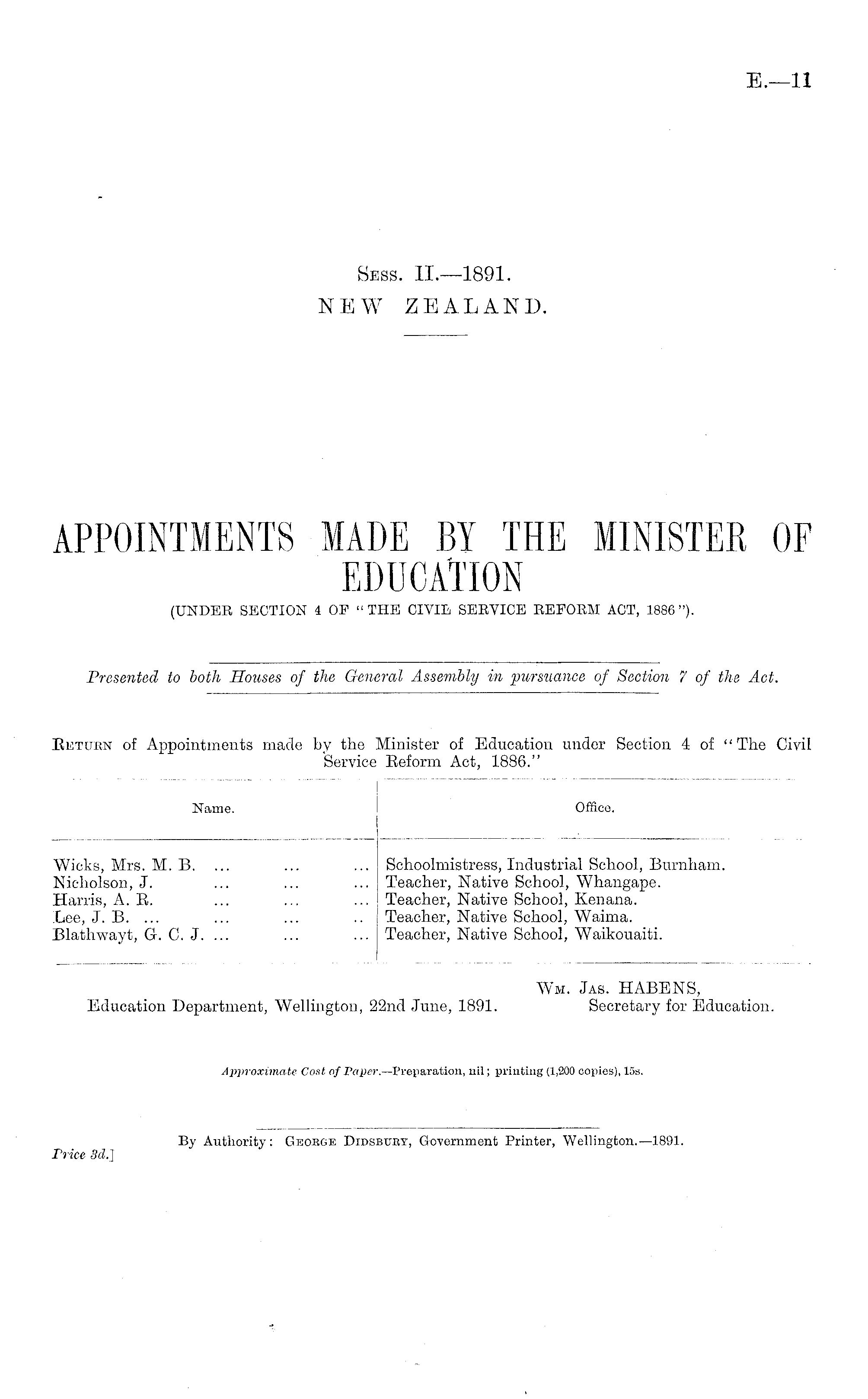 Wm. Jas. HABENS, Education Department, Wellington, 22nd June, 1891. Secretary for Education. Approximate Cost of Paper. — Preparation, nil; printing (1,200 copies), 15s.