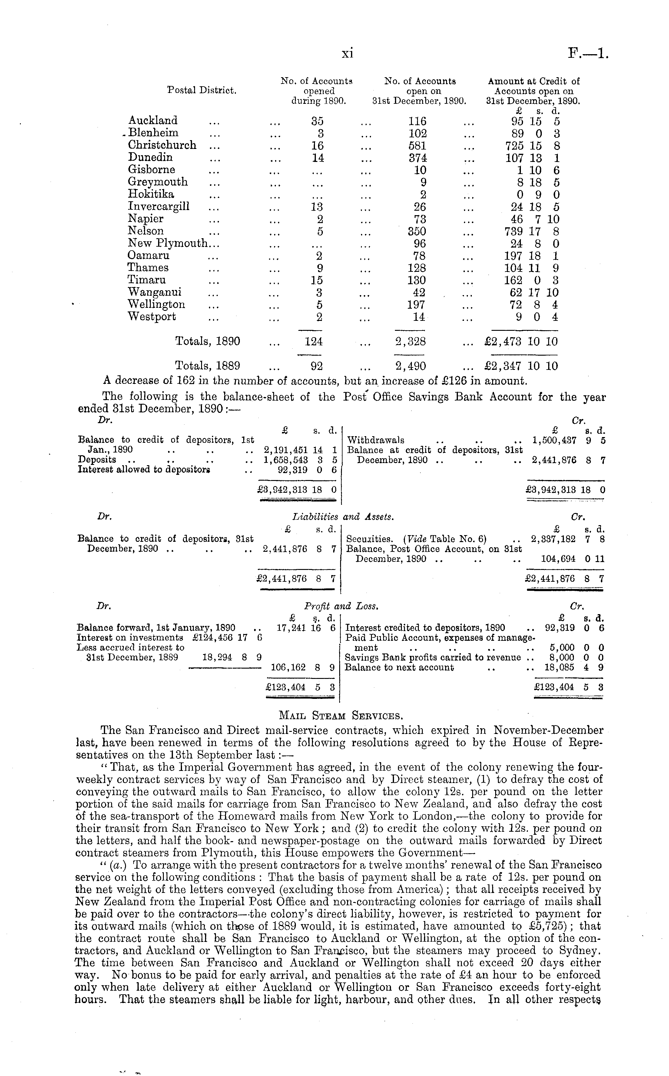 No. of Accounts No. of Accounts Amount at Credit of Postal District. opened open on Accounts open on during 1890. 31st December, 1890. 31st December, 1890. £ s. d. Auckland ... ... 35 ... 116 ... 95 15 5 -Blenheim ... ... 3 ... 102 ... 89 0 3 Christchurch ... ... 16 ... 581 ... 725 15 8 Dunedin ... ... 14 ... 374 ... 107 13 1 Gisborne ... ... ... ... 10 ... 1 10 6 Greymouth ... ... ... ... 9 ... 818 5 Hokitika ... ... 2 ... 0 9 0 Invercargill ... ... 13 ... 26 ... 24 18 5 Napier ... ... 2 ... 73 ... 46 7 10 Nelson ... ... 5 ... 350 ... 739 17 8 New Plymouth... ... 96 ... 24 8 0 Oamaru ... ... 2 ... 78 ... 197 18 1 Thames ... ... 9 ... 128 ... 104 11 9 Timaru ... ... 15 ... 130 ... 162 0 3 Wanganui ... ... 3 ... 42 ... 62 17 10 Wellington ... ... 5 ... 197 ... 72 8 4 Westport ... ... 2 ... 14 ... 9 0 4 Totals, 1890 ... 124 ... 2,328 ... £2,473 10 10 Totals, 1889 ... 92 ... 2,490 ... £2,347 10 10 A decrease of 162 in the number of accounts, but an increase of £126 in amount. The following is the balance-sheet of the Post Office Savings Bank Account for the year ended 31st December, 1890 :— Dr. Cr. £ s. d. £ s. d. Balance to credit of depositors, Ist Withdrawals .. .. .. 1,500,437 9 5 Jan., 1890 .. .. .. 2,191,451 14 1 Balance at credit of depositors, 31st Deposits .. .. .. .. 1,658,543 3 5 December, 1890 .. .. .. 2,441,876 8 7 Interest allowed to depositors .. 92,319 0 6 £3,942,313 18 0 £3,942,313 18 0 Dr. Liabilities and Assets. Cr. £ s. d. £ s. d. Balance to credit of depositors, 31st Securities. (Fide Table No. 6) .. 2,337,182 7 8 December, 1890 .. .. .. 2,441,876 8 7 Balance, Post Office Account, on 31st December, 1890 .. .. .. 104,694 0 11 £2,441,876 8 7 £2,441,876 8 7 ______^__ , — ■ - Dr. Profit and Loss. Cr. & ?. d. £ s. d. Balance forward, Ist January, 1890 .. 17,24116 6 Interest credited to depositors, 1890 .. 92,319 0 6 Interest on investments £124,456 17 C Paid Public Account, expenses of manageLess accrued interest to ment .. .. .. .. 5,000 0 0 31st December, 1889 18,294 8 9 Savings Bank profits carried to revenue .. 8,000 0 0 106,162 8 9 Balance to next account .. .. 18,085 4 9 £123,404 5 3 £123,404 5 3 Mail Steam Services. The San Francisco and Direct mail-service contracts, which expired in November-December last, have been renewed in terms of the following resolutions agreed to by the House of Representatives on the 13th September last : — " That, as the Imperial Government has agreed, in the event of the colony renewing the fourweekly contract services by way of San Francisco and by Direct steamer, (1) to defray the cost of conveying the outward mails to San Francisco, to allow the colony 12s. per pound on the letter portion of the said mails for carriage from San Francisco to New Zealand, and also defray the cost of the sea-transport of the Homeward mails from New York to London, —the colony to provide for their transit from San Francisco to New York ; and (2) to credit the colony with 12s. per pound on the letters, and half the book- and newspaper-postage on the outward mails forwarded by Direct contract steamers from Plymouth, this House empowers the Government—• " (a.) To arrange with the present contractors for a twelve months' renewal of the San Francisco service on the following conditions : That the basis of payment shall be a rate of 12s. per pound on the net weight of the letters conveyed (excluding those from America); that all receipts received by New Zealand from the Imperial Post Office and non-contracting colonies for carriage of mails shall be paid over to the contractors—the colony's direct liability, however, is restricted to payment for its outward mails (which on those of 1889 would, it is estimated, have amounted to £5,725); that the contract route shall be San Francisco to Auckland or Wellington, at the option of the contractors, and Auckland or Wellington to San Francisco, but the steamers may proceed to Sydney. The time between San Francisco and Auckland or Wellington shall not exceed 20 days either way. No bonus to be paid for early arrival, and penalties at the rate of £4 an hour to be enforced only when late delivery at either Auckland or Wellington or San Francisco exceeds forty-eight hours. That the steamers shall be liable for light, harbour, and other dues. In all other respects