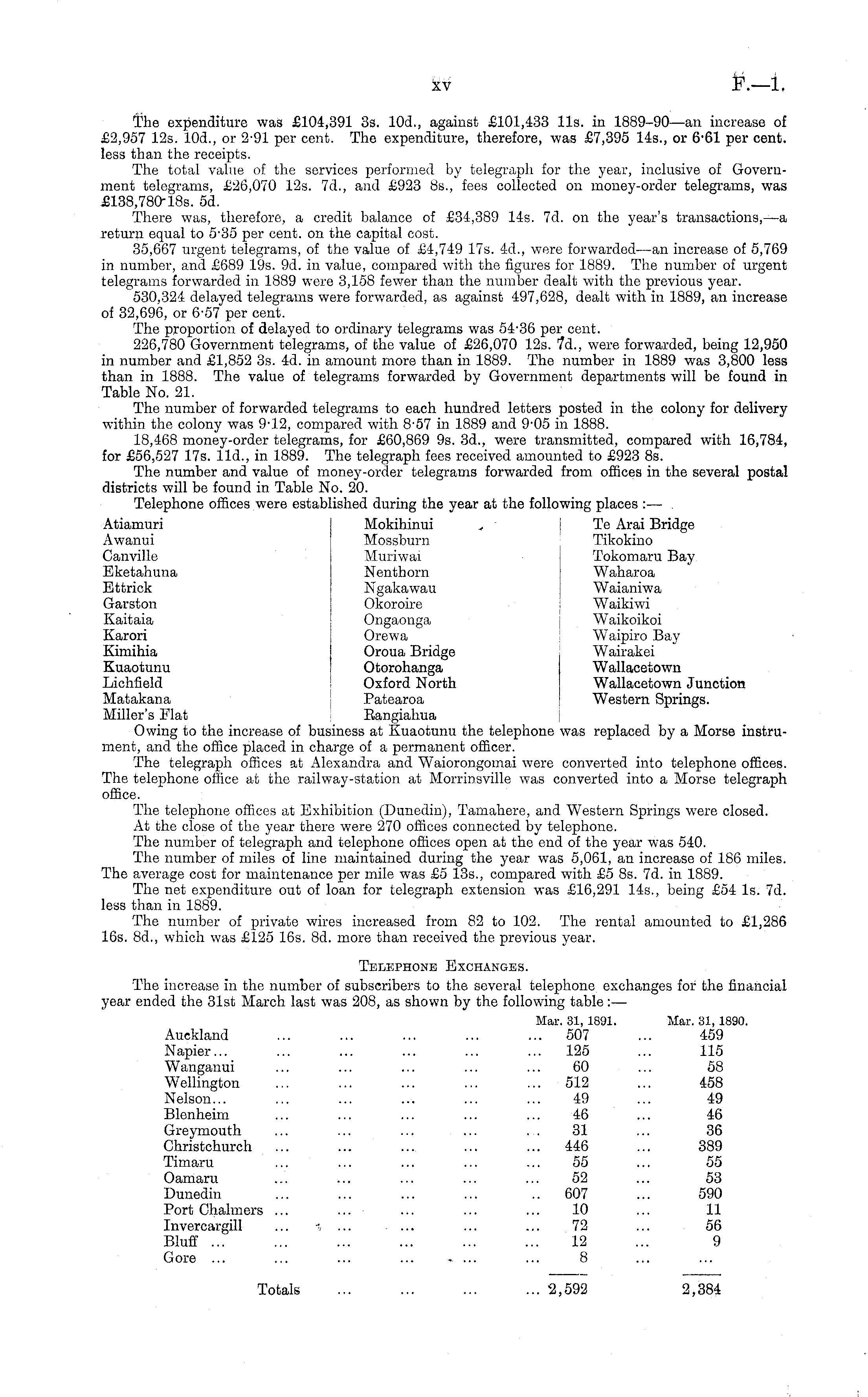 'ftie expenditure was £104,391 3s. 10d., against £101,433 lis. in 1889-90 —an increase of £2,957 12s. 10d., or 2-91 per cent. The expenditure, therefore, was £7,395 145., or 6-61 per cent, less than the receipts. The total value of the services performed by telegraph for the year, inclusive of Government telegrams, £26,070 12s. 7d., and £923 Bs., fees collected on money-order telegrams, was £138,780-18s. sd. There was, therefore, a credit balance of £34,389 14s. 7d. on the year's transactions, —a return equal to 5-35 per cent, on the capital cost. 35,667 urgent telegrams, of the value of £4,749 17s. 4d., were forwarded—an increase of 5,769 in number, and £689 19s. 9d. in value, compared with the figures for 1889. The number of urgent telegrams forwarded in 1889 were 3,158 fewer than the number dealt with the previous year. 530,324 delayed telegrams were forwarded, as against 497,628, dealt with in 1889, an increase of 32,696, or 6-57 per cent. The proportion of delayed to ordinary telegrams was 54-36 per cent. 226,780 Government telegrams, of the value of £26,070 12s. 7d., were forwarded, being 12,950 in number and £1,852 3s. 4d. in amount more than in 1889. The number in 1889 was 3,800 less than in 1888. The value of telegrams forwarded by Government departments will be found in Table No. 21. The number of forwarded telegrams to each hundred letters posted in the colony for delivery within the colony was 9-12, compared with 8-57 in 1889 and 9-05 in 1888. 18,468 money-order telegrams, for £60,869 9s. 3d., were transmitted, compared with 16,784, for £56,527 17s. lid., in 1889. The telegraph fees received amounted to £923 Bs. The number and value of money-order telegrams forwarded from offices in the several postal districts will be found in Table No. 20. Telephone offices were established during the year at the following places :—■ . Atiamuri Mokihinui „ Te Arai Bridge Awanui Mossburn Tikokino Canville Muriwai Tokomaru Bay Eketahuna Nenthorn Waharoa Ettrick Ngakawau Waianiwa Garston Okoroire Waikiwi Kaitaia Ongaonga Waikoikoi Karori Orewa Waipiro Bay Kimihia Oroua Bridge Wairakei Kuaotunu Otorohanga Wallacetown Lichfield Oxford North Wallacetown Junction Matakana Patearoa Western Springs. Miller's Flat Rangiahua Owing to the increase of business at Kuaotunu the telephone was replaced by a Morse instrument, and the office placed in charge of a permanent officer. The telegraph offices at Alexandra and Waiorongomai were converted into telephone offices. The telephone office at the railway-station at Morrinsville was converted into a Morse telegraph office. The telephone offices at Exhibition (Dunedin), Tamahere, and Western Springs were closed. At the close of the year there were 270 offices connected by telephone. The number of telegraph and telephone offices open at the end of the year was 540. The number of miles of line maintained during the year was 5,061, an increase of 186 miles. The average cost for maintenance per mile was £5 135., compared with £5 Bs. 7d. in 1889. The net expenditure out of loan for telegraph extension was £16,291 145., being £54 Is. 7d. less than in 1889. The number of private wires increased from 82 to 102. The rental amounted to £1,286 16s. Bd., which was £125 16s. Bd. more than received the previous year. Telephone Exchanges. The increase in the number of subscribers to the several telephone exchanges for the financial year ended the 31st March last was 208, as shown by the following table: — Mar. 31, 1891. Mar. 31, 1890. Auckland ... ... ... ... ... 507 ... 459 Napier... ... ... ... ... ... 125 ... 115 Wanganui ... ... ... ... ... 60 ... 58 Wellington ... ... ... ... ... 512 ... 458 Nelson... ... ... ... ... ... 49 ... 49 Blenheim ... ... ... ... ... 46 ... 46 Greymouth ... ... ... ... . . 31 ... 36 Christchurch ... ... ... ... ... 446 ... 389 Timaru ... ... ... ... ... 55 ... 55 Oamaru ... ... ... ... ... 52 ... 53 Dunedin ... ... ... ... .. 607 ... 590 Port Chalmers ... ... ... ... ... 10 ... 11 Invercargill ... %;■< ... ... ... ... 72 ... 56 Bluff ... ... ... ... ... ... 12 ... 9 Gore ... ... ... ... » ... ... 8 Totals 2,592 2,384