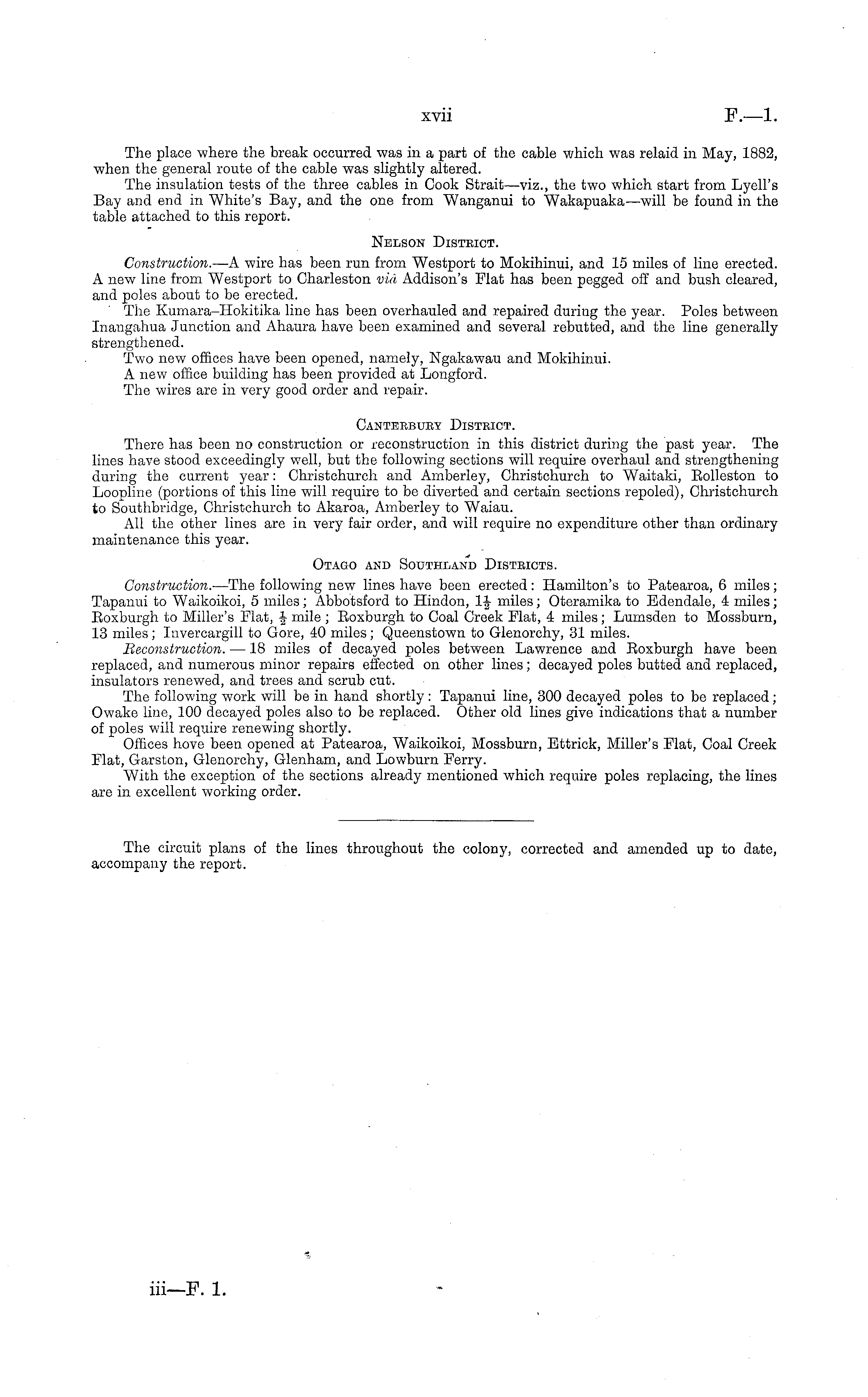 The place where the break occurred was in a part of the cable which was relaid in May, 1882, when the general route of the cable was slightly altered. The insulation tests of the three cables in Cook Strait—viz., the two which start from Lyell's Bay and end in White's Bay, and the one from Wanganui to Wakapuaka—will be found in the table attached to this report. Nelson District. Construction. —A wire has been run from Westport to Mokihinui, and 15 miles of line erected. A new line from Westport to Charleston via Addison's Flat has been pegged off and bush cleared, and poles about to be erected. The Kumara-Hokitika line has been overhauled and repaired during the year. Poles between Inangahua Junction and Ahaura have been examined and several rebutted, and the line generally strengthened. Two new offices have been opened, namely, Ngakawau and Mokihinui. A new office building has been provided at Longford. The wires are in very good order and repair. Canterbury District. There has been no construction or reconstruction in this district during the past year. The lines have stood exceedingly well, but the following sections will require overhaul and strengthening during the current year: Christchurch and Amberley, Christchurch to Waitaki, Rolleston to Loopline (portions of this line will require to be diverted and certain sections repoled), Christchurch to Southbridge, Christchurch to Akaroa, Amberley to Waiau. All the other lines are in very fair order, and will require no expenditure other than ordinary maintenance this year. Otago and Southland Districts. Construction. —The following new lines have been erected : Hamilton's to Patearoa, 6 miles; Tapanui to Waikoikoi, 5 miles; Abbotsford to Hindon, 1-J miles; Oteramika to Edendale, 4 miles; Roxburgh to Miller's Flat, _- mile ; Roxburgh to Coal Creek Flat, 4 miles; Lumsden to Mossburn, 13 miles; Invercargill to Gore, 40 miles; Queenstown to Glenorchy, 31 miles. Reconstruction. —18 miles of decayed poles between Lawrence and Roxburgh have been replaced, and numerous minor repairs effected on other lines; decayed poles butted and replaced, insulators renewed, and trees and scrub cut. The following work will be in hand shortly : Tapanui line, 300 decayed poles to be replaced; Owake line, 100 decayed poles also to be replaced. Other old lines give indications that a number of poles will require renewing shortly. Offices hove been opened at Patearoa, Waikoikoi, Mossburn, Ettrick, Miller's Flat, Coal Creek Flat, Garston, Glenorchy, Glenham, and Lowburn Ferry. With the exception of the sections already mentioned which require poles replacing, the lines are in excellent working order.