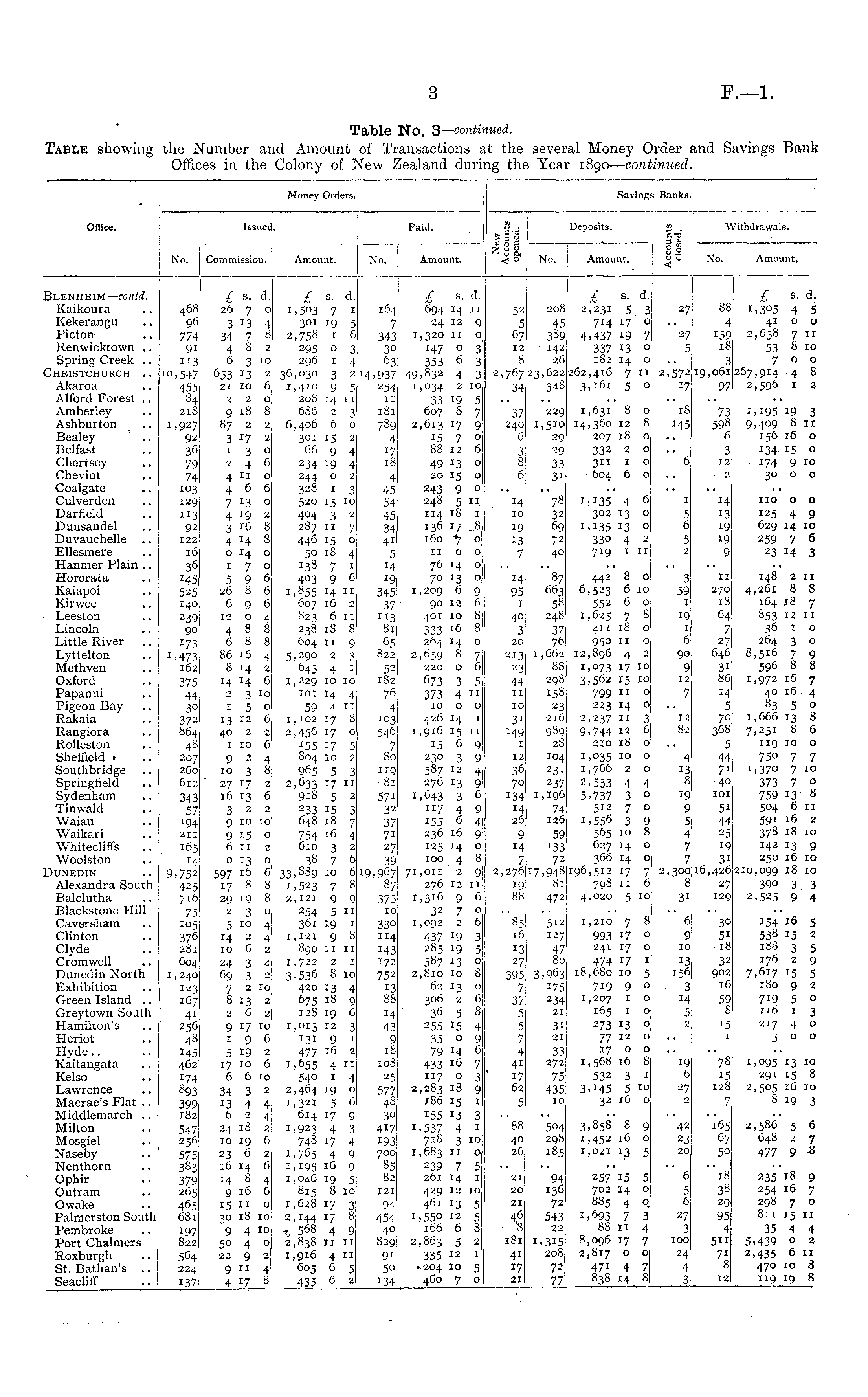 Table No. 3—continued. Table showing the Number and Amount of Transactions at the several Money Order and Savings Bank Offices in the Colony of New Zealand during the Year 1890 — continued.