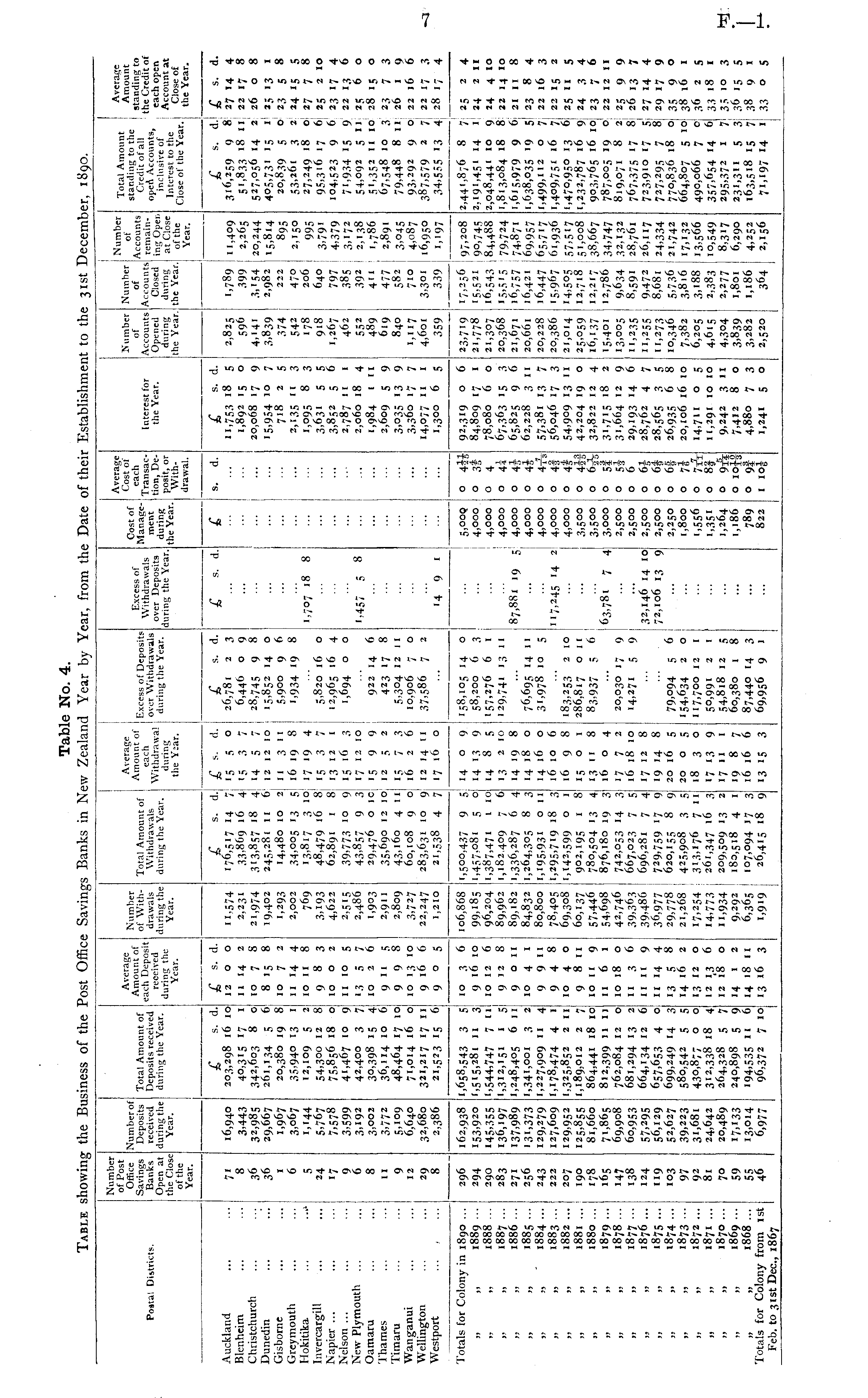 Table No. 4. Table showing the Business of the Post Office Savings Banks in New Zealand Year by Year, from the Date of their Establishment to the 31st December, 1890.