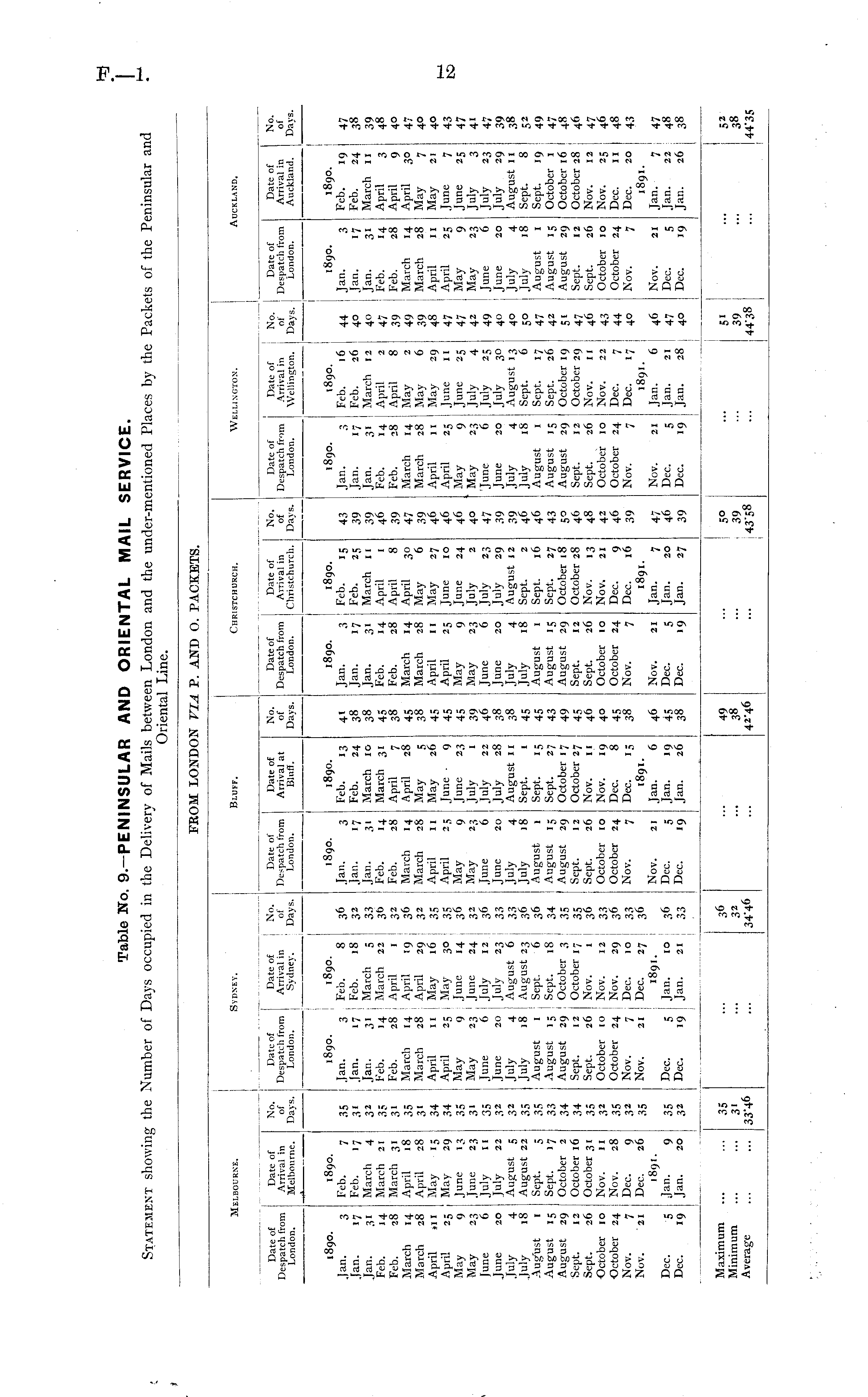 FROM LONDON VIA P. AND 0. PACKETS. Mi ELBOURNE. Sydney. Bluff. Christchurch. Wellington. Auckland. I Date of Despatch from ; London. Date of No. Arrival in of Melbourne. Days. No. of Days. Date of Date of , No. Despatch from Arri%al in of London. Sydney. ' Days. Date of Despatch from London. Date of Arrival at Bluff. No. of Days. Date of Despatch from London. Date of Ai'rival in Christchurch. No. of Days. Date of Date of Despatch from Arrival in London. Wellington. No. Date of of Despatch from Days. London. Date of Arrival in Auckland. No. of Days. 1890. Jan. 3 Jan. 17 Jan. 31 Feb. 14 Feb. 28 March 14 March 28 April 1 1 April 25 j May 9 May 23 I June 6 j June 20 ] July 4 July 18 Aug'ust 1 August 15 August 29 Sept. 12 Sept. 26 October 10 October 24 Nov. 7 J Nov. 21 1890. Feb. 7 35 ; Feb. 17 31 March 4 3 2 ' i March 21 35 J March 31 31 April 18 i 35 April 28 31 ! May 15 34 I May 29 34 June 13 35 June 23 31 ■ July 11 35 July 22 32 I ; August 5 32 : August 22 35 I I s ept- 5 35 ! j Sept. 17 33 October 2 34 ■ October 16 34 j October 31 35 Nov. ] 1 32 Nov. 28 35 ; Dec. 9 32 Dec. 26 35 1891. 35 31 32 3 1 35 3' 34 34 35 3' 35 32 35 35 34 34 35 3 2 35 3 2 35 1890. 1890. 1890. Jan. 3 j Feb. 8 j 36 Jan. 3 Jan. 17 Feb. 18 i 32 Jan. 17 Jan. 31 March 5 j 33 Jan. 31 Feb. 14 ! March 22 3b Feb. 14 Feb. 28 April 1 i 32 Feb. 28 March 14 April sg : 36 March 14 March 28 ' April 29 32 March 28 April 11 j May 16 : 35 April 11 April 25 May 30 35 April 25 May 9 June 14 , 36 May 9 May 23 ■ June 24 j 32 May 23 June 6 i July 12 36 ! June 6 June 20 July 23 33 June 20 July 4 J August 6 . July 4 July 18 ! August 23 36 July 18 August 1 Sept. 6 ; 36 August 1 August 15 Sept. 18 : 34 August 15 August 29 ; October 3 ' 35 August 29 Sept. 12 i October 17 35 Sept. 12 Sept. 26 I Nov. 1 i 36 Sept. 26 October 10 Nov. 12 33 October 10 October 24 ! Nov. 29 ' 36 October 24 Nov. 7 , Dec. 10 : 33 Nov. 7 Nov. 21 Dec. 27 36 189 1. Nov. 21 Dec. 5 Jan. 10 36 Dec. 5 Dec. 19 Jan. 21 ; 33 Dec. 19 1890. Feb. 13 Feb. 24 March 1 o March 3 1 April 7 April 28 May 5 May 26 June ■ 9 June 23 July 1 J uly 22 July 28 August 11 Sept. 1 Sept. 15 Sept. 27 October 17 October 27 Nov. 1 1 Nov. 19 Dec. 8 Dec. 1; 1891. 4' 38 38 45 38 45 38 45 45 45 39 46 38 38 45 45 43 49 45 46 40 45 38 1890. Jan. 3 Jan. 17 Jan. 31 Feb. 14 Feb. 28 March 14 March 28 April 1 1 April 25 May 9 May 23 June 6 June 20 July 4 July 18 August 1 August 15 August 29 J Sept. 12 ! Sept. 26 ] October 10 October 24 Nov. 7 1890. Feb. 15 Feb. 25 March 11 April 1 April 8 April 30 May 6 May 27 June 10 June 24 July 2 July 23 July 29 August 12 Sept. 2 Sept. 16 Sept. 27 October 18 October 28 Nov. 13 Nov. 21 Dec. 9 Dec. 16 1891. 43 39 39 46 39 47 39 46 46 46 40 47 39 39 46 46 43 5° 46 48 42 46 39 1890. 1890. Jan. 3 Feb. ]6 Jan. 17 1 Feb. 26 Jan. 31 ' March 12 Feb. 14 April 2 Feb. 28 April 8 March 14 ' May 2 March 28 May 6 April 11 May 29 April 25 I June 1 1 May 9 j June 25 May 23 July 4 June 6 i July 25 June 20 July 30 July 4 August 13 July 18 Sept. 6 August 1 Sept. 17 August 15 ; Sept. 26 August 29 ! October 19 Sept. 12 October 29 Sept. 26 Nov. 1 1 October 10 Nov. 22 October 24 j Dec. 7 Nov. 7 ] Dec. 17 1891. 44 40 40 47 39 49 39 48 47 47 i 42 49 4° 40 5O j 47 42 46 43 44 40 1890. Jan. 3 Jan. 17 Jan. 31 Feb. 14 Feb. 28 March 14 March 28 April 1 1 April 25 May 9 May 23 June 6 June 20 July 4 July 18 August 1 August 15 August 29 Sept. 12 Sept. 26 October 10 October 24 Nov. 7 1890. Feb. 19 Feb. 24 March 1 1 April 3 April 9 April 30 May 7 May 2 1 June 7 June 25 July 3 July 23 July 29 August 11 Sept. 8 Sept. 19 October 1 October 16 October 28 Nov. 12 Nov. 2; Dec. 11 Dec. 20 1891. 47 39 48 40 47 40 40 43 47 41 47 39 38 5 2 i 49 47 ! 47 : 46 I 48 I 43 Dec. s Dec. 19 Jan. 9 35 Jan. 20 32 35 32 Jan. 6 Jan. 19 Jan. 26 46 45 38 Nov. 2 1 Dec. 5 Dec. 19 Jan. 7 Jan. 20 Jan. 27 47 46 39 Nov. 21 ! Jan. 6 Dec. 5 I Jan. 21 Dec. 19 I Jan. 28 46 47 40 Nov. 2 1 Dec. 5 Dec. 19 Jan. 7 Jan. 22 Jan. 26 1 47 48 I 38 j J 1 ; . Maximum Minimum Average 35 31 ... 33H6 3 2 34 - 46 49 42-46 I 5° J 39 43-58 5 1 39 44'38 5* 38 I 44-35