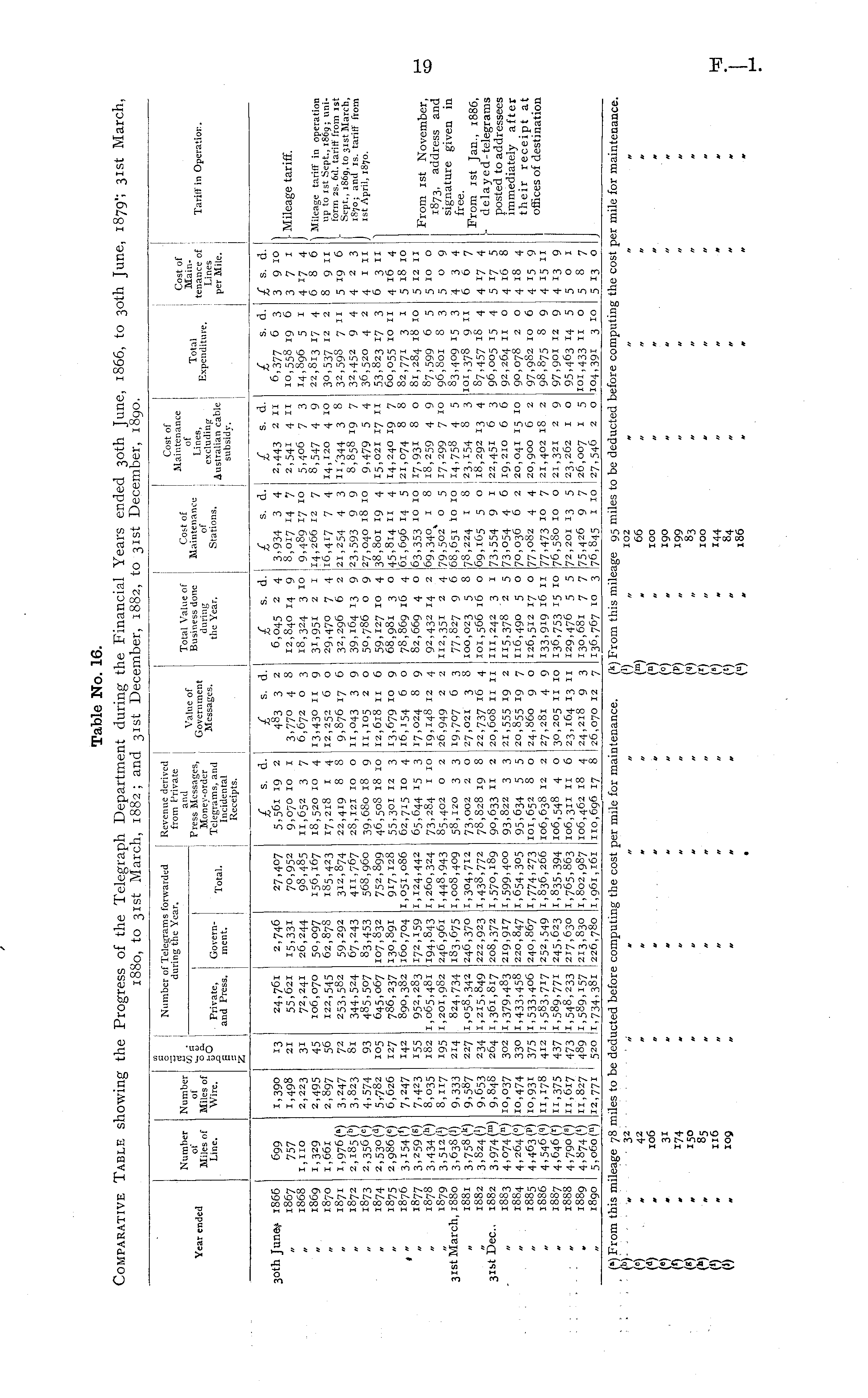 Table No. 16. Comparative Table showing the Progress of the Telegraph Department during the Financial Years ended 30th June, 1866, to 30th June, 1879; 31st March, 1880, to 31st March, 1882; and 31st December, 1882, to 31st December, 1890.