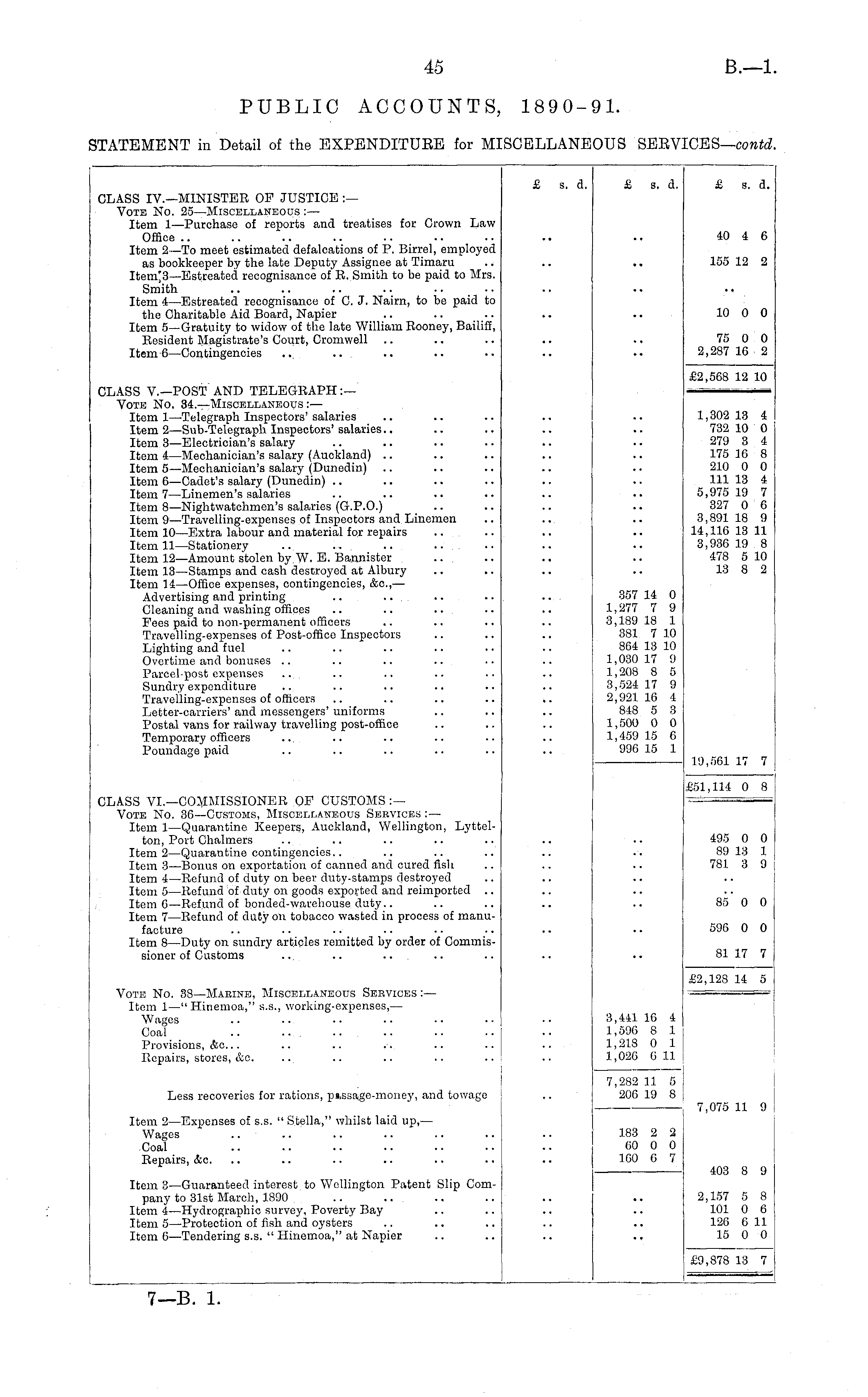 CLASS IV.—MINISTER OP JUSTICE :— Vote No. 25—Miscellaneous :— Item 1—Purchase of reports and treatises for Crown Law Office Item 2—To meet estimated defalcations of P. Birrel, employed as bookkeeper by the late Deputy Assignee at Timaru Item'3 —Estreated recognisance of E. Smith to be paid to Mrs. Smith Item 4—Estreated recognisance of C. J. Nairn, to be paid to the Charitable Aid Board, Napier Item 5—Gratuity to widow of the late William Booney, Bailiff, Resident Magistrate's Court, Cromwell Item 6—Contingencies £ s. d. £ s. d. £ s. d. 40 i 6 155 12 2 10 0 0 75 0 0 2,287 16 2 CLASS V.—POST AND TELEGRAPH:— Vote No. 34.—Miscellaneous :—■ Item 1—Telegraph Inspectors' salaries Item 2—Sub-Telegraph Inspectors' salaries Item 3—Electrician's salary Item 4—Mechanician's salary (Auckland) Item 5—Mechanician's salary (Dunedin) Item 6—Cadet's salary (Dunedin) Item 7—Linemen's salaries Item 8 —Nightwatchmen's salaries (G.P.O.) Item 9—Travelling-expenses of Inspectors and Linemen Item 10—Extra labour and material for repairs Item 11—Stationery .. .. .. Item 12—Amount stolen by W. E. Bannister ... Item 13—Stamps and cash destroyed at Albury Item 14—Office expenses, contingencies, &c, — Advertising and printing .. Cleaning and washing offices .. .. Fees paid to non-permanent officers Travelling-expenses of Post-office Inspectors Lighting and fuel Overtime and bonuses Parcel-post expenses .. Sundry expenditure Travelling-expenses of officers Letter-carriers' and messengers' uniforms Postal vans for railway travelling post-office Temporary officers Poundage paid £2,568 12 10 1,302 13 4 732 10 0 279 3 4 175 16 8 210 0 0 111 13 4 5,975 19 7 327 0 6 3,891 18 9 14,116 13 11 3,936 19 8 478 5 10 13 8 2 357 14 0 1,277 7 9 3,189 18 1 381 7 10 864 13 10 1,030 17 9 1,208 8 5 3,524 17 9 2,921 10 4 848 5 3 1,500 0 0 1,459 15 6 996 15 1 19,561 17 7 CLASS VI.—COMMISSIONER OF CUSTOMS :— Vote No. 36—Customs, Miscellaneous Services :— Item 1—Quarantine Keepers, Auckland, Wellington, Lyttelton, Port Chalmers Item 2—Quarantine contingencies.. Item 3—Bonus on exportation of canned and cured fish Item 4—Refund of duty on beer duty-stamps destroyed Item 5 —Refund of duty on goods exported and reimported .. Item 6—Refund of bonded-warehouse duty.. Item 7 —Refund of duty on tobacco wasted in process of manufacture Item 8—Duty on sundry articles remitted by order of Commissioner of Customs £51,114 0 8 49.5 0 0 89 13 1 781 3 9 85 0 0 596 0 0 81 17 7 Vote No. 38—Mabine, Miscellaneous Services :— Item 1—"Hinemoa," s.s., working-expenses,— Wages Coal .. .... Provisions, &c . Repairs, stores, &o. £2,128 14 5 3,441 16 4 1,596 8 1 1,218 0 1 1,026 6 11 Less recoveries for rations, pB,ssage-money, and towage 7,282 11 5 206 19 8 Item 2—Expenses of s.s. " Stella," whilst laid up, — Wages Coal Repairs, &c. 7,075 11 9 183 2 2 60 0 0 160 6 7 403 8 9 Item 3—Guaranteed interest to Wellington Patent Slip Company to 31st March, 1890 Item 4—Hydrographic survey, Poverty Bay Item 5—Protection of fish and oysters Item 6 —Tendering s.s. " Hinemoa," at Napier 2,157 5 8 101 0 6 126 6 11 15 0 0 £9,878 13 7