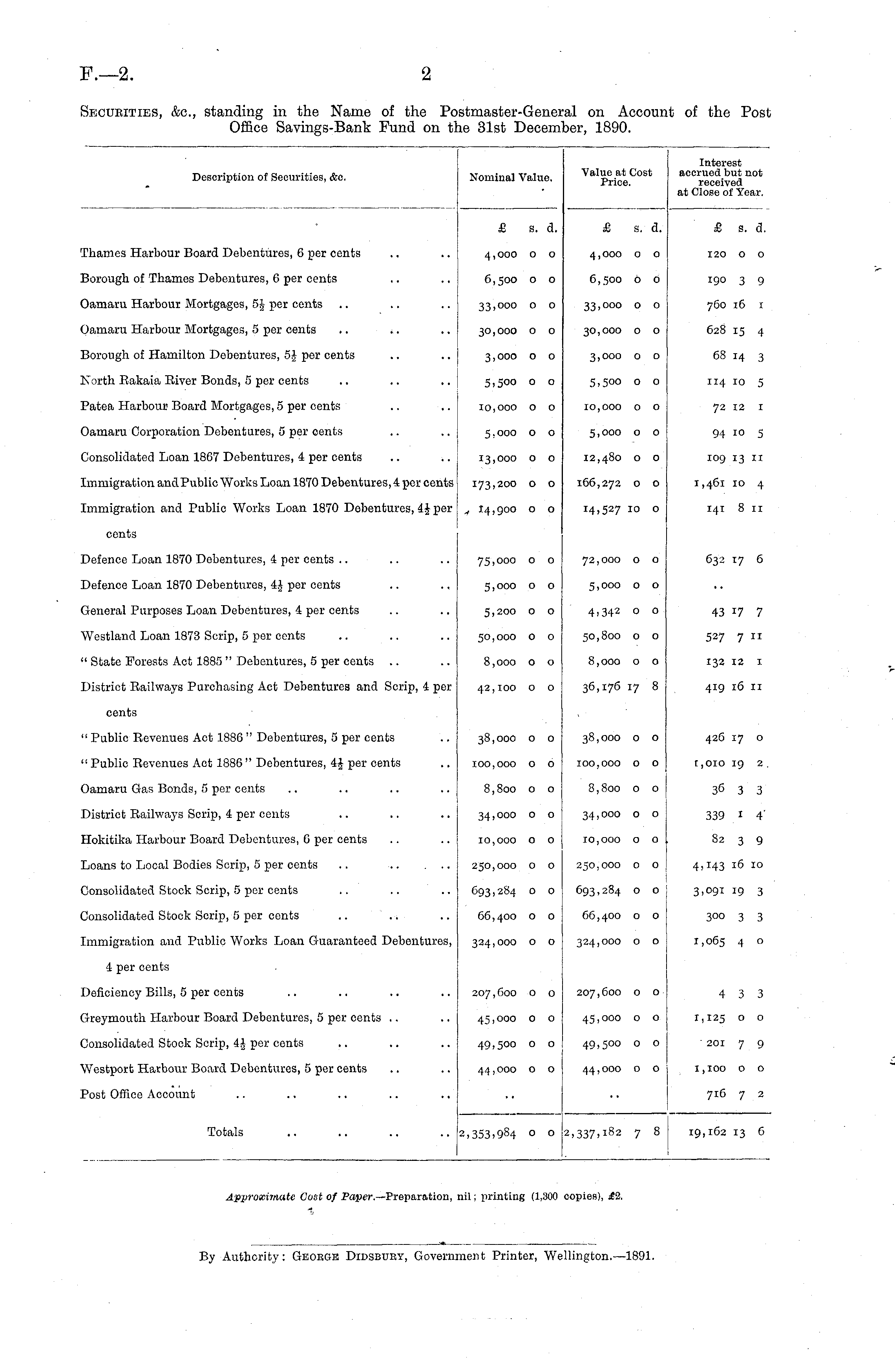 Description of Securities, &c. Nominal Value. Value at Cost Price. Interest accrued but not received at Close of Year. £ s. a. £ s. d. £ s. d. rhamea Harbour Board Debentures, 6 per cents 4, 000 o o 4,000 o o 120 o o Borough of Thames Debentures, G per cents 6,500 o o 6,500 o o 190 3 9 Damaru Harbour Mortgages, 5J per cents 33,000 o o 33,000 o o 760 16 1 Damaru Harbour Mortgages, 5 per cents 30,000 o o 30,000 o o 628 15 4 Borough of Hamilton Debentures, 5J per cents 3,000 o o 3, 000 o o 68 14 3 t\ orth Eakaia Kiver Bonds, 5 per cents 5,500 o o 5,500 o o 114 10 5 Patea Harbour Board Mortgages, 5 per cents 10,000 o o 10,000 o o 72 12 1 Oamaru Corporation Debentures, 5 per cents 5,000 o o 5,000 o o 94 10 5 Consolidated Loan 1867 Debentures, 4 per cents 13,000 o o 12,480 o o 109 13 11 Immigration andPublic Works Loan 1870 Debentures, 4 per cents 173,200 o o 166,272 o o 1,461 10 4 Immigration and Public Works Loan 1870 Debentures, 4J per , 14,900 o o 14,527 10 o 141 8 11 cents Defence Loan 1870 Debentures, 4 per cents 75,000 o o 72,000 o o 632 17 6 Defence Loan 1870 Debentures, 4J per cents 5,000 o 0 5,000 o o Gteneral Purposes Loan Debentures, 4 per cents 5,200 o o 4,342 o o 43 17 7 Westland Loan 1873 Scrip, 5 per cents 50,000 o o 50,800 o o 527 7 11 :l State Forests Act 1885 " Debentures, 5 per cents 8,000 o o 8,000 o o 132 12 1 District Railways Purchasing Act Debentures and Scrip, 4 per 42,100 o o 36,176 17 8 419 16 11 cents 11 Public Revenues Act 1886 " Debentures, 5 per cents 38,000 o o 38,000 o o 426 17 o " Public Revenues Act 1886 " Debentures, 4J per cents 100,000 o o 100,000 o o 1,010 19 2 Oamaru Gas Bonds, 5 per cents 8,800 o o 8,800 o o 36 3 3 District Railways Scrip, 4 per cents 34,000 o o 34, 000 o o 339 1 4' Hokitika Harbour Board Debentures, C per cents 10,000 o o 10,000 o o 82 3 9 Loans to Local Bodies Scrip, 5 per cents .. 250,000 o o 250,000 o o 4,143 16 10 Consolidated Stock Scrip, 5 per cents 693,284 o o 693,284 o o 3.°9i 19 3 Consolidated Stock Scrip, 5 per cents .. 66,400 o o 66,400 o o 300 3 3 Immigration and Public Works Loan Guaranteed Debentures, 324,000 o o 324,000 o o 1,065 4 ° 4 per cents 207, 600 o o 207, 600 o o Deficiency Bills, S per cents 4 3 3 3-reymouth Harbour Board Debentures, 5 per cents 45,000 o o 45, 000 o o 1,125 ° ° Consolidated Stock Scrip, 4J per cents 49,500 o o 49,500 o o 201 7 9 VVestport Harbour Board Debentures, 5 per cents 44, 000 o o 44,000 o o 1 1100 o o Post Office Account 716 7 2 Totals 2.353.984 o o 2,337.t 82 7 8 19,162 13 6