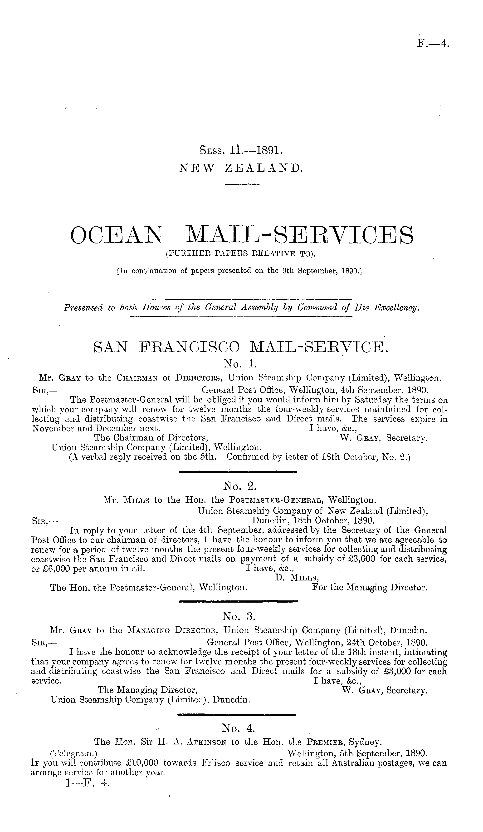 SAN FRANCISCO MAIL-SERVICE. No. 1. Mr. Gray to the Chairman of Dikectobs, Union Steamship Company (Limited), Wellington. Sir,— General Post Office, Wellington, 4th September, 1890. The Postmaster-General will be obliged if you would inform him by Saturday the terms on which your company will renew for twelve months the four-weekly services maintained for collecting and distributing coastwise the San Francisco and Direct mails. The services expire in November and December next. I have, &c, The Chairman of Directors, W. Geay, Secretary. Union Steamship Company (Limited), Wellington. (A verbal reply received on the sth. Confirmed by letter of 18th October, No. 2.)