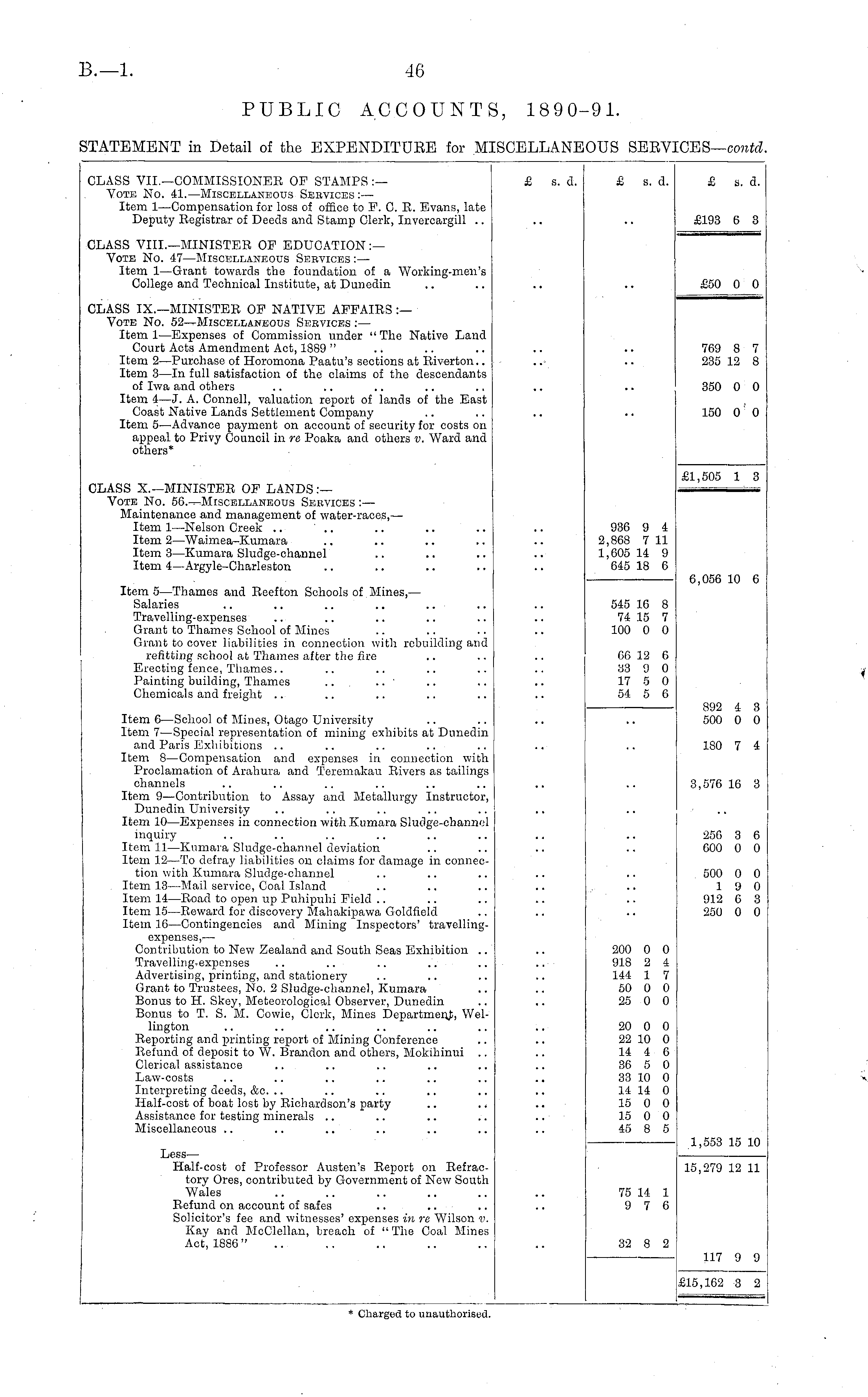 CLASS VII.—COMMISSIONER OP STAMPS :— Vote No. 41. —Miscellaneous Sebvices :— Item 1—Compensation for loss of office to F. C. R. Evans, late Deputy Registrar of Deeds and Stamp Clerk, Invercargill .. £ s. a. £ s. d. £ s. d. £193 6 3 CLASS VIII.—MINISTER OF EDUCATION:— Vote No. 47 —Miscellaneous Services :— Item 1—Grant towards the foundation of a Working-men's College and Technical Institute, at Dunedin £50 0 0 CLASS IX.—MINISTER OF NATIVE AFFAIRS :— Vote No. 52—Miscellaneous Sebvices :— Item 1—Expenses of Commission under " The Native Land Court Acts Amendment Act, 1889 " Item 2—Purchase of Horomona Paatu's sections at Riverton.. Item 3 —In full satisfaction of the claims of the descendants of Iwa and others Item 4— J. A. Connell, valuation report of lands of the East Coast Native Lands Settlement Company Item 5—Advance payment on account of security for costs on appeal to Privy Council in re Poaka and others t>. Ward and others* Y69 8 7 235 12 8 350 0 0 150 0 0 CLASS X.—MINISTER OF LANDS :— Vote No. Services :— Maintenance and management of water-races, — Item 1—Nelson Creek .. Item 2—Waimea-Kumara Item 3 —Kumara Sludge-channel Item 4—Argyle-Charleston £1,505 1 3 936 9 4 2,868 7 11 1,605 14 9 645 18 6 Item 5—Thames and Reef ton Schools of Mines, — Salaries Travelling-expenses Grant to Thames School of Mines Grant to cover liabilities in connection with rebuilding and refitting school at Thames after the fire Erecting fence, Thames.. Painting building, Thames ... .. ' Chemicals and freight 545 16 8 74 15 7 100 0 0 6,056 10 6 66 12 6 33 9 0 17 5 0 54 5 6 892 4 3 500 0 0 Item C —School of Mines, Otago University Item 7 —Special representation of mining exhibits at Dunedin and Paris Exhibitions Item 8 —Compensation and expenses in connection with Proclamation of Arahura and Teremakau Rivers as tailings channels Item 9—Contribution to Assay and Metallurgy Instructor, Dunedin University Item 10 —Expenses in connection with. Kumara Sludge-channel inquiry Item 11 —Kumara Sludge-channel deviation Item 12—To defray liabilities on claims for damage in connection with Kumara Sludge-channel Item 13—Mail service, Coal Island Item 14—Road to open up Puhipuhi Field Item 15—Reward for discovery Mahakipawa Goldfield Item 16—Contingencies and Mining Inspectors' travelling180 7 4 3,576 16 3 256 3 6 600 0 0 expenses,— Contribution to New Zealand and South Seas Exhibition .. Travelling-expenses Advertising, printing, and stationery Grant to Trustees, No. 2 Sludge-channel, Kumara Bonus to H. Skey, Meteorological Observer, Dunedin. Bonus to T. S. M. Cowio, Clerk, Mines Department, Wellington Reporting and printing report of Mining Conference Refund of deposit to W. Brandon and others, Mokihinui Clerical assistance Law-costs Interpreting deeds, &c. .. Half-cost of boat lost by Richardson's party Assistance for testing minerals Miscellaneous 200 0 0 918 2 4 144 1 7 50 0 0 25 0 0 500 0 0 19 0 912 G 3 250 0 0 20 0 0 22 10 0 14 4 6 36 5 0 33 10 0 14 14 0 15 0 0 15 0 0 45 8 5 1,553 15 10 Less— Half-cost of Professor Austen's Report on Refractory Ores, contributed by Government of New South Wales Refund on account of safes Solicitor's fee and witnesses' expenses in re Wilson v. Kay and McClellan, breach of "The Coal Mines Act, 1886" 75 14 1 9 7 6 15,279 12 11 32 8 2 117 9 9 £15,162 3 2
