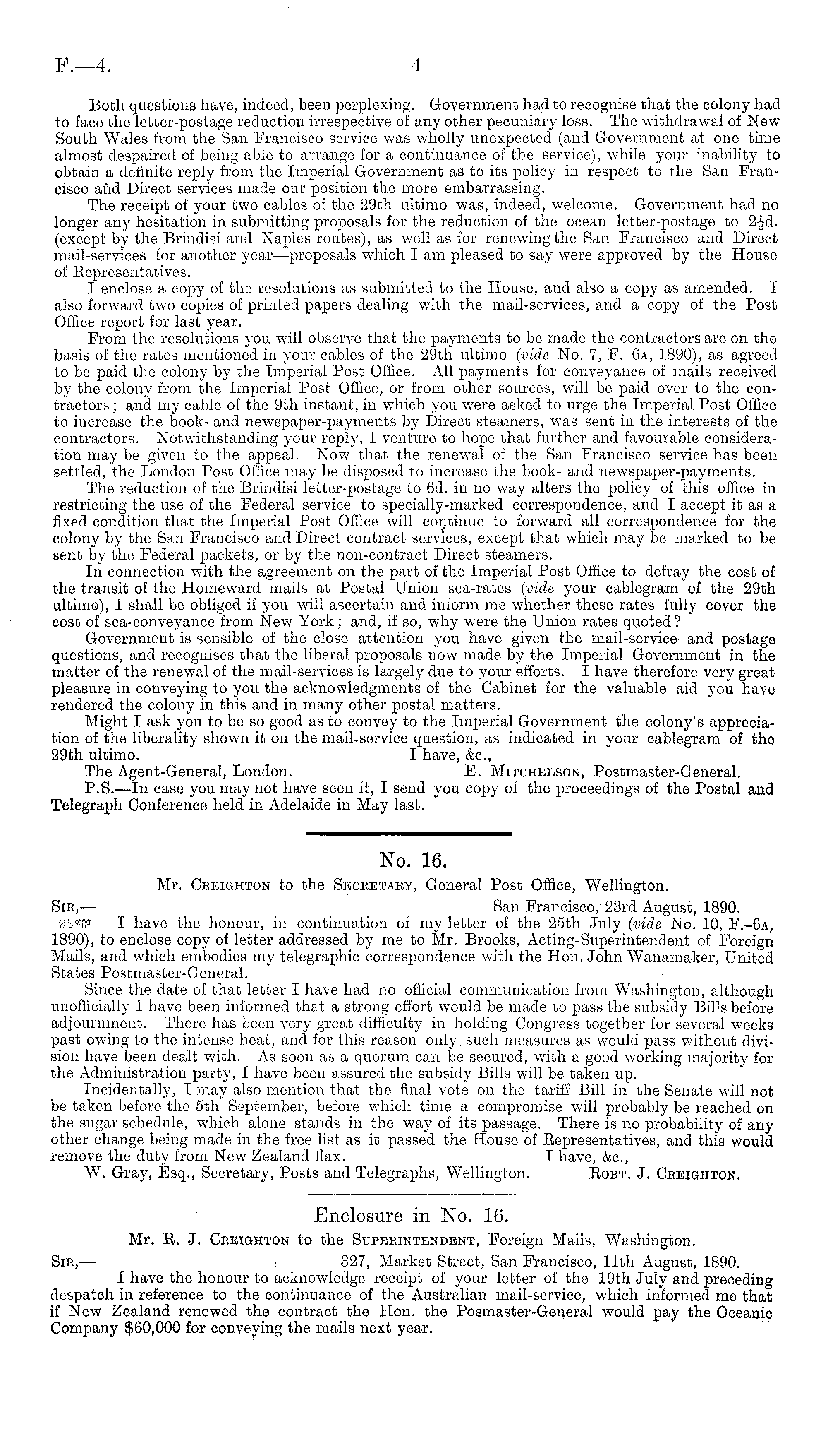 Enclosure in No. 16. Mr. E. J. Creighton to the Superintendent, Foreign Mails, Washington. Sir, — 327, Market Street, San Francisco, 11th August, 1890. I have the honour to acknowledge receipt of your letter of the 19th July and preceding despatch in reference to the continuance of the Australian mail-service, which informed me that if New Zealand renewed the contract the Hon. the Posmaster-General would pay the Oceanic Company $60,000 for conveying the mails next year.