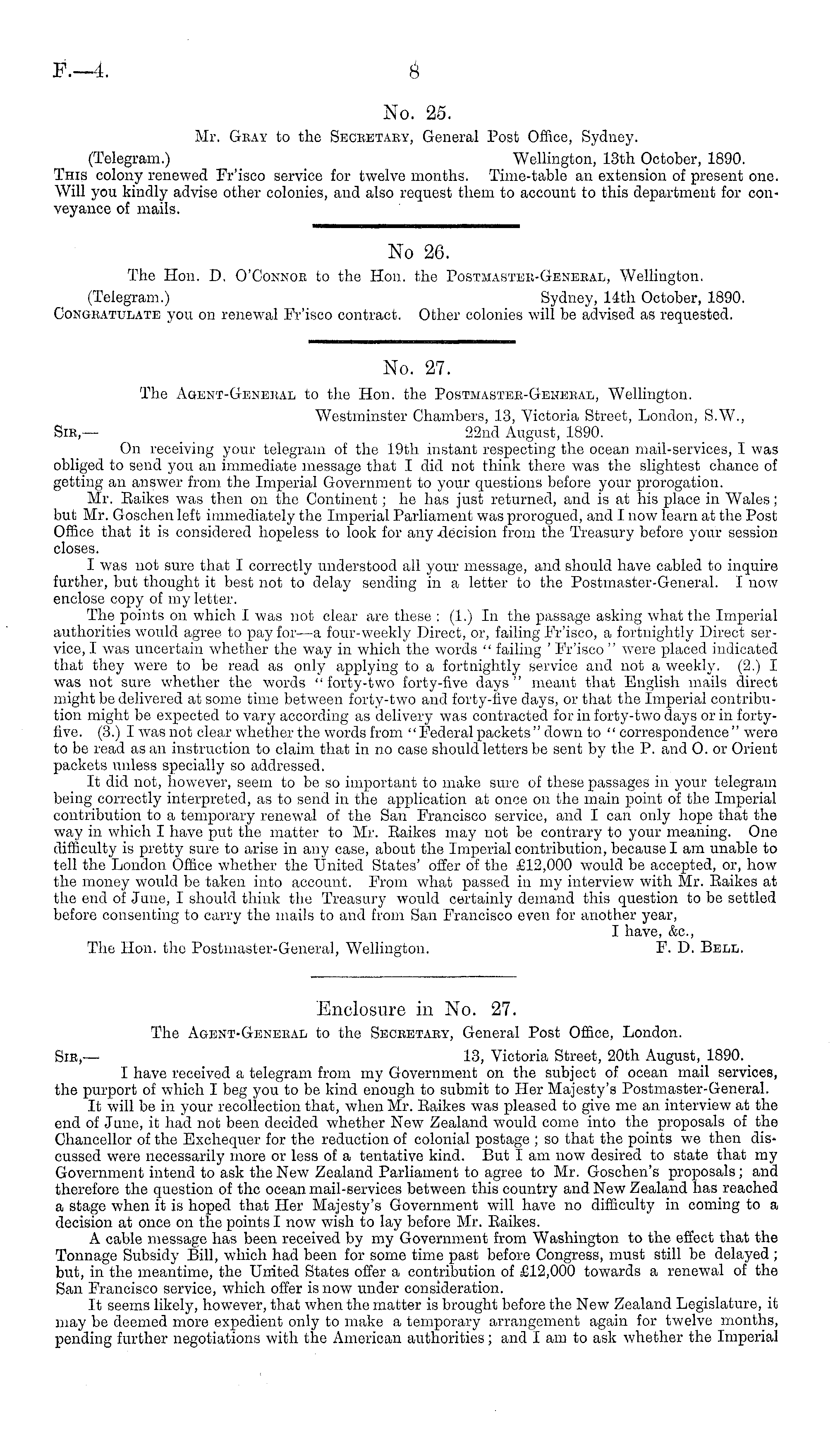 No. 27. The Agent-Genebal to the Hon. the Postmasteb-Genebal, Wellington. Westminster Chambers, 13, Victoria Street, London, S.W., Sib,— 22nd August, 1890. On receiving your telegram of the 19th instant respecting the ocean mail-services, I was obliged to send you an immediate message that I did not think there was the slightest chance of getting an answer from the Imperial Government to your questions before your prorogation. Mr. Eaikes was then on the Continent; he has just returned, and is at his place in Wales; but Mr. Goschen left immediately the Imperial Parliament was prorogued, and I now learn at the Post Office that it is considered hopeless to look for any -decision from the Treasury before your session closes. I was not sure that I correctly understood all your message, and should have cabled to inquire further, but thought it best not to delay sending in a letter to the Postmaster-General. I now enclose copy of my letter. The points on which I was not clear are these : (1.) In the passage asking what the Imperial authorities would agree to pay for—a four-weekly Direct, or, failing Frisco, a fortnightly Direct service, I was uncertain whether the way in which the words " failing ' Frisco " were placed indicated that they were to be read as only applying to a fortnightly service and not a weekly. (2.) I was not sure whether the words "forty-two forty-five days" meant that English mails direct might be delivered at some time between forty-two and forty-five days, or that the Imperial contribution might be expected to vary according as delivery was contracted for in forty-two days or in fortyfive. (3.) I was not clear whether the words from "Federal packets" down to " correspondence " were to be read as an instruction to claim that in no case should letters be sent by the P. and O. or Orient packets unless specially so addressed. It did not, however, seem to be so important to make sure of these passages in your telegram being correctly interpreted, as to send in the application at once on the main point of the Imperial contribution to a temporary renewal of the San Francisco service, and I can only hope that the way in which I have put the matter to Mr. Eaikes may not be contrary to your meaning. One difficulty is pretty sure to arise in any case, about the Imperial contribution, because I am unable to tell the London Office whether the United States' offer of the £12,000 would be accepted, or, how the money would be taken into account. From what passed in my interview with Mr. Eaikes at the end of June, I should think the Treasury would certainly demand this question to be settled before consenting to carry the mails to and from San Francisco even for another year, I have, &c, The Hon. the Postmaster-General, Wellington. F. D. Bell.