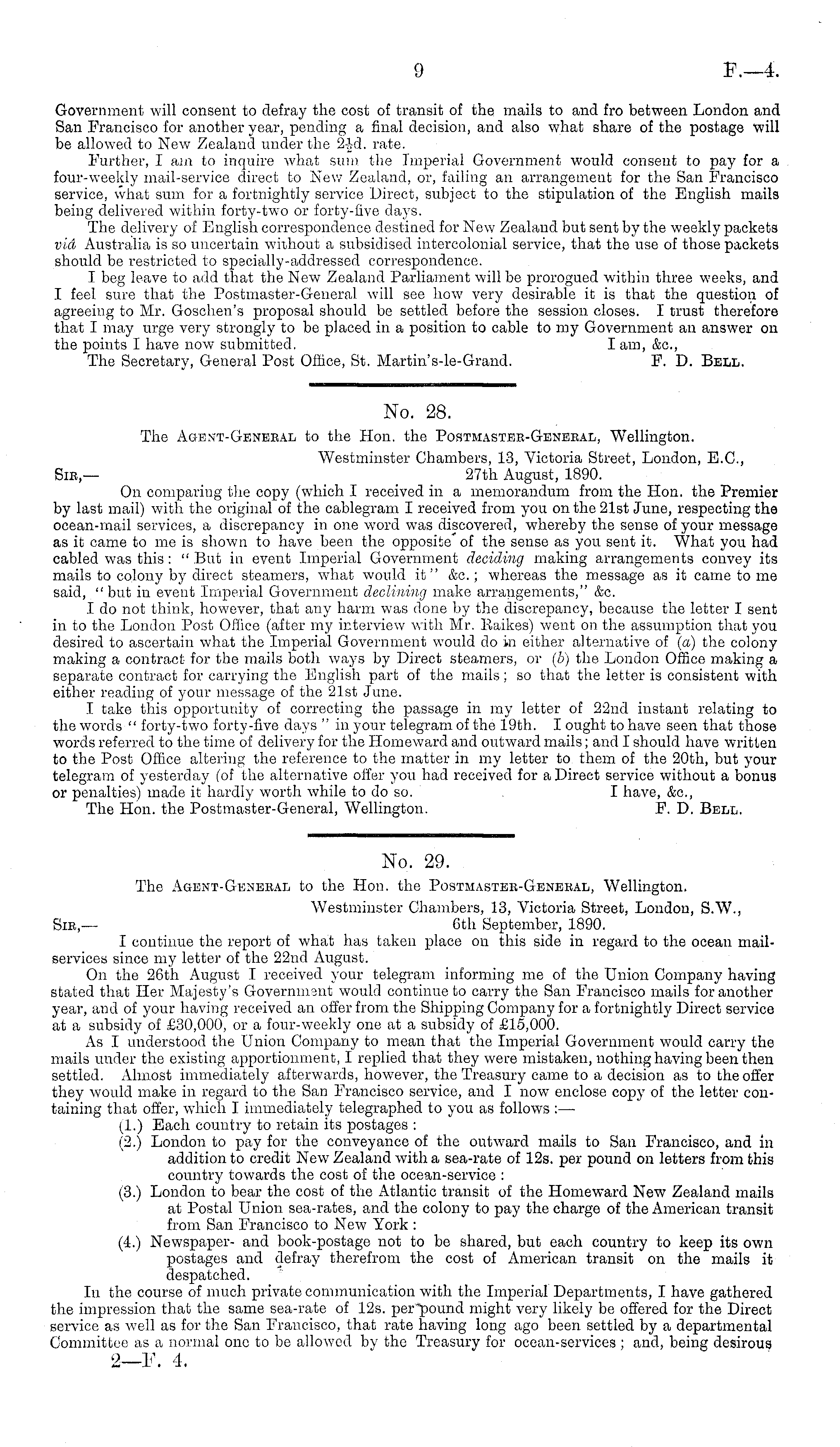 No. 28. The Agent-General to the Hon. the Postmasteb-Geneeal, Wellington. Westminster Chambers, 13, Victoria Street, London, 8.C., Sir,— 27th August, 1890. On comparing the copy (which I received in a memorandum from the Hon. the Premier by last mail) with the original of the cablegram I received from you on the 21st June, respecting the ocean-mail services, a discrepancy in one word was discovered, whereby the sense of your message as it came to me is shown to have been the opposite' of the sense as you sent it. What you had cabled was this : " But in event Imperial Government deciding making arrangements convey its mails to colony by direct steamers, what would it" &c.; whereas the message as it came to me said, " but in event Imperial Government declining make arrangements," &c. I do not think, however, that any harm was done by the discrepancy, because the letter I sent in to the London Post Office (after my interview with Mr. Kaikes) went on the assumption that you desired to ascertain what the Imperial Government would do in either alternative of (a) the colony making a contract for the mails both ways by Direct steamers, or (b) the London Office making a separate contract for carrying the English part of the mails; so that the letter is consistent with either reading of your message of the 21st June. I take this opportunity of correcting the passage in my letter of 22nd instant relating to the words " forty-two forty-five days "in your telegram of the 19th. I ought to have seen that those words referred to the time of delivery lor the Homeward and outward mails; and I should have written to the Post Office altering the reference to the matter in my letter to them of the 20th, but your telegram of yesterday (of the alternative offer you had received for a Direct service without a bonus or penalties) made it hardly worth while to do so. I have, &c, The Hon. the Postmaster-General, Wellington. F. D. Bell.