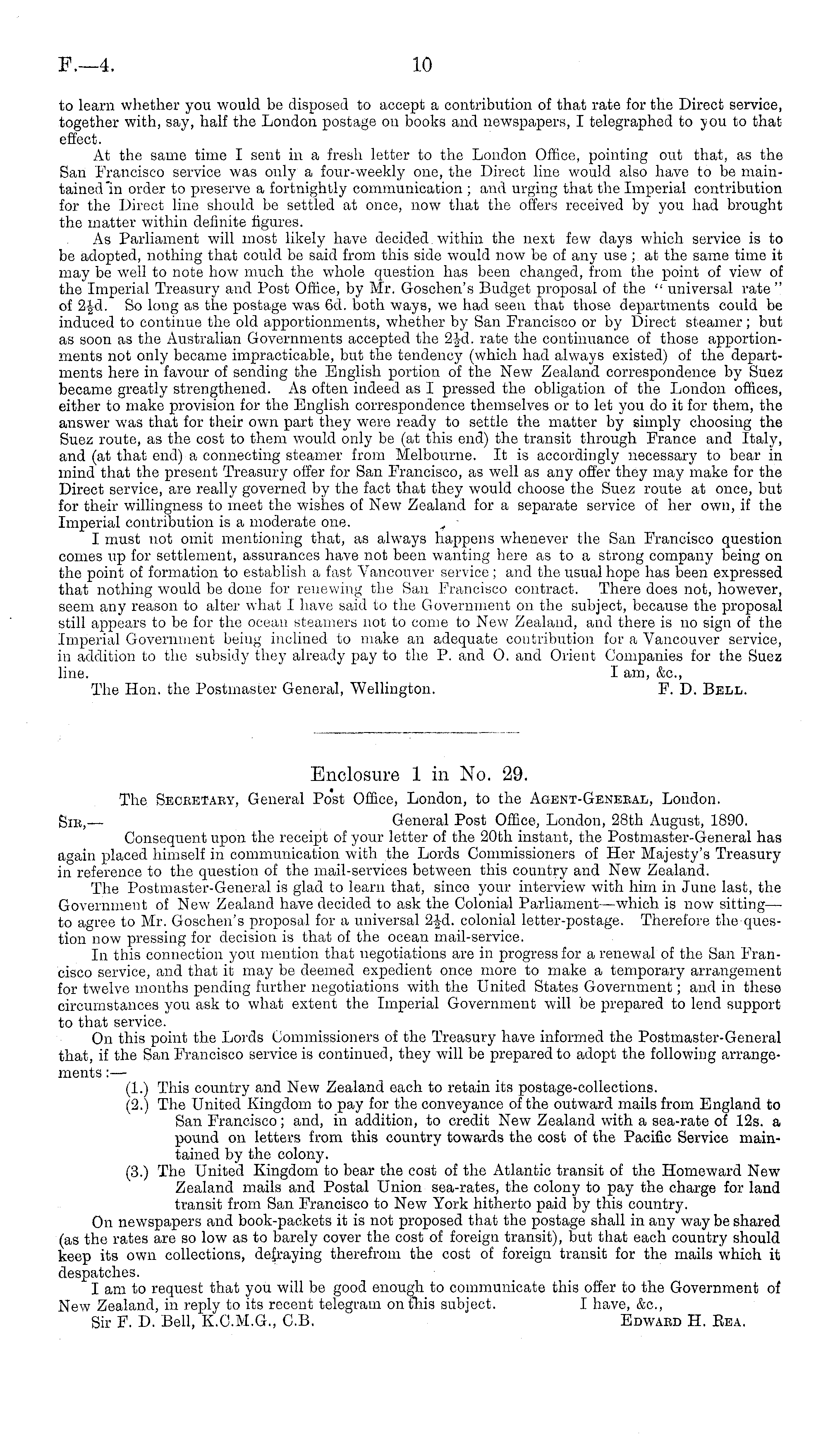 Enclosure 1 in No. 29. The Seceetaey, General Post Office, London, to the Agent-Genebal, London. Sib,— General Post Office, London, 28th August, 1890. Consequent upon the receipt of your letter of the 20th instant, the Postmaster-General has again placed himself in communication with the Lords Commissioners of Her Majesty's Treasury in reference to the question of the mail-services between this country and New Zealand. The Postmaster-General is glad to learn that, since your interview with him in June last, the Government of New Zealand have decided to ask the Colonial Parliament—which is now sitting— to agree to Mr. Goschen's proposal for a universal 2-|d. colonial letter-postage. Therefore the question now pressing for decision is that of the ocean mail-service. In this connection you mention that negotiations are in progress for a renewal of the San Francisco service, and that it may be deemed expedient once more to make a temporary arrangement for twelve months pending further negotiations with the United States Government; and in these circumstances you ask to what extent the Imperial Government will be prepared to lend support to that service. On this point the Lords Commissioners of the Treasury have informed the Postmaster-General that, if the San Francisco service is continued, they will be prepared to adopt the following arrangements :— (1.) This country and New Zealand each to retain its postage-collections. (2.) The United Kingdom to pay for the conveyance of the outward mails from England to San Francisco; and, in addition, to credit New Zealand with a sea-rate of 12s. a pound on letters from this country towards the cost of the Pacific Service maintained by the colony. (3.) The United Kingdom to bear the cost of the Atlantic transit of the Homeward New Zealand mails and Postal Union sea-rates, the colony to pay the charge for land transit from San Francisco to New York hitherto paid by this country. On newspapers and book-packets it is not proposed that the postage shall in any way be shared (as the rates are so low as to barely cover the cost of foreign transit), but that each country should keep its own collections, defraying therefrom the cost of foreign transit for the mails which it despatches. I am to request that you will be good enough to communicate this offer to the Government of New Zealand, in reply to its recent telegram on this subject. I have, &c, Sir F. D. Bell, K.C.M.G., C.B. Edwaed H. Eea.
