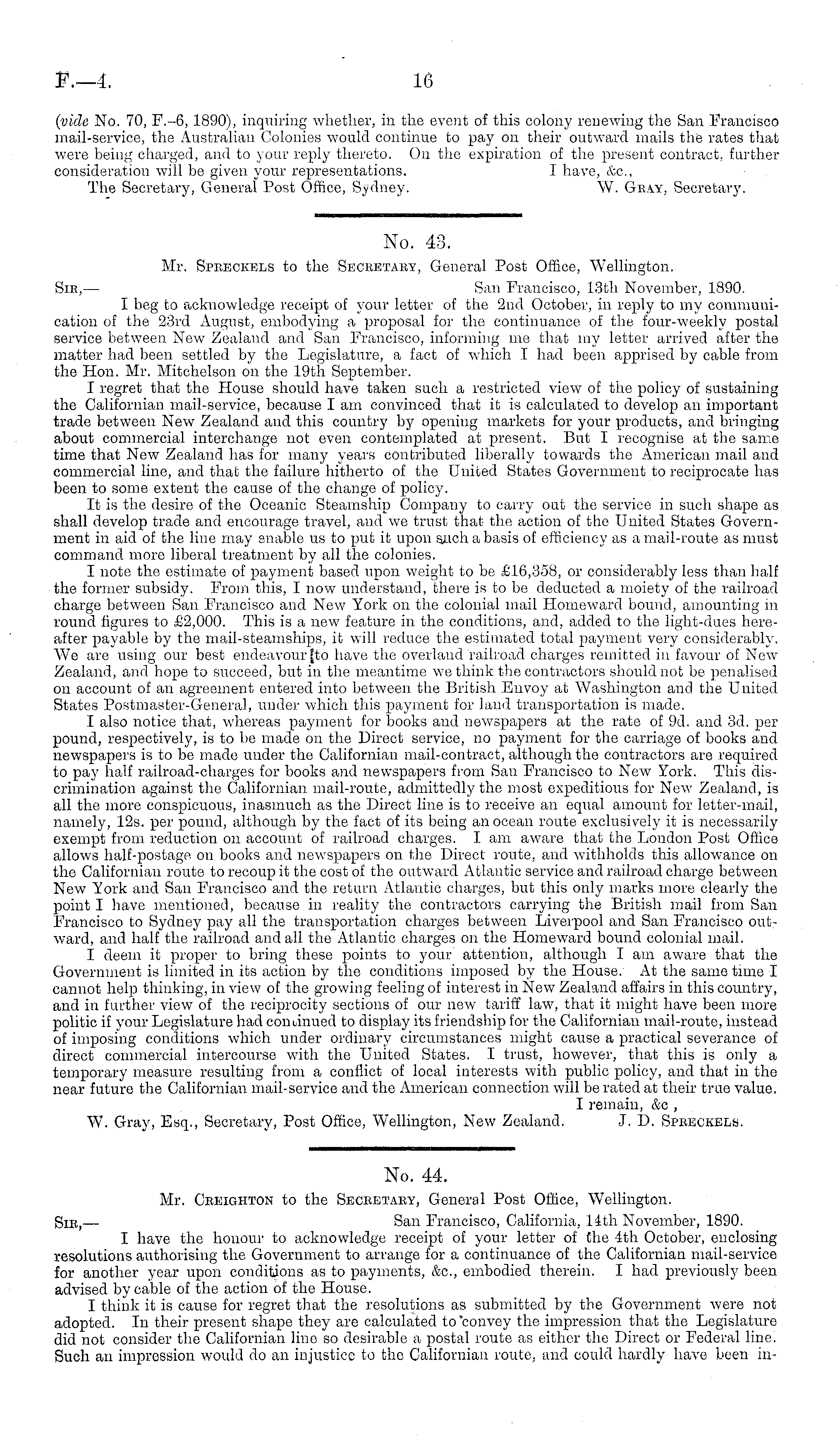 No. 44. Mr. Cbbighton to the Secketaky, General Post Office, Wellington. Sic, — San Francisco, California, 14th November, 1890. I have the honour to acknowledge receipt of your letter of the 4th October, enclosing resolutions authorising the Government to arrange for a continuance of the Californian mail-service for another year upon conditions as to payments, &c, embodied therein. I had previously been advised by cable of the action of the House. I think it is cause for regret that the resolutions as submitted by the Government were not adopted. In their present shape they are calculated to 'convey the impression that the Legislature did not consider the Californian line so desirable a postal route as either the Direct or Federal line. Such an impression would do an injustice to the Californian route, and could hardly have been in-
