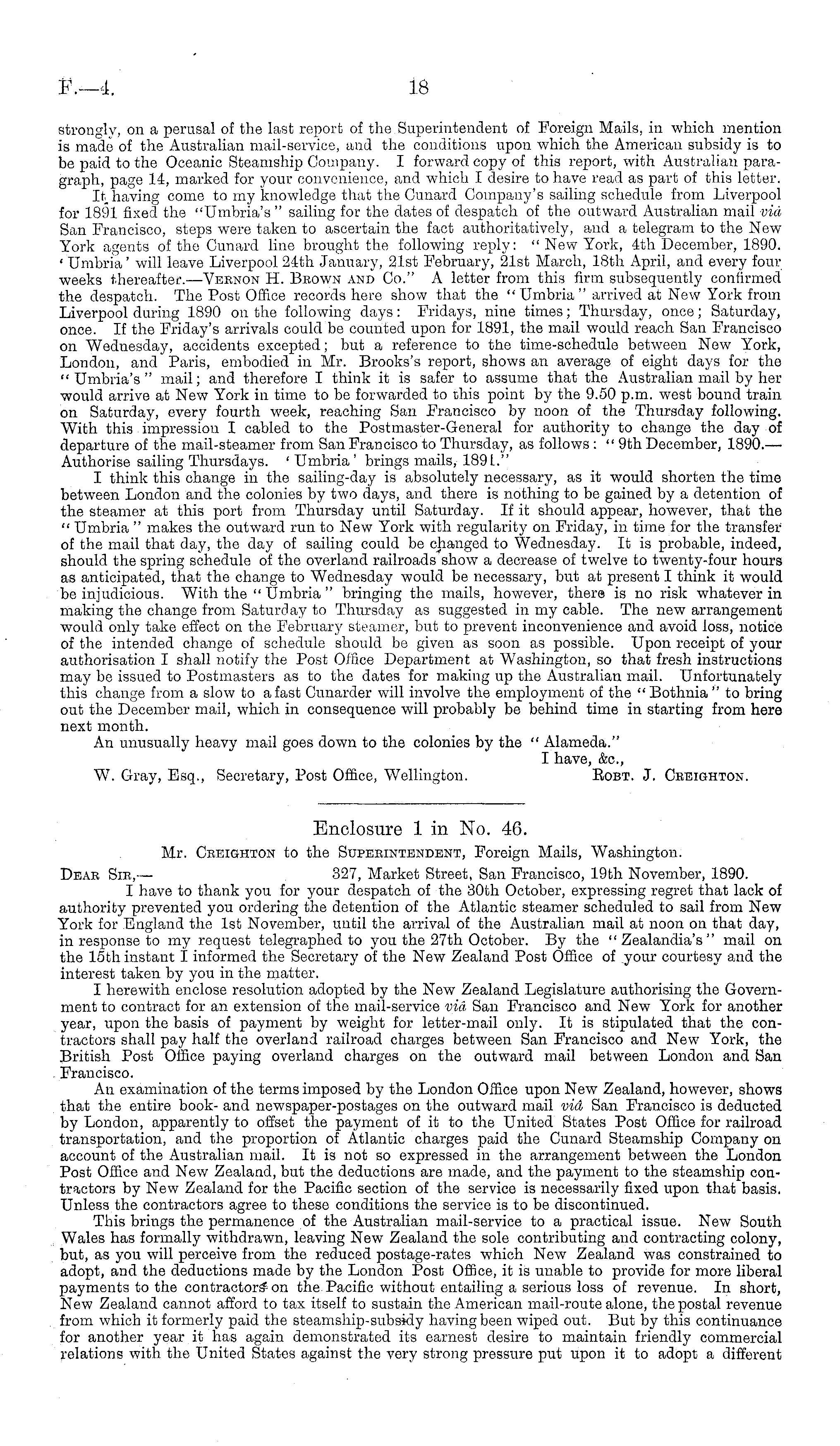 Enclosure 1 in No. 46. Mr. Cbeighton to the Supebintendent, Foreign Mails, Washington. Dear Sic, — 327, Market Street, San Francisco, 19th November, 1890. I have to thank you for your despatch of the 30th October, expressing regret that lack of authority prevented you ordering the detention of the Atlantic steamer scheduled to sail from New York for England the Ist November, until the arrival of the Australian mail at noon on that day, in response to my request telegraphed to you the 27th October. By the " Zealandia's " mail on the 15th instant I informed the Secretary of the New Zealand Post Office of your courtesy and the interest taken by you in the matter. I herewith enclose resolution adopted by the New Zealand Legislature authorising the Government to contract for an extension of the mail-service via San Francisco and New York for another year, upon the basis of payment by weight for letter-mail only. It is stipulated that the contractors shall pay half the overland railroad charges between San Francisco and New York, the British Post Office paying overland charges on the outward mail between London and San Francisco. An examination of the terms imposed by the London Office upon New Zealand, however, shows that the entire book- and newspaper-postages on the outward mail via San Francisco is deducted by London, apparently to offset the payment of it to the United States Post Office for railroad transportation, and the proportion of Atlantic charges paid the Cunard Steamship Company on account of the Australian mail. It is not so expressed in the arrangement between the London Post Office and New Zealand, but the deductions are made, and the payment to the steamship contractors by New Zealand for the Pacific section of the service is necessarily fixed upon that basis. Unless the contractors agree to these conditions the service is to be discontinued. This brings the permanence of the Australian mail-service to a practical issue. New South Wales has formally withdrawn, leaving New Zealand the sole contributing and contracting colony, but, as you will perceive from the reduced postage-rates which New Zealand was constrained to adopt, and the deductions made by the London Post Office, it is unable to provide for more liberal payments to the contractors on the Pacific without entailing a serious loss of revenue. In short, New Zealand cannot afford to tax itself to sustain the American mail-route alone, the postal revenue from which it formerly paid the steamship-subsidy having been wiped out. But by this continuance for another year it has again demonstrated its earnest desire to maintain friendly commercial relations with the United States against the very strong pressure put upon it to adopt a different