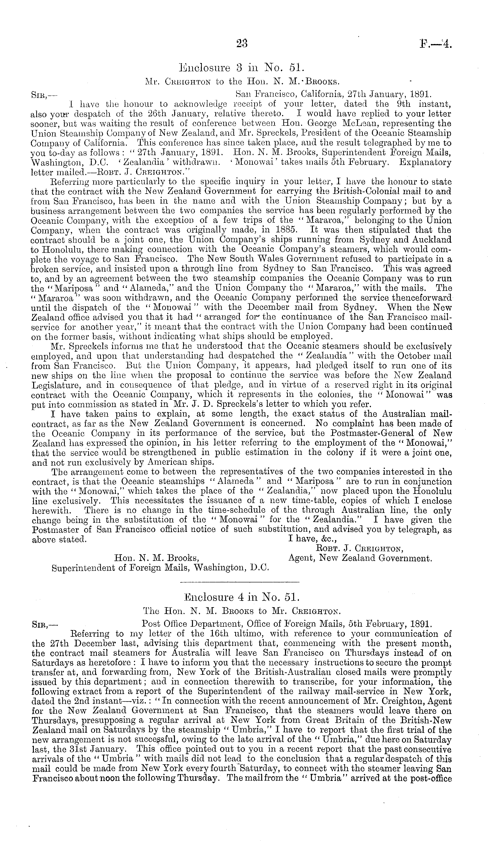 Enclosure 3 in No. 51. Mr. Ckeighton to the Hon. N. M.-Bkooks. Sib, — San Francisco, California, 27th January, 1891. I have the honour to acknowledge receipt of your letter, dated the 9th instant, also you-r despatch of the 26th January, relative thereto. I would have replied to your letter sooner, but was waiting the result of conference between Hon. George McLean, representing the Union Steamship Company of New Zealand, and Mr. Spreckels, President of the Oceanic Steamship Company of California. This conference has since taken place, and the result telegraphed by me to you to-day as follows : " 27th January, 1891. Hon. N, M. Brooks, Superintendent Foreign Mails, Washington, D.C. ' Zealandia ' withdrawn. ' Monowai' takes mails sth February. Explanatory letter mailed.—Eobt. J. Creighton." Referring more particularly to the specific inquiry in your letter, I have the honour to state that the contract with the New Zealand Government for carrying the British-Colonial mail to and from San Francisco, has been in the name and with the Union Steamship Company; but by a business arrangement between the two companies the service has been regularly performed by the Oceanic Company, with the exception of a few trips of the " Mararoa," belonging to the Union Company, when the contract was originally made, in 1885. It was then stipulated that the contract should be a joint one, the Union Company's ships running from Sydney and Auckland to Honolulu, there making connection with the Oceanic Company's steamers, which would complete the voyage to San Francisco. The New South Wales Government refused to participate in a broken service, and insisted upon a through line from Sydney to San Francisco. This was agreed to, and by an agreement between the two steamship companies the Oceanic Company was to run the "Mariposa " and " Alameda," and the Union Company the " Mararoa," with the mails. The "Mararoa" was soon withdrawn, and the Oceanic Company performed the service thenceforward until the dispatch of the " Monowai " with the December mail from Sydney. When the New Zealand office advised you that it had " arranged for the continuance of the San Francisco mailservice for another year," it meant that the contract with the Union Company had been continued on the former basis, without indicating what ships should be employed. Mr. Spreckels informs me that he understood that the Oceanic steamers should be exclusively employed, and upon that understanding had despatched the " Zealandia" with the October mail from San Francisco. But the Union Company, it appears, had pledged itself to run one of its new ships on the line when the proposal to continue the service was before the New Zealand Legislature, and in consequence of that pledge, and in virtue of a reserved right in its original contract with the Oceanic Company, which it represents in the colonies, the "Monowai" was put into commission as stated in Mr. J. D. Spreckels's letter to which you refer. I have taken pains to explain, at some length, the exact status of the Australian mailcontract, as far as the New Zealand Government is concerned. No complaint has been made of the Oceanic Company in its performance of the service, but the Postmaster-General of New Zealand has expressed the opinion, in his letter referring to the employment of the "Monowai," that the service would be strengthened in public estimation in the colony if it were a joint one, and not run exclusively by American ships. The arrangement come to between the representatives of the two companies interested in the contract, is that the Oceanic steamships " Alameda " and " Mariposa " are to run in conjunction with the " Monowai," which takes the place of the "Zealandia," now placed upon the Honolulu line exclusively. This necessitates the issuance of a new time-table, copies of which I enclose herewith. There is no change in the time-schedule of the through Australian line, the only change being in the substitution of the " Monowai " for the " Zealandia." I have given the Postmaster of San Francisco official notice of such substitution, and advised you by telegraph, as above stated. I have, &c, Eobt. J. Cbeiguton, Hon. N. M. Brooks, Agent, New Zealand Government. Superintendent of Foreign Mails, Washington, D.C.