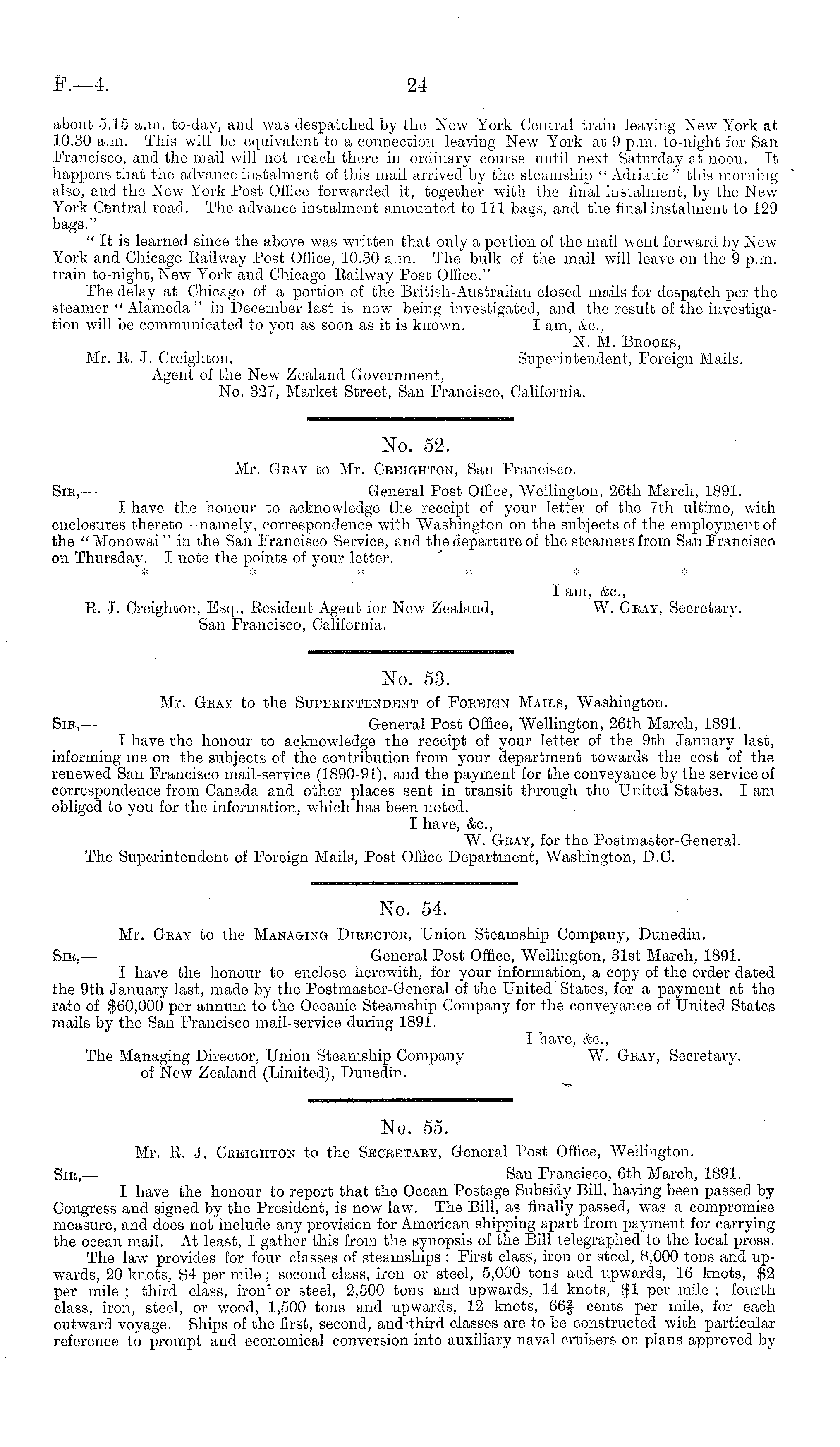 No. 52. Mr. Gbay to Mr. Cbeighton, San Francisco. Sic,— General Post Office, Wellington, 26th March, 1891. I have the honour to acknowledge the receipt of your letter of the 7th ultimo, with enclosures thereto—namely, correspondence with Washington on the subjects of the employment of the " Monowai" in the San Francisco Service, and the departure of the steamers from San Francisco on Thursday. I note the points of your letter. I am, &c, E. J. Creighton, Esq., Resident Agent for New Zealand, W. Geay, Secretary. San Francisco, California.