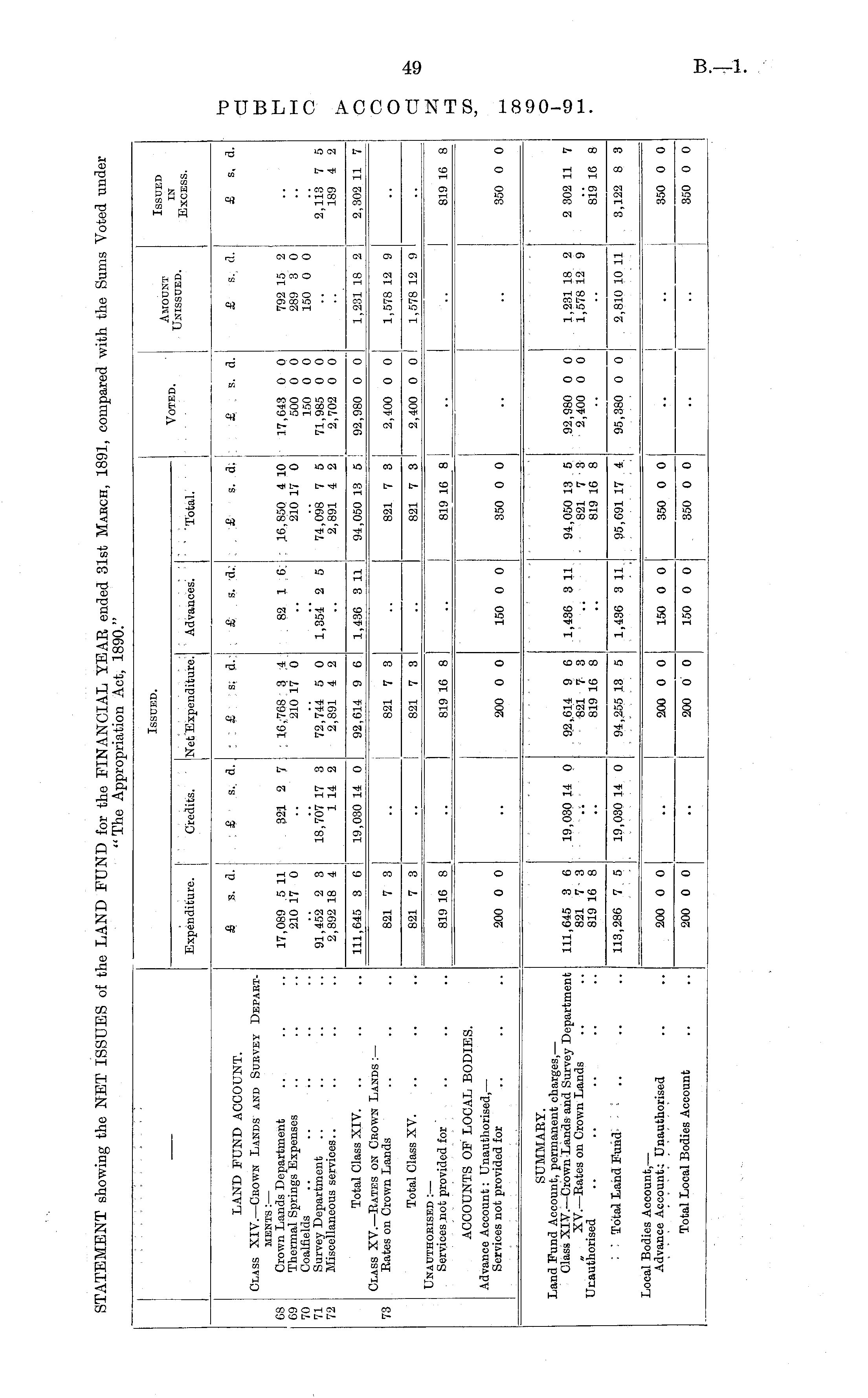 STATEMENT showing the NET ISSUES of the LAND FUND for the FINANCIAL YEAR ended 31st March, 1891, compared with the Sums Voted under "The Appropriation Act, 1890."